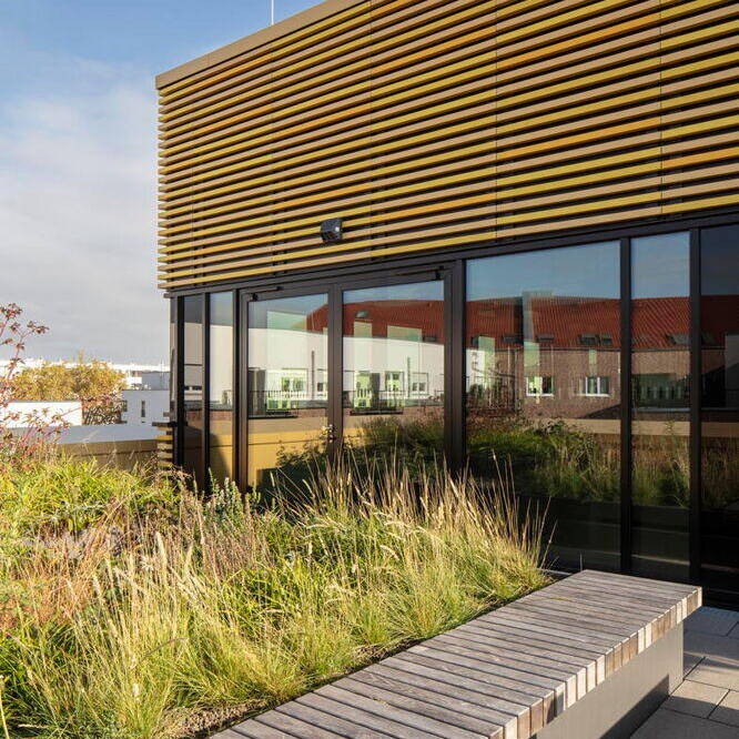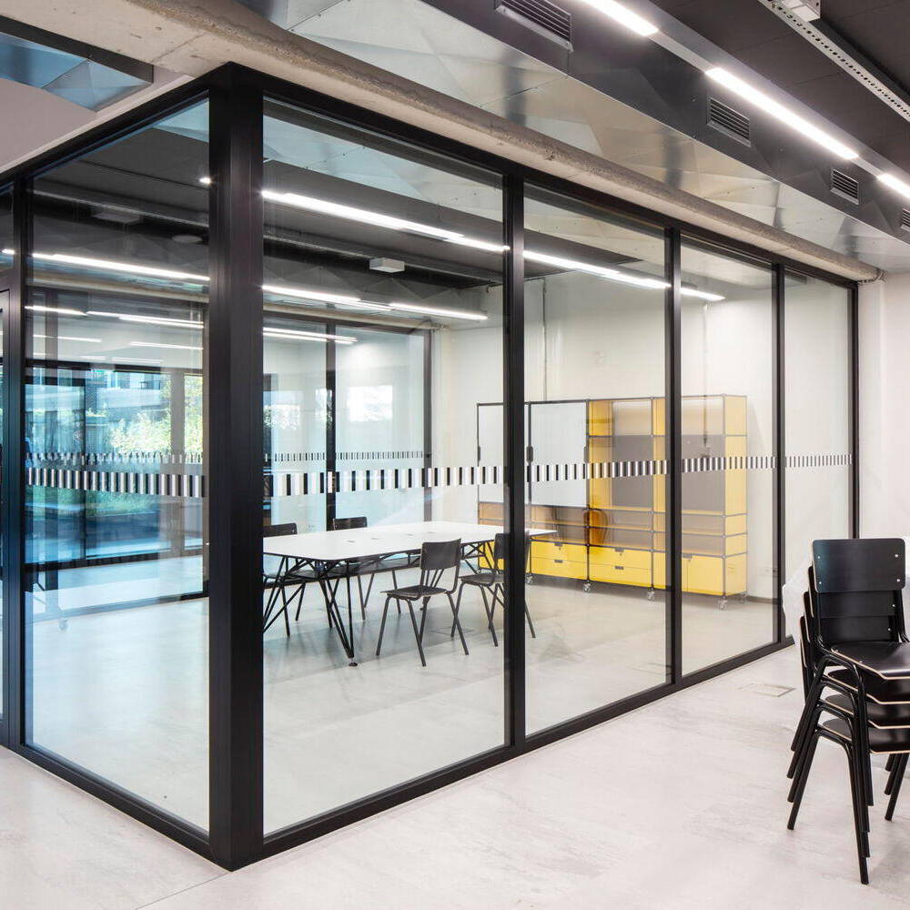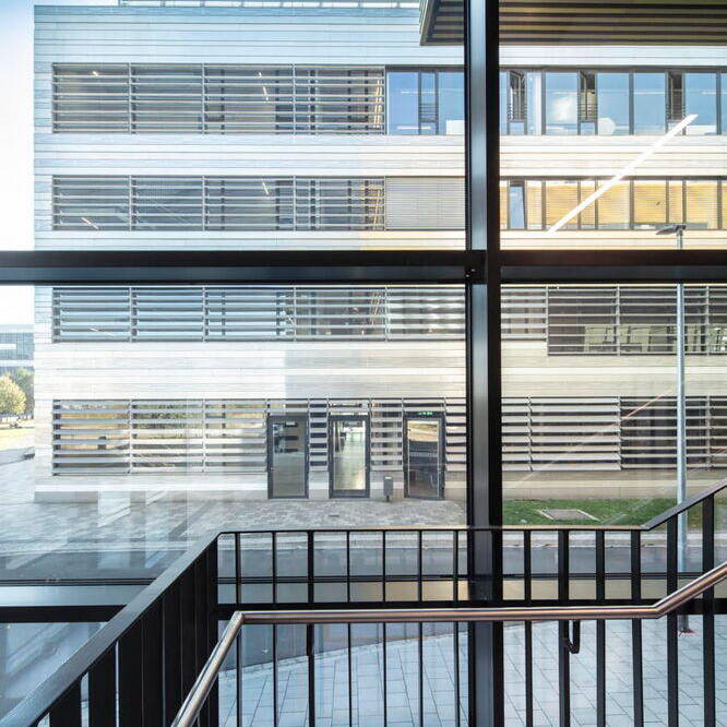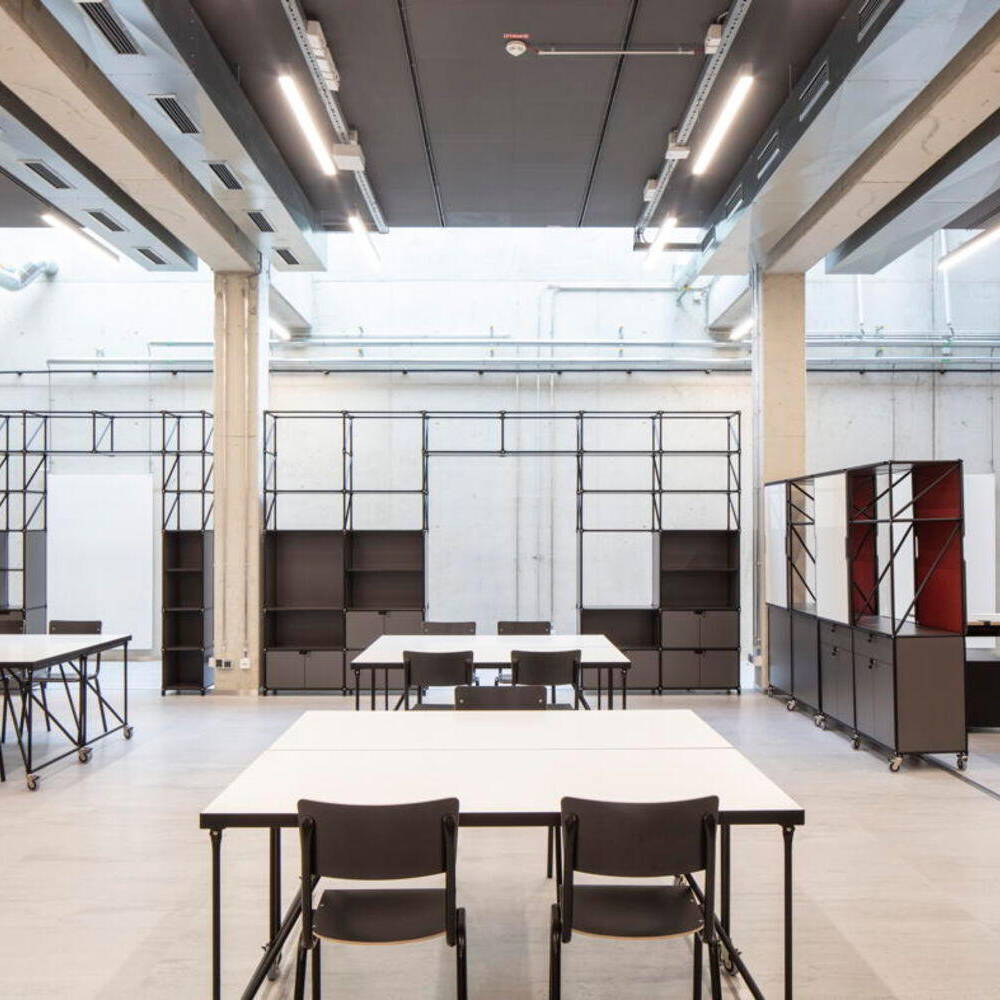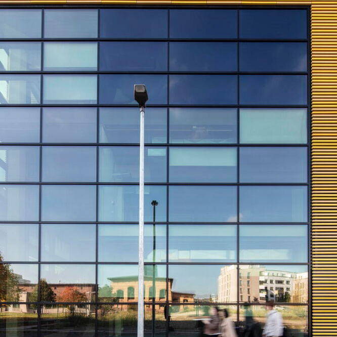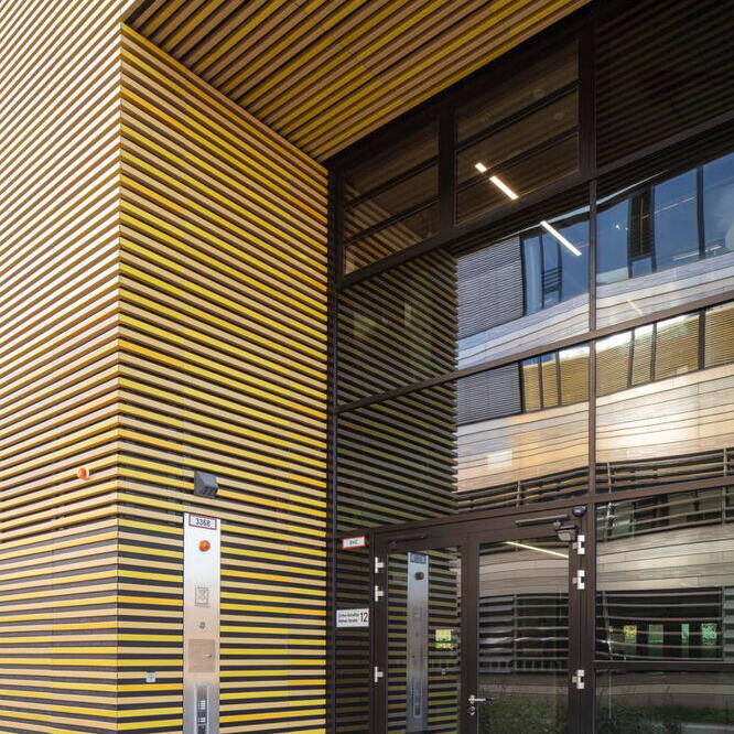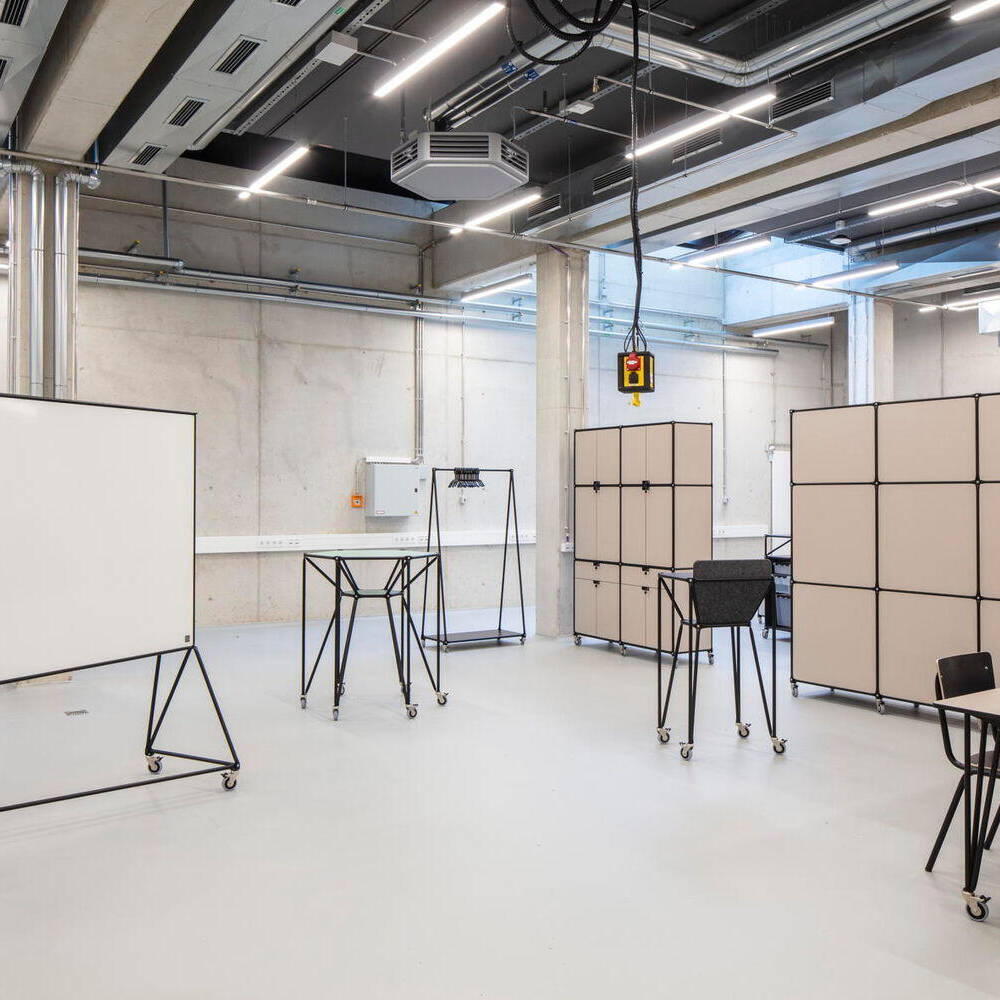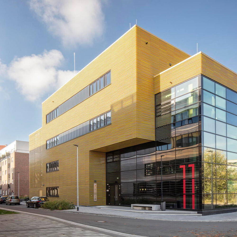 Der Baukörper des ZDD ist durch zwei ineinandergeschobene Kuben geprägt. Inklusive seines zurückspringenden Staffelgeschosses ist das Gebäude über vier Etagen angelegt, womit es sich harmonisch in den Kontext der benachbarten Hochschulgebäude einfügt. Äußerlich besticht das ZDD durch seine markante Fassade aus gelb nuancierten Keramikstäben, die Tradition und Moderne vereint. Die changierenden Elemente setzen nicht nur gestalterische Akzente, sondern verbinden das Gebäude auch harmonisch mit den umliegenden Neubauten und dem weitergenutzten historischen Bestand des Hochschulcampus. Besonders zukunftsweisend ist die elektrochrome Verglasung der Pfosten-Riegel-Fassade. Diese Technologie reguliert die Wärmedurchlässigkeit digital, abhängig von Wetter- und Standortdaten. Dadurch entfallen herkömmliche Sonnenschutzsysteme, was sowohl Wartungskosten spart als auch eine klare Sicht nach außen ermöglicht. Auf rund 3.000 m² Nutzfläche beherbergt das ZDD sowohl Labore und Werkstätten als auch multifunktionale Räume, die speziell für digitale Anwendungen konzipiert wurden. Ein Highlight ist dabei die „Smart Factory“ – eine Modellfabrik für Industrie-4.0-Anwendungen mit Leitstand, Bearbeitungsstationen und Transportrobotern. Ein weiterer Schwerpunkt liegt auf „Tracking & Immersive Technologies“. Hier ermöglicht ein Schwingboden die präzise Erfassung von Bewegungen, die über frei positionierbare Kameras digitalisiert werden können. Das Gebäude verzichtet auf starre Strukturen: Offene Flächen, mobile Wände und deckenmontierte Technik schaffen maximale Anpassungsfähigkeit. Traversen mit integrierter Technik erlauben die einfache Umgestaltung der Räume – ob für Konferenzen, Ausstellungen oder experimentelle Projekte. Selbst die Haustechnik wurde sichtbar gehalten, um schnelle Modifikationen zu ermöglichen. Mit seiner technischen Ausstattung und flexiblen Gestaltung bietet das ZDD optimale Voraussetzungen für interdisziplinäre Zusammenarbeit und innovative Lehre. Insofern ist das Gebäude dann auch ein echter Meilenstein für die Hochschule Düsseldorf und ein Symbol für den Bildungsstandort der Zukunft.