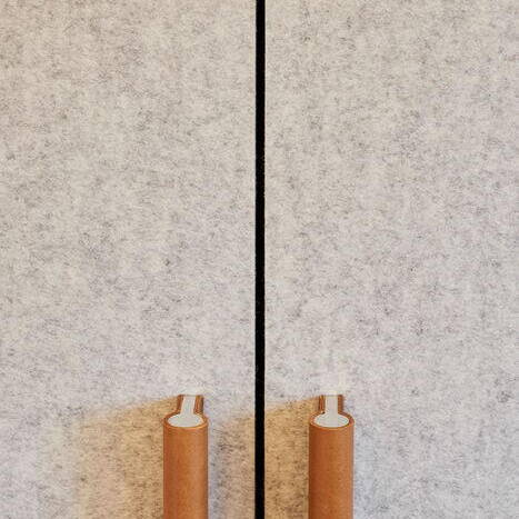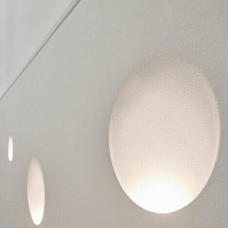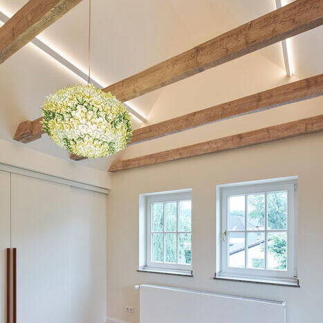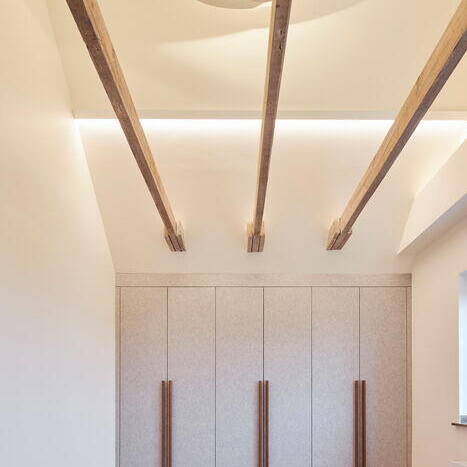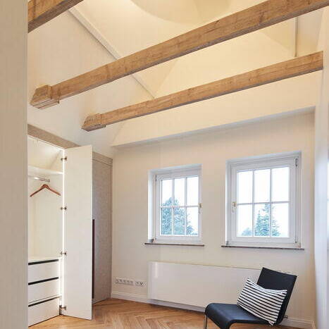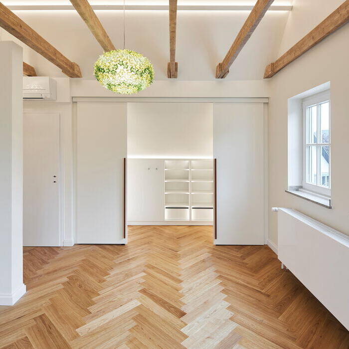 Die Wohnfläche beträgt rund 70 m², wenngleich die Grundfläche größer ist, da die Fläche in der Dachschräge liegt und zur Berechnung nur teilweise erfasst wurde. Hier sind Stauräume mit einer Tiefe von bis zu 1,4 Metern entstanden, die teils jeden Zentimeter ausnutzen. Die nunmehr sichtbaren Kehlbalken blieben aus statischen Gründen erhalten und wurden aufgearbeitet. Der Bereich darüber wurde mit unterschiedlichen Lichtsystemen ausgestattet. Dadurch kann der Raum ausgewogen und je nach Atmosphäre belichtet werden, wenn das Tageslicht nicht mehr durch die großzügigen Fensterflächen fällt. Hierfür wurden über die gesamte Länge dimmbare Lichtbänder installiert, die indirektes Licht nach oben und / oder unten abgeben können. Darüber hinaus kommen einzelne Solitärleuchten, die je nach Raum und Wunsch der Kunden installiert wurden, mal als Skulptur, mal als verspielte Leuchte oder geradlinig daher. An Atmosphäre hinzugewonnen hat auch der Treppenaufgang, der von der Öffnung zum First durch den Einfall von viel Tageslicht profitiert und durch Wandleuchten etwas an Tiefe gewonnen hat. Auf den Böden wurde Eichenparkett in Fischgrät verlegt und die dezenten Wandfarben eines hochwertigen Farbenherstellers runden das stimmige Bild ab. In dieses Ambiente fügen sich die maßgeschneiderten und von Claudia Grotegut entworfenen Wandschränke sowie ein begehbarer Kleiderschrank in der Ankleide elegant ein. Ein Kleiderschrank wurde mit Filz belegt und sorgt neben der angenehmen Haptik dafür, dass der Hall des hohen Raumes trotz des Parkettbodens gedämpft wird.