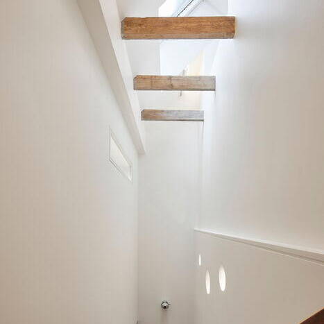 Da das Dachgeschoss bereits für eine Wohnnutzung genehmigt war, konnten bestehende Flucht- und Rettungswege genutzt werden, lediglich für die großzügige Gaube und die Öffnung zum Spitzboden musste ein Bauantrag eingereicht werden. Im Zuge der Umgestaltung wurde das Dach modernisiert und mit einer Aufdach-, Zwischensparren- und Untersparrendämmung ausgestattet. Dadurch wurde ein Wärmeschutz erzielt, der über normalen Neubauanforderungen liegt. Die neu installierte Klimaanlage wird dank einer großflächigen Photovoltaikanlage mit erneuerbarer Energie betrieben – der Sommer kann kommen!