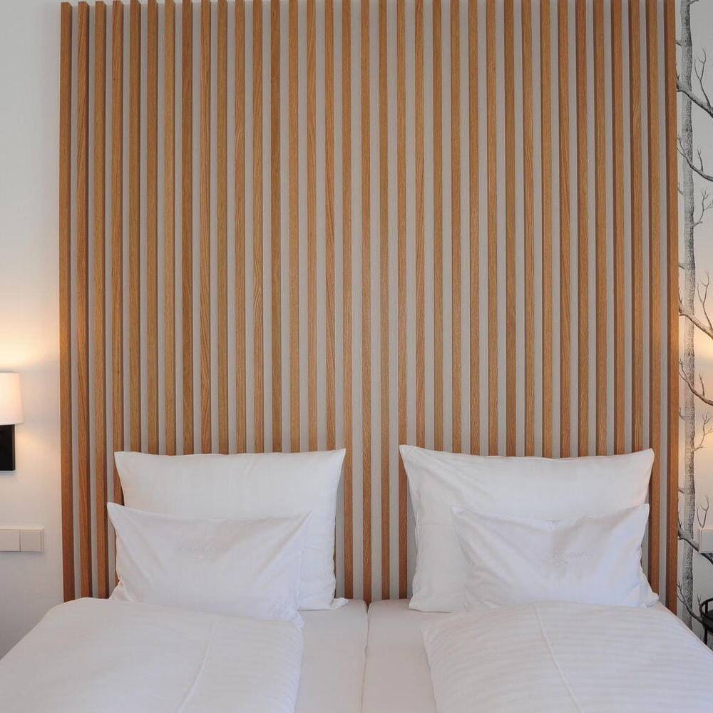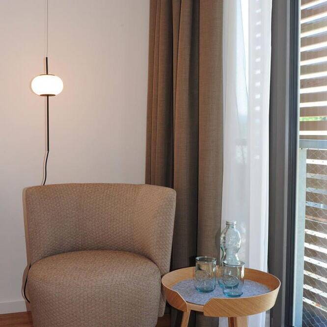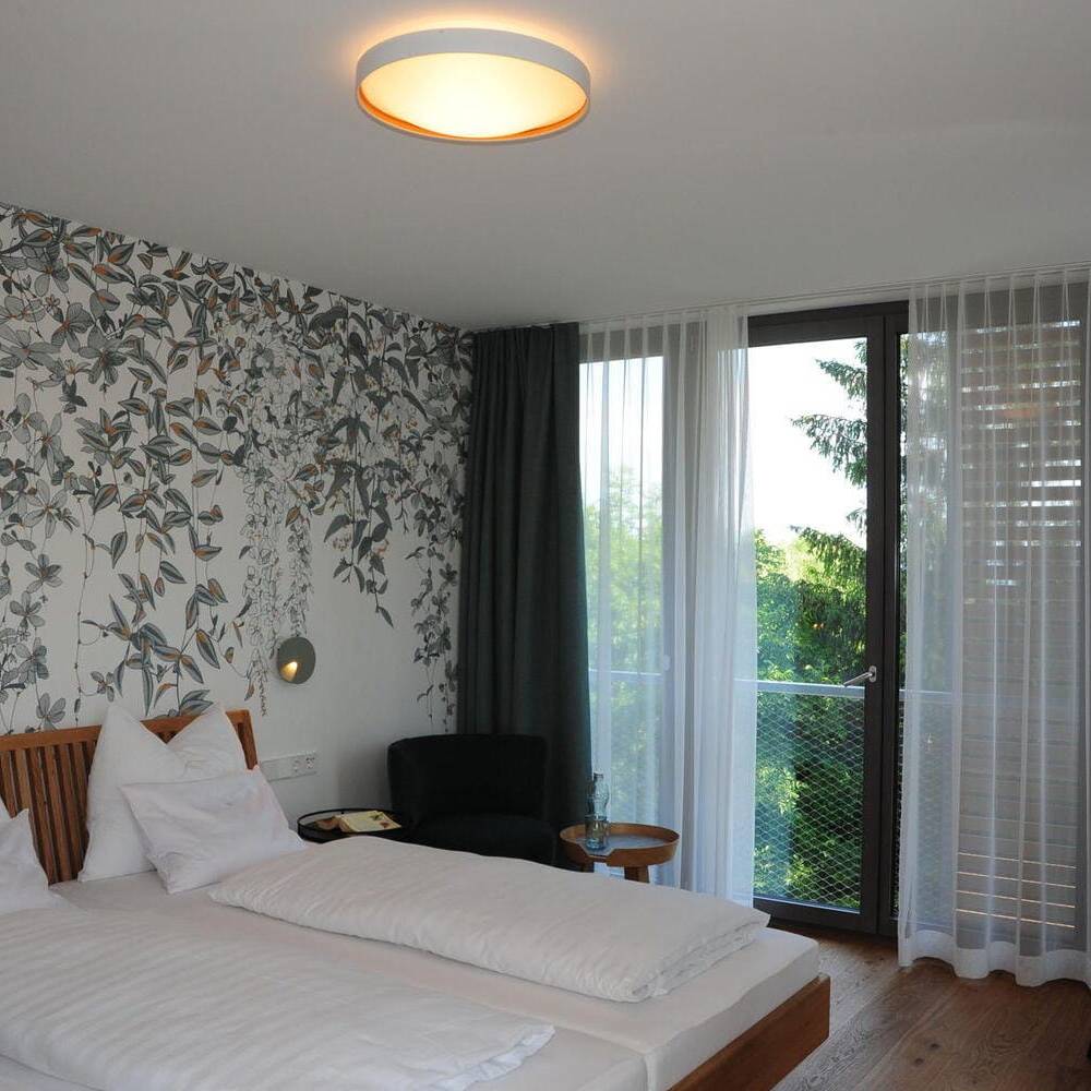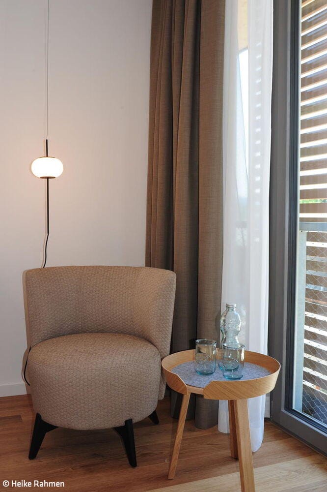 Die statische Anbindung der Aufstockung an das Bestandsgebäude, geplant durch die Architektin Gabi Davidson, erfolgte präzise: Der Übergang von den akustisch getrennten Brettstapelmodulen zu den als Holzständerwände ausgeführten Trennwänden wurde über akustisch entkoppelte Schwellen realisiert. Auf diese Weise entstand eine stabile, elegante Einheit zwischen Bestand und Aufstockung, die Sicht- und Wärmequalität optimal vereint. Ein neuer Aufzug dient als Evakuierungsaufzug. Zudem wurde die Ankunftssituation neu gestaltet, um einladende Blickbezüge vom Bodenseeradweg zu ermöglichen und den Außenbereich für Bewirtung sowie eine strukturierte Stellplatzordnung übersichtlich zu gestalten. Um die Aufstockung zu ermöglichen, musste zudem der Bestand brandschutztechnisch ertüchtigt werden, was dazu führte, dass die bestehenden Zimmer saniert wurden. Im Zuge der Aufstockung entstanden im neuen Geschoss elf neue Gästezimmer, die der Philosophie folgen: barrierefrei und nutzerorientiert. Um großzügige Räume zu ermöglichen, ragt dieser Bereich aus und verzichtet auf Balkone. „Das Ziel bei der Inneneinrichtung der neuen Zimmer war es, ein wertiges Interior zu schaffen – mit vielen Naturmaterialien im Sinne des Biohotels und einer wohltuenden Atmosphäre“, erläutert Innenarchitektin Heike Rahmen. Eingesetzt wurde eine fein abgestimmte Komposition aus Farben und Materialien, darunter Landhausdielen aus Eiche, Massivholzbetten und feine Polstermöbel. Am Eingang des Hotels entsteht die neue Rezeption mit Front- und Backoffice. Von dort aus blickt man direkt auf die Terrasse und das dazugehörige Gasthaus. Das Besondere im Planungsprozess war die enge Zusammenarbeit zwischen Architektin und Innenarchitektin sowie ein vertrauensvoller Dialog mit der Bauherrschaft.