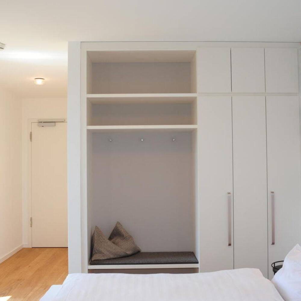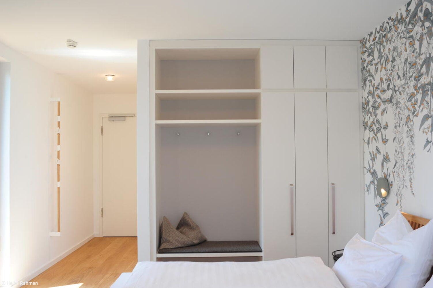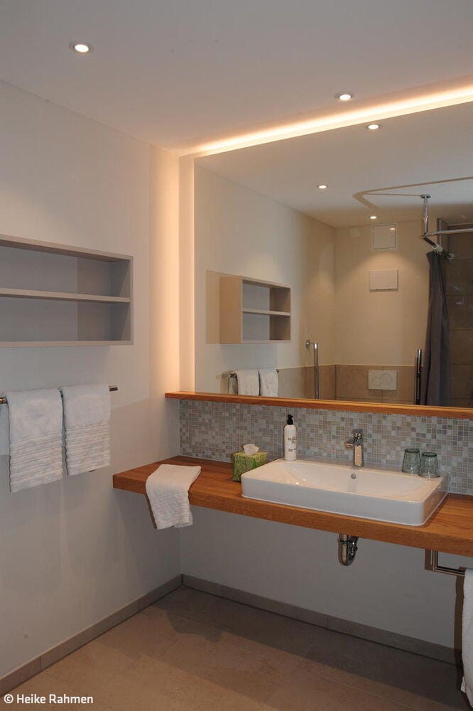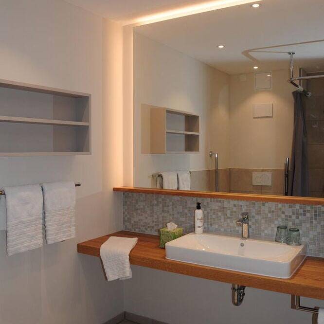 Die statische Anbindung der Aufstockung an das Bestandsgebäude, geplant durch die Architektin Gabi Davidson, erfolgte präzise: Der Übergang von den akustisch getrennten Brettstapelmodulen zu den als Holzständerwände ausgeführten Trennwänden wurde über akustisch entkoppelte Schwellen realisiert. Auf diese Weise entstand eine stabile, elegante Einheit zwischen Bestand und Aufstockung, die Sicht- und Wärmequalität optimal vereint. Ein neuer Aufzug dient als Evakuierungsaufzug. Zudem wurde die Ankunftssituation neu gestaltet, um einladende Blickbezüge vom Bodenseeradweg zu ermöglichen und den Außenbereich für Bewirtung sowie eine strukturierte Stellplatzordnung übersichtlich zu gestalten. Um die Aufstockung zu ermöglichen, musste zudem der Bestand brandschutztechnisch ertüchtigt werden, was dazu führte, dass die bestehenden Zimmer saniert wurden. Im Zuge der Aufstockung entstanden im neuen Geschoss elf neue Gästezimmer, die der Philosophie folgen: barrierefrei und nutzerorientiert. Um großzügige Räume zu ermöglichen, ragt dieser Bereich aus und verzichtet auf Balkone. „Das Ziel bei der Inneneinrichtung der neuen Zimmer war es, ein wertiges Interior zu schaffen – mit vielen Naturmaterialien im Sinne des Biohotels und einer wohltuenden Atmosphäre“, erläutert Innenarchitektin Heike Rahmen. Eingesetzt wurde eine fein abgestimmte Komposition aus Farben und Materialien, darunter Landhausdielen aus Eiche, Massivholzbetten und feine Polstermöbel. Am Eingang des Hotels entsteht die neue Rezeption mit Front- und Backoffice. Von dort aus blickt man direkt auf die Terrasse und das dazugehörige Gasthaus. Das Besondere im Planungsprozess war die enge Zusammenarbeit zwischen Architektin und Innenarchitektin sowie ein vertrauensvoller Dialog mit der Bauherrschaft.
