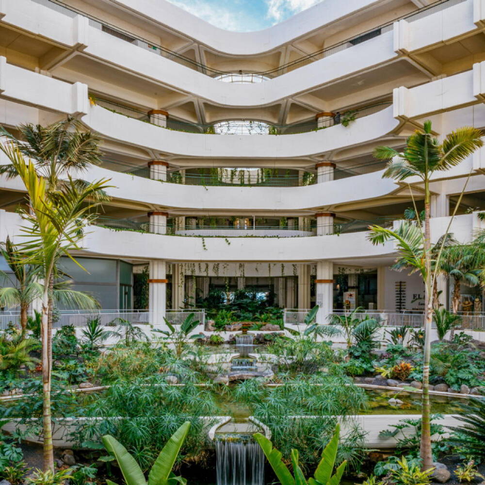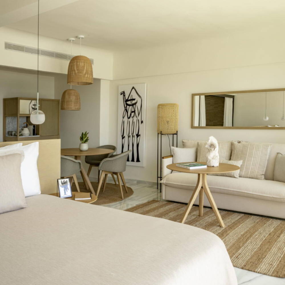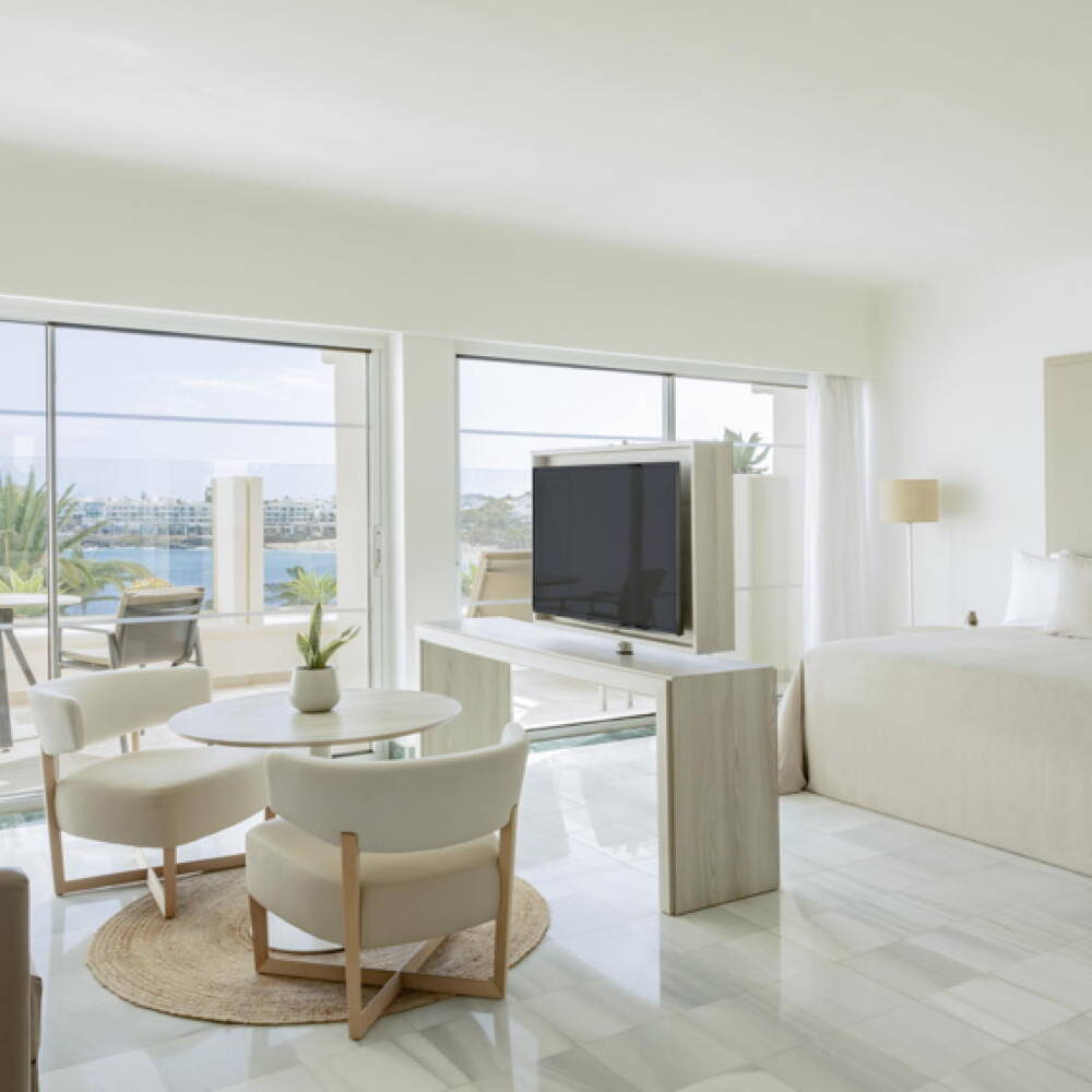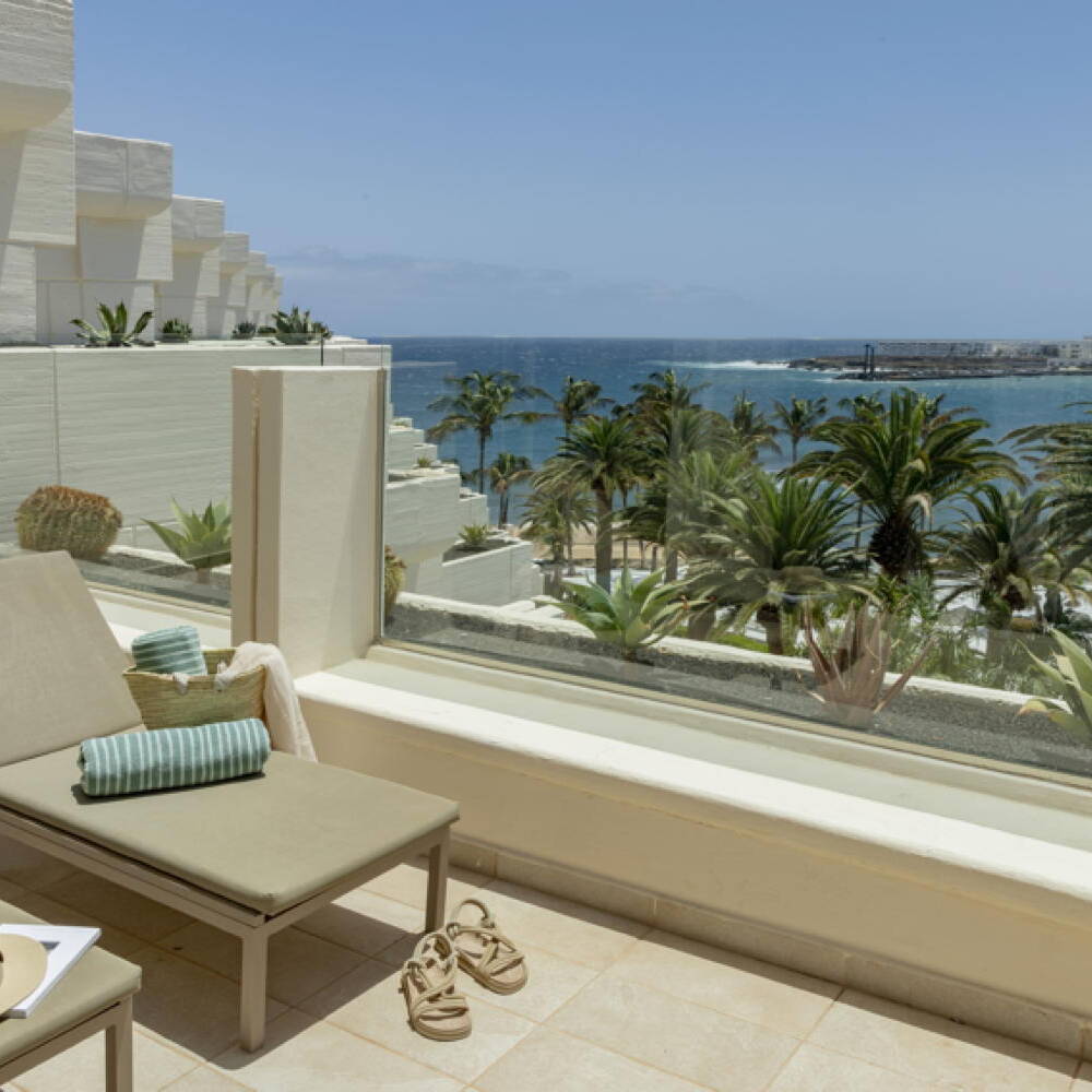 Nach einer vollständigen Renovierung und Neugestaltung der Räumlichkeiten ist es heute ein luxuriöses Fünf-Sterne-Hotel nur für Erwachsene mit direktem Zugang zum Strand, Spa, Fitnessstudio, Tagungsräumen, Außenpool, Tennisplatz, Zimmern und Suiten und sieben verschiedenen Restaurants. Statt Betongrau strahlt die terrassierte, Y-förmig angelegte Anlage in reinem Weiß, das hochwertige Interior-Design stammt vom Studio ASAH – Álvaro Sans Arquitectura Hotelera. Die Zimmer und Suiten präsentieren sich zurückhaltend in minimalistischem Luxus: Designer-Möbel in hellem Holz, Naturstein und Leinen sowie modern gestaltete Bäder prägen das Interior – das mit dem Blick auf die umgebende Landschaft zu einem stimmigen Ganzen vereint. Quiet Luxury ist wohl der treffendste Ausdruck für das Konzept von Álvaro Sans, dessen persönliche Freundschaft mit dem verstorbenen César Manrique hier und auch auf den Gemeinschaftsflächen im Haus zum Ausdruck kommt. Schon beim Betreten des Hauses zeigt sich das „Museums-Gefühl“: Über dem hellen Marmorboden thront eine Original-Decke aus den 1970ern, die an einen riesigen Eierkarton erinnert –Brutalismus par excellence. Für Architektur-Aficionados gibt es im ganzen Haus noch sehr viel mehr zu entdecken: Originale Murals von César Manrique, das Treppenhaus aus den 1970ern, die geschwungenen weißen Freitreppen und die mit üppiger tropischer Vegetation bewachsenen Innenatrien. Wasserfälle und Gehwege verbinden die Innenhöfe miteinander, sodass Gäste die Flora und Fauna aus nächster Nähe genießen können. Auch der von Manrique entworfene große Pool ist sehr besonders: eine Meerwasser-Lagune aus strahlend weißem Stein, umgeben von dunklem Basalt, üppiger Bepflanzung und den bereits erwähnten Vulkanstein-Poolduschen.
