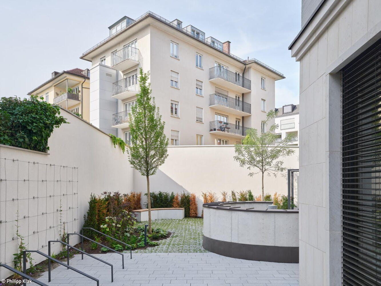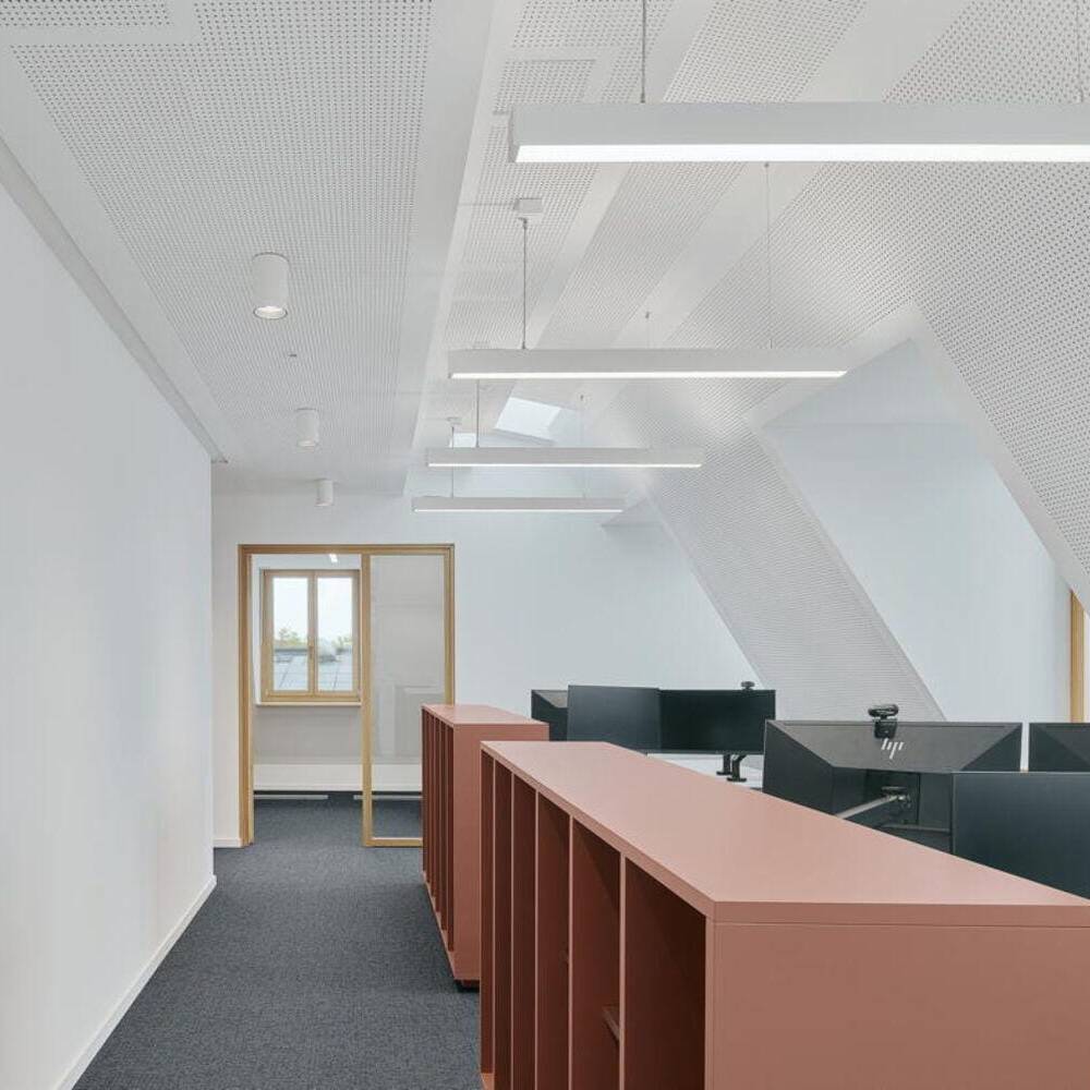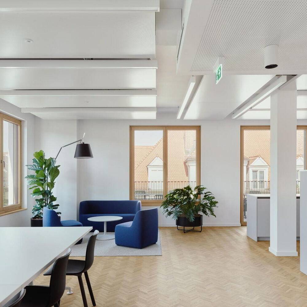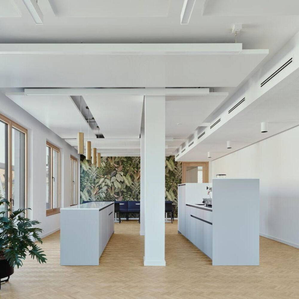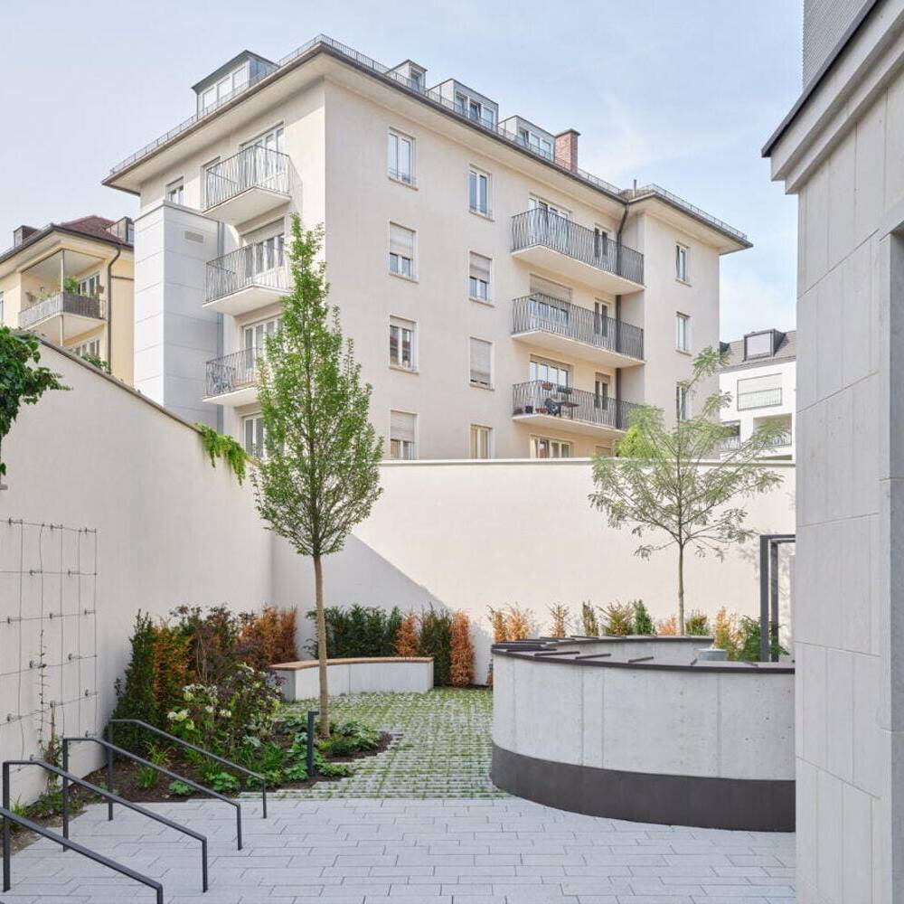 Bei den Materialien dominieren langlebige, zurückhaltend gestaltete Oberflächen: Mineralischer Werkstein in den Küchen sowie Holz-Aluminium-Fensterelemente mit tiefen Laibungen prägen das Interior. Balkone auf allen Etagen sowie zwei Dachterrassen im obersten Geschoss erweitern die Büroräume nach außen. Ein begehbarer Garten auf der Rückseite des Gebäudes, gestaltet von kübertlandschaftsarchitektur, bietet den Mitarbeitenden einen grünen Ruheraum. Den Architekten gelang es, das Gebäude in seiner zurückhaltenden, eleganten Erscheinungsform stimmig in das gewachsene Ensemble einzufügen.