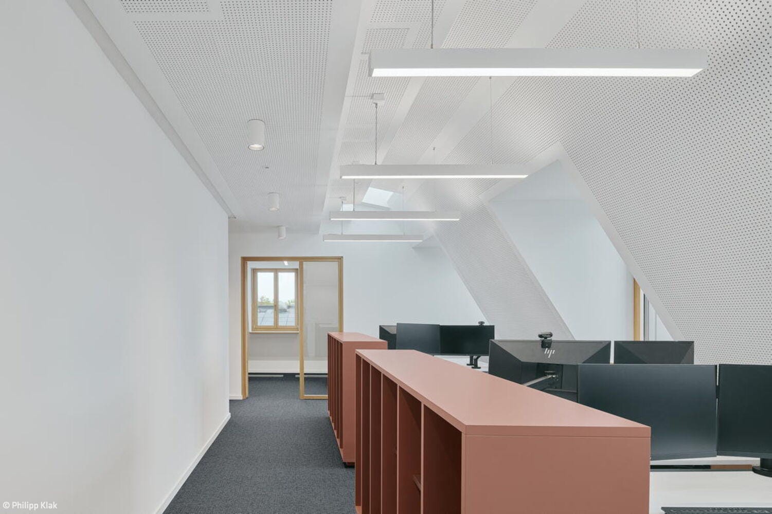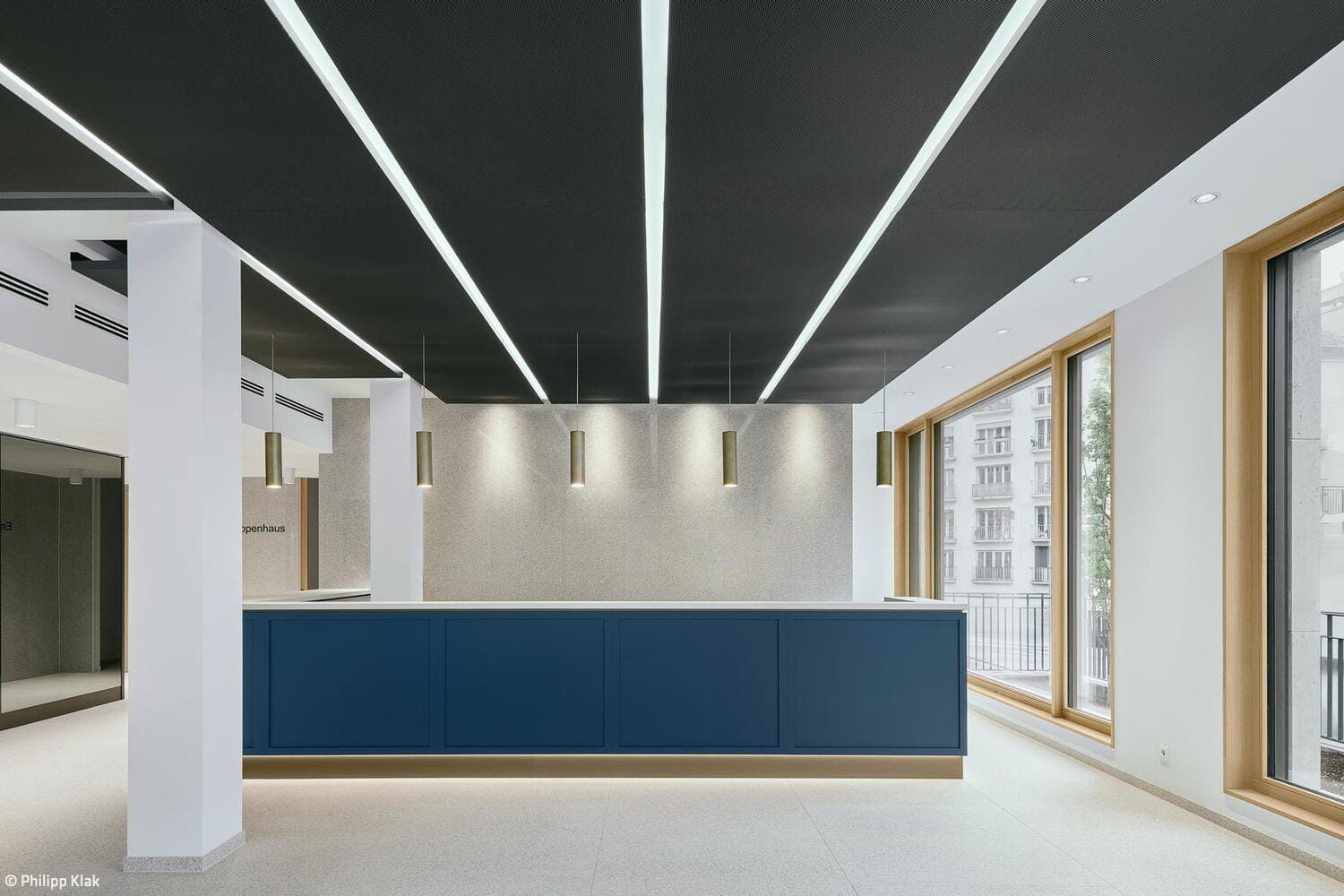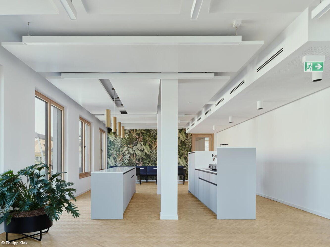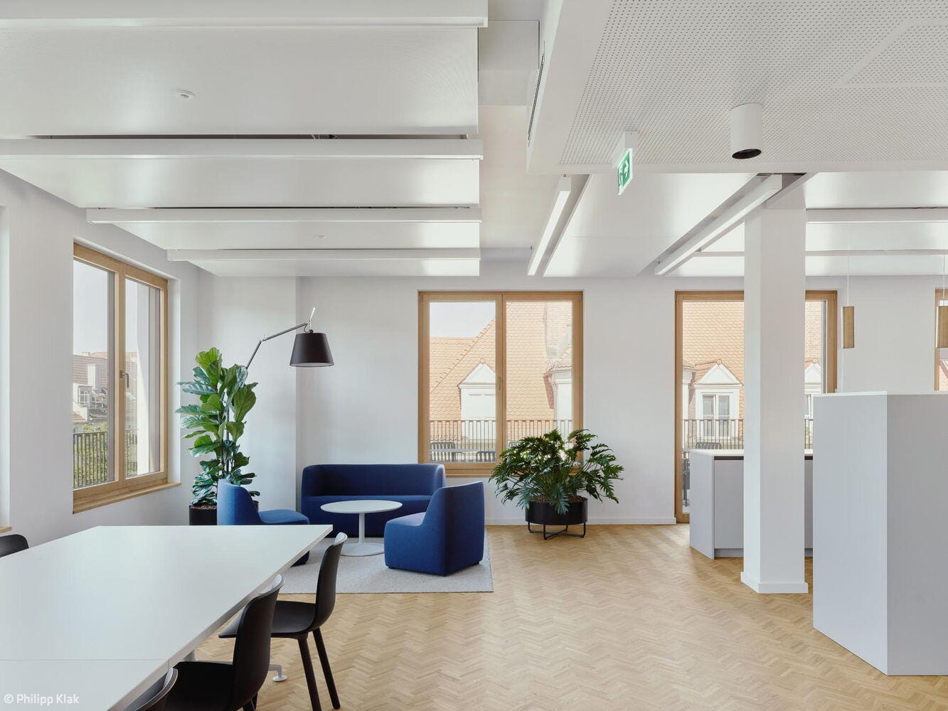 Bei den Materialien dominieren langlebige, zurückhaltend gestaltete Oberflächen: Mineralischer Werkstein in den Küchen sowie Holz-Aluminium-Fensterelemente mit tiefen Laibungen prägen das Interior. Balkone auf allen Etagen sowie zwei Dachterrassen im obersten Geschoss erweitern die Büroräume nach außen. Ein begehbarer Garten auf der Rückseite des Gebäudes, gestaltet von kübertlandschaftsarchitektur, bietet den Mitarbeitenden einen grünen Ruheraum. Den Architekten gelang es, das Gebäude in seiner zurückhaltenden, eleganten Erscheinungsform stimmig in das gewachsene Ensemble einzufügen.