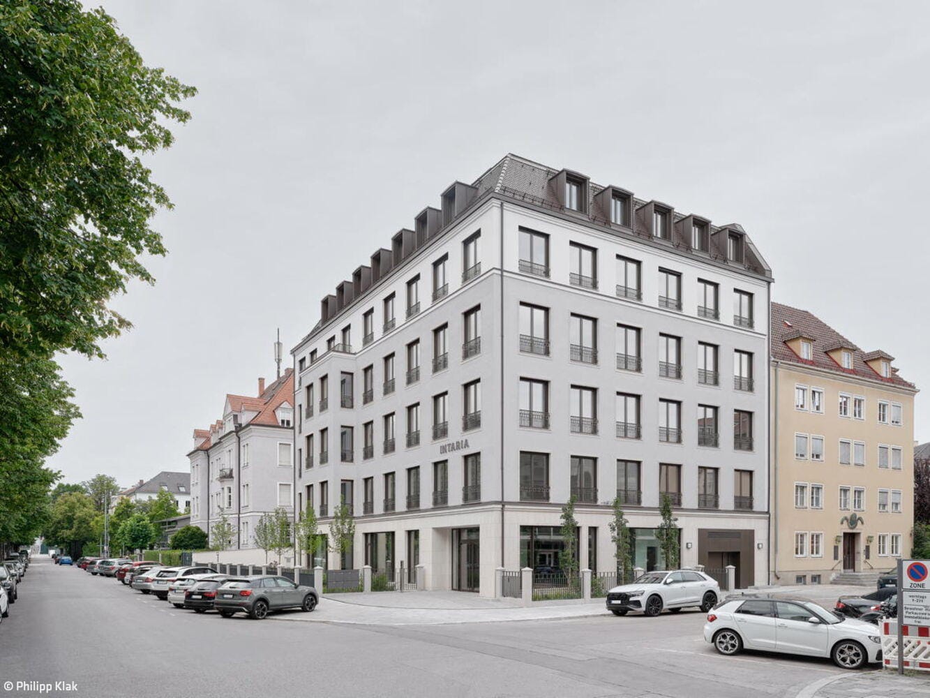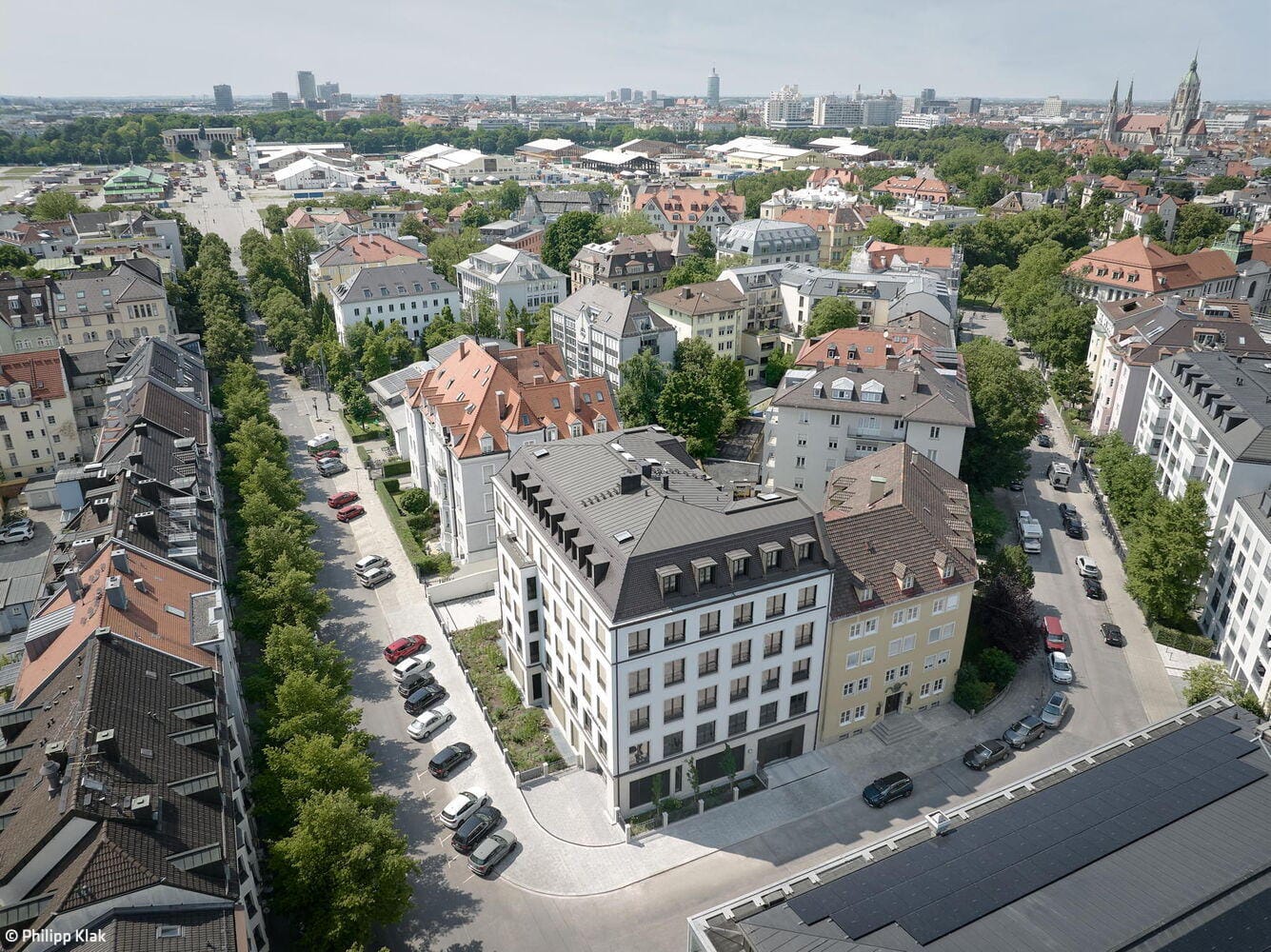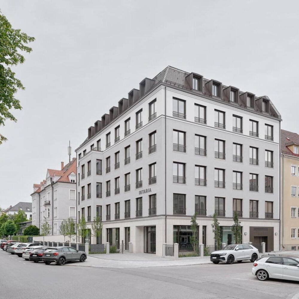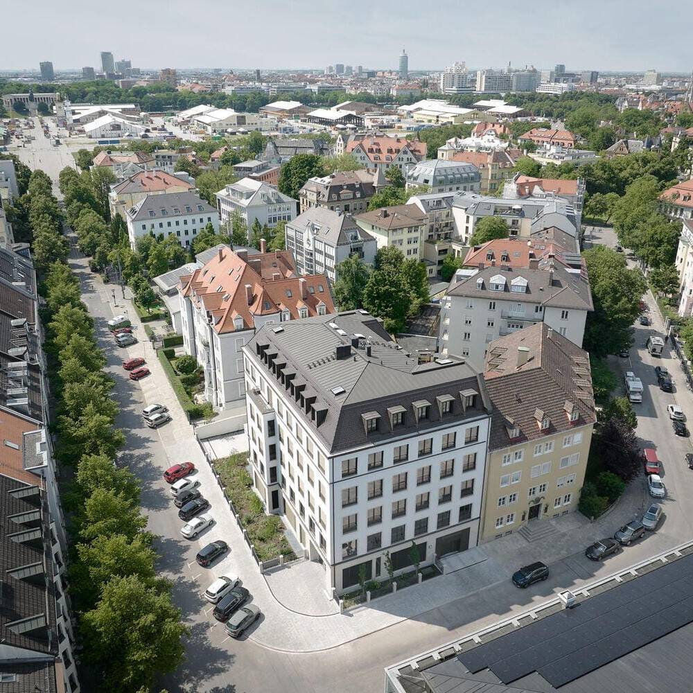 Mitten im Geschehen – zumindest während der „5. Jahreszeit“ – steht ein neues Bürogebäude nahe der Theresienwiese. Der Standort blickt auf eine längere Geschichte zurück: In den frühen 1950er-Jahren entstand hier ein Wohnhaus des Architekten Ernst Barth. Bis vor wenigen Jahren bewährte es sich als Hostel mit Café im Erdgeschoss und war bei Backpackern aus aller Welt beliebt. Typisch für die Nachkriegsmoderne in München, fügte sich das Haus städtebaulich in das Ensemble zwischen Goetheplatz und Theresienwiese ein. Geblieben ist die prominente Nachbarschaft: Das Kinogebäude „Royal“, das Sep Ruf und Hein Goldstein 1954 entworfen hatten, und das schräg gegenüberliegende Eckgebäude von Robert Vorhoelzer, Walther Schmidt und Franz Holzhammer im Stil der Neuen Sachlichkeit – heute noch als Postamt und Wohnhaus genutzt. Hostel und Café wichen. Der Abriss löste in der lokalen Architekturszene und bei Anwohnenden Diskussionen aus, galt das Bauwerk doch als Teil des städtebaulichen Erbes.