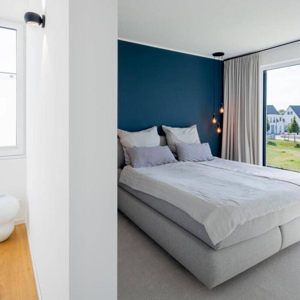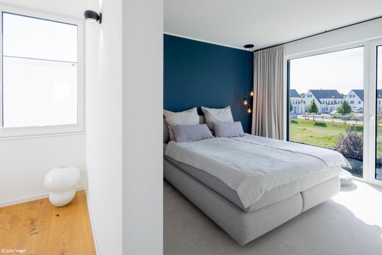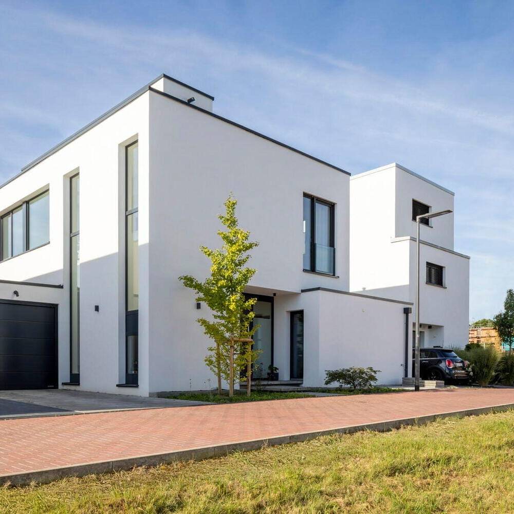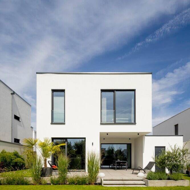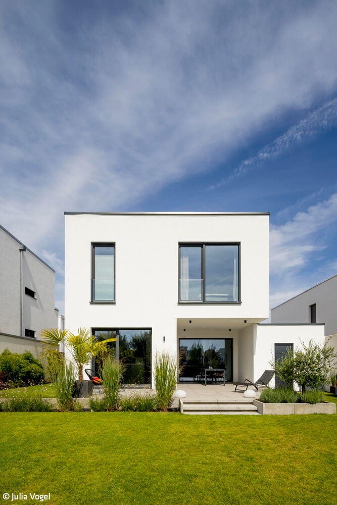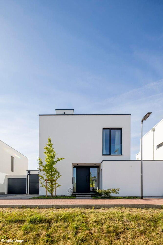 Seit Jahrhunderten bildet Huckingen die Schnittstelle zwischen Duisburg und Düsseldorf. Auch wenn der Stadtteil seit 1929 zu Duisburg gehört, schätzen die Huckinger bis heute die doppelte Anbindung und das Angebot zweier Städte vor der Haustür. Seit einigen Jahren entsteht hier das neue Wohngebiet „Am alten Angerbach“ mit rund 235 Doppel- und freistehenden Einfamilienhäusern, einer Kita sowie prägenden Grün- und Freiräumen. Ricardo Ferreira | Architektur und Design Studio aus Meerbusch planten zwei Einfamilienhäuser für die Neubau-Siedlung: Das erste ist ein kompakter Kubus, der auf seinen beiden Wohnetagen ein vielfältiges Programm bietet, wobei vor allem der Wohnbereich durch seine weitläufigen Innen-Außen-Bezüge besticht.