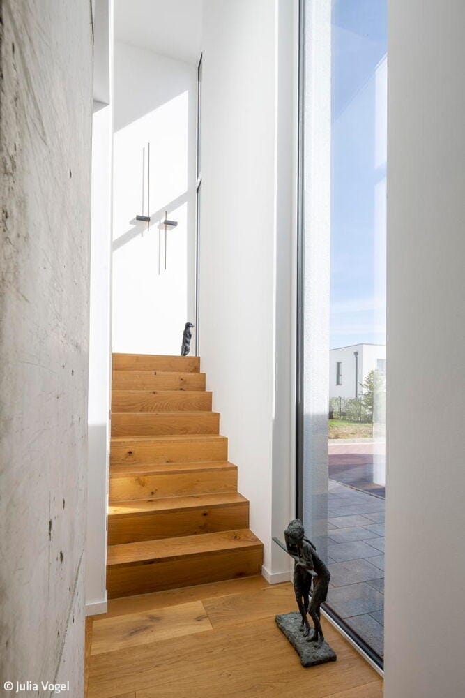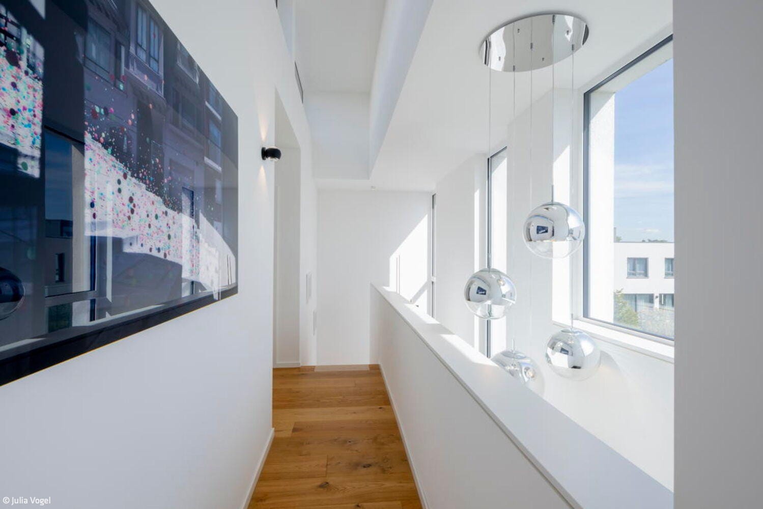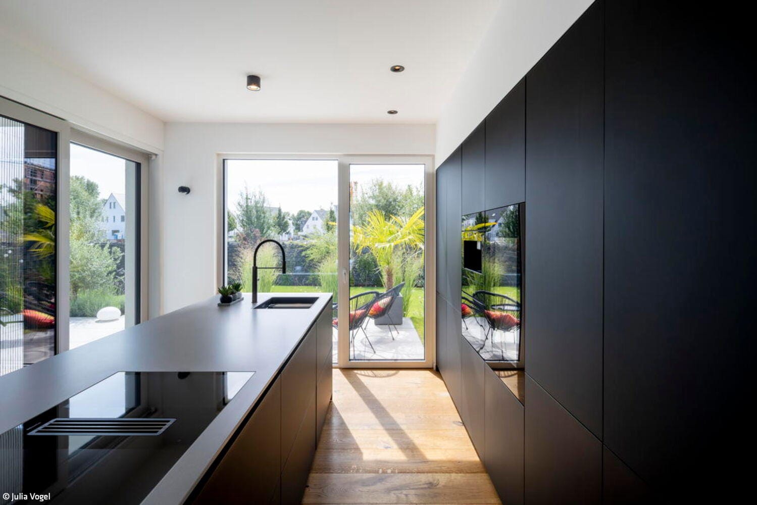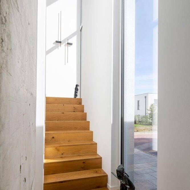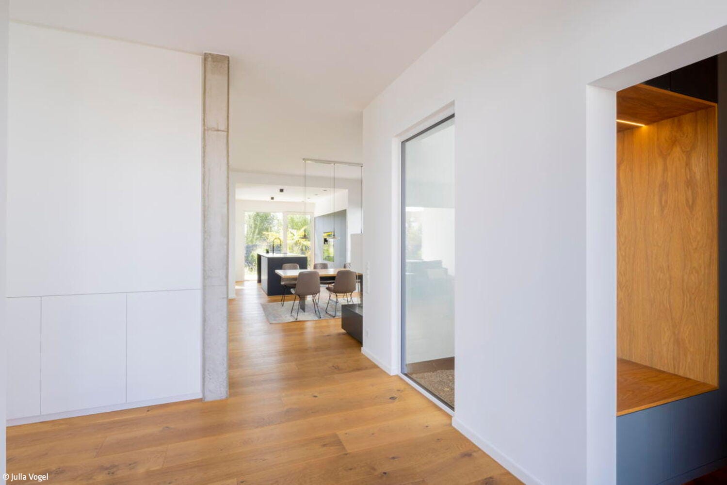 Das Bauherrenpaar mit Hund hatte sich sein eigenes Traumhaus, in Nähe von Natur und Grün, gewünscht. Auf dem schmalen Grundstück, das laut B-Plan maximal zweigeschossig und mit abschließendem Flachdach bebaut werden sollte, entstand ein kubischer Baukörper, der sich durch seitlich angefügte, eingeschossige Bauteile zu einer plastischen Komposition entwickelt. Neben der als Grenzbebauung errichteten Garage beherbergt straßenseitig ein kleiner Annex Garderobe, Gäste-WC und Technikraum. Vom überdachten Eingang aus gelangt man in ein breites Entrée, das den Zugang zur belichteten Garderobe ermöglicht und zum westlich orientierten Treppenhaus führt. Letzteres wird durch die beiden etagenübergreifenden vertikalen Fenster und ein liegendes Fensterformat sehr intensiv vom wechselnden Tageslicht durchströmt – aber auch nach Osten wurde ein zusätzliches Oberlichtband integriert, das die Morgensonne einfängt. Vom Entrée aus ergeben sich Sichtbezüge in den Wohnraum und den Garten, aber auch zu einem kleinen Patio, der zwischen den Baukörpern seinen Platz gefunden hat. Der an das Entrée anschließende Wohnbereich umfasst eine Sitzgruppe mit Medienboard, wobei durch die Verlängerung des Treppen-Luftraums eine kommunikative Verbindung zum Obergeschoss hergestellt wird. Parallel zum Wohnbereich entfaltet sich der Essbereich – über breite Schiebe-Fensterfronten öffnen sich beide Zonen fließend auf zwei Außenterrassen und schaffen fließende Übergänge zwischen Innen und Außen. Neben dem weitläufigen Ausblick in den Garten ergeben sich Sichtbezüge zum transparent gehaltenen Gaskamin, der zugleich eine kleine Sitzbank als Rückzugsnische abschirmt. Die Küche befindet sich schließlich dem Garten am nächsten: Durch zwei  raumhohe Fensterfronten über Eck belichtet, liegt sie leicht separiert, aber in direkter Nähe zum Essbereich, ist aber auch vom überdachten Freisitz ebenso gut erreichbar. Gerade in Sommermonaten, wenn auf der Terrasse gegrillt und gegessen wird, ein wichtiges Feature. Während das teilunterkellerte Gebäude im Untergeschoss nur einen großen zentralen Stauraum aufnimmt, ist das Obergeschoss durch eine konsequente Zweiteilung geprägt: Ausgehend von einer Galerie entfaltet sich auf der straßenseitigen Haushälfte der Kindertrakt – mit zwei Kinderzimmern und einem dazwischen geschalteten Kinder-Duschbad. Der gartenseitig orientierte Elterntrakt nimmt neben dem Schlafzimmer das Masterbad mit Sauna und ein dazwischen geschaltetes Ankleidezimmer auf. Außerdem wurde auch noch ein kleiner Arbeitsbereich für das Homeoffice integriert. Alle Zonen werden dabei natürlich belichtet. Ästhetisch wird das Interior durch die überwiegend weiß verputzten Wände geprägt, die mit einem warmen Eichenholzparkett, punktuell aber auch durch schwarze Holzoberflächen des Einbaumobiliars kontrastiert werden. Energetisch profitiert das Haus durch einen Anschluss an das lokale Fernwärmenetz.