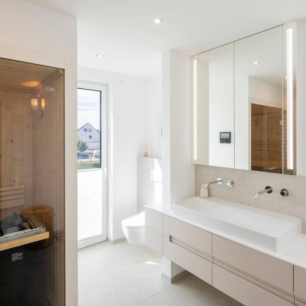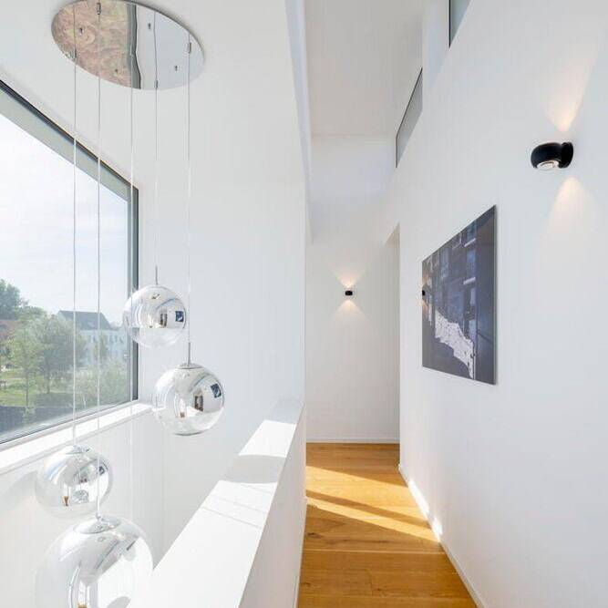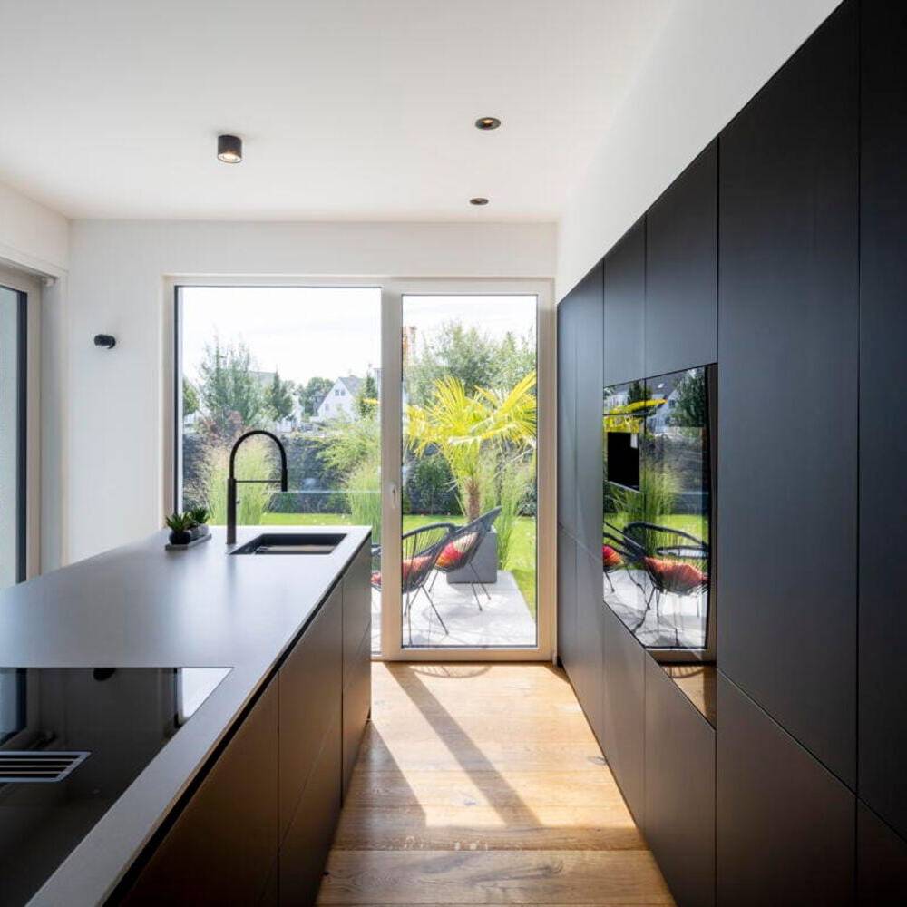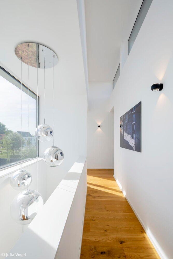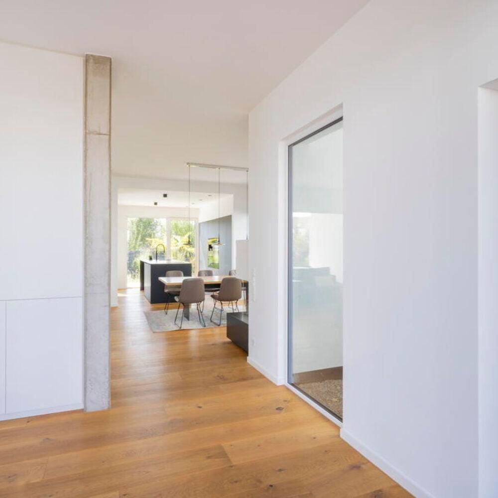 Das Bauherrenpaar mit Hund hatte sich sein eigenes Traumhaus, in Nähe von Natur und Grün, gewünscht. Auf dem schmalen Grundstück, das laut B-Plan maximal zweigeschossig und mit abschließendem Flachdach bebaut werden sollte, entstand ein kubischer Baukörper, der sich durch seitlich angefügte, eingeschossige Bauteile zu einer plastischen Komposition entwickelt. Neben der als Grenzbebauung errichteten Garage beherbergt straßenseitig ein kleiner Annex Garderobe, Gäste-WC und Technikraum. Vom überdachten Eingang aus gelangt man in ein breites Entrée, das den Zugang zur belichteten Garderobe ermöglicht und zum westlich orientierten Treppenhaus führt. Letzteres wird durch die beiden etagenübergreifenden vertikalen Fenster und ein liegendes Fensterformat sehr intensiv vom wechselnden Tageslicht durchströmt – aber auch nach Osten wurde ein zusätzliches Oberlichtband integriert, das die Morgensonne einfängt. Vom Entrée aus ergeben sich Sichtbezüge in den Wohnraum und den Garten, aber auch zu einem kleinen Patio, der zwischen den Baukörpern seinen Platz gefunden hat. Der an das Entrée anschließende Wohnbereich umfasst eine Sitzgruppe mit Medienboard, wobei durch die Verlängerung des Treppen-Luftraums eine kommunikative Verbindung zum Obergeschoss hergestellt wird. Parallel zum Wohnbereich entfaltet sich der Essbereich – über breite Schiebe-Fensterfronten öffnen sich beide Zonen fließend auf zwei Außenterrassen und schaffen fließende Übergänge zwischen Innen und Außen. Neben dem weitläufigen Ausblick in den Garten ergeben sich Sichtbezüge zum transparent gehaltenen Gaskamin, der zugleich eine kleine Sitzbank als Rückzugsnische abschirmt. Die Küche befindet sich schließlich dem Garten am nächsten: Durch zwei  raumhohe Fensterfronten über Eck belichtet, liegt sie leicht separiert, aber in direkter Nähe zum Essbereich, ist aber auch vom überdachten Freisitz ebenso gut erreichbar. Gerade in Sommermonaten, wenn auf der Terrasse gegrillt und gegessen wird, ein wichtiges Feature. Während das teilunterkellerte Gebäude im Untergeschoss nur einen großen zentralen Stauraum aufnimmt, ist das Obergeschoss durch eine konsequente Zweiteilung geprägt: Ausgehend von einer Galerie entfaltet sich auf der straßenseitigen Haushälfte der Kindertrakt – mit zwei Kinderzimmern und einem dazwischen geschalteten Kinder-Duschbad. Der gartenseitig orientierte Elterntrakt nimmt neben dem Schlafzimmer das Masterbad mit Sauna und ein dazwischen geschaltetes Ankleidezimmer auf. Außerdem wurde auch noch ein kleiner Arbeitsbereich für das Homeoffice integriert. Alle Zonen werden dabei natürlich belichtet. Ästhetisch wird das Interior durch die überwiegend weiß verputzten Wände geprägt, die mit einem warmen Eichenholzparkett, punktuell aber auch durch schwarze Holzoberflächen des Einbaumobiliars kontrastiert werden. Energetisch profitiert das Haus durch einen Anschluss an das lokale Fernwärmenetz.