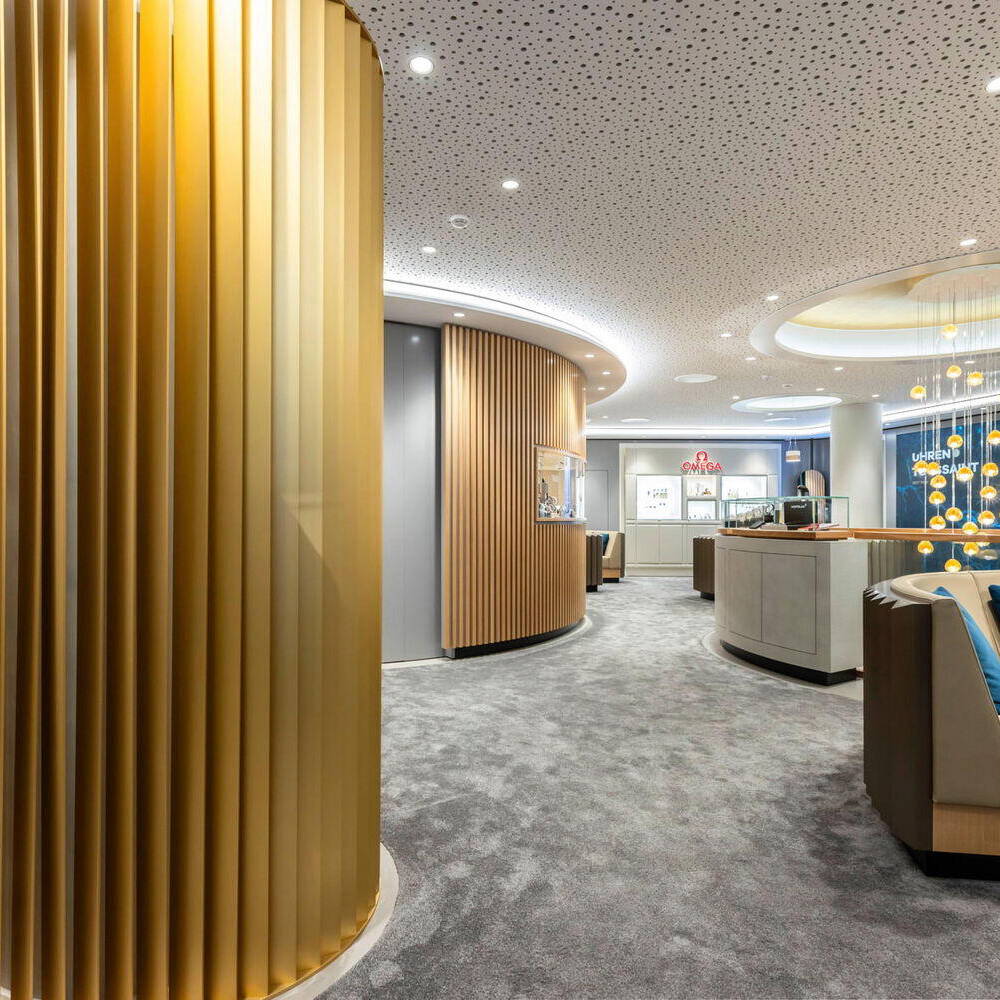 Das zentrale Element des Interiors, das bei einer Verdoppelung der Fläche mehr räumliche Weite bietet, stellt die Uhrenkrone dar. Die Form dieser kleinen, seitlich am Uhrengehäuse befestigten „Schraube“ findet sich auch in der Innenarchitektur des neuen Stores wieder. So greifen die Begrüßungs- und Empfangstheke, die Beratungsbereiche und die Deckenbeleuchtung die runde Form des Ziffernblatts einer Uhr sowie den kannelierten Umriss der Uhrenkrone auf. Kreisförmige Sitzgruppen ermöglichen Kund:innen, die nicht alleine, sondern mit Partner:innen oder Freund:innen kommen, sich in der „Uhrenkrone“ über das Thema Uhren auszutauschen. Gingen die Kernzeiten in den ehemaligen Räumlichkeiten mit einer akustischen Belastung einher, so kreieren am neuen Standort eine Akustikdecke und ein langfloriger Teppich eine klare, brillante Raumakustik. Eine Lamellenstruktur in den Rückwänden mit eingebauten Schallbrechern sowie textile Elemente ermöglichen an den Beratungstischen auch bei hohem Kundenaufkommen ein sehr gutes Hörverstehen und somit ein hohes Maß an Vetraulichkeit. Beim Farbkonzept spielten Metalle eine elementare Rolle. Bei diesem wurde jedoch weniger auf kühlen Aluminiumlook, sondern warme Gold- und Kupfertöne gesetzt. Um das Interior nicht mit Materialitäten zu überfrachten und die metallischen Flächen wirken zu lassen, wurden moderne Materialien und Nichtfarben eingesetzt: Die Raumdecke präsentiert sich effektvoll mit einem silbrigen Sternenhimmel auf weißem Untergund, die Böden sind mit einem grauem Teppichbelag ausgelegt. Stimmig dazu ist der Fries der Mittelinsel, deren kreisförmige Öffnung Einblicke ins Untergeschoss erlaubt, in Sichtbeton ausgeführt. Um die Aspekte des Wohlfühlens und der Haptik nach vorne zu bringen, wurden Holzlemente eingesetzt: bei den Handläufen der Mittelinsel, den Vitrinenunterseiten, der Rückwand und dem Thekenaufsatz. Die Neugestaltung der Gebäudefassade rundet das Gesamtkonzept ab: Zuvor als glasierte Klinkerfassade ausgebildet, präsentieren sich die Räume zwischen den Fenstern, die mit Faschen versehen wurden, in der der gleichen Materialität wie die Einfassungen rechts und links des Ladenlokals. Auf diese Weise ist es gelungen, das Untergeschoss mit den Obergeschossen gestalterisch in Einklang zu bringen und somit einen Bezug zwischen diesen herzustellen.