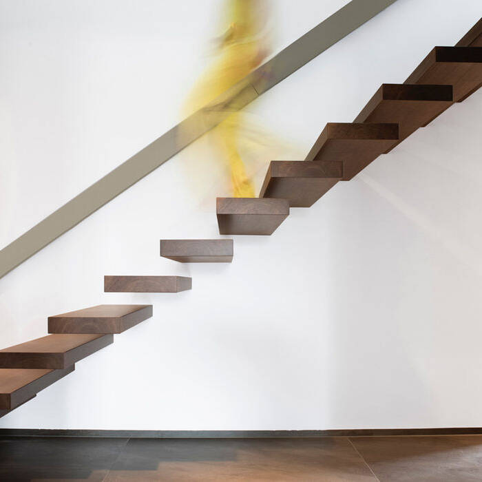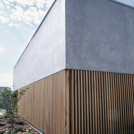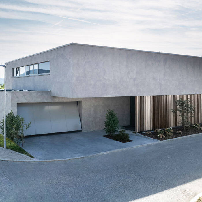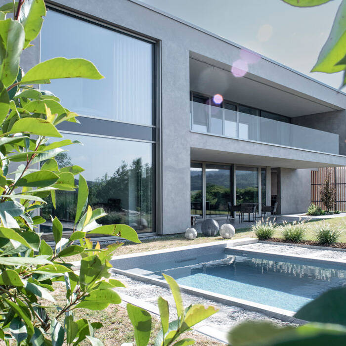 Das Hanggrundstück für dieses als Solitär wirkendende Einfamilienhaus, das den Auftakt eines Neubaugebietes bildet, bietet einen beeindruckenden Blick zur Schwäbischen Alb. Aus den Wünschen der Bauherren nach einem schlichten, kubischen Wohnhaus entwickelte die Architektin Bettina Müller-Fauth ein stimmiges und nachhaltig ausgerichtetes Gebäudekonzept. Das Haus erstreckt sich von Ost nach West über die Grundstücksbreite, wobei Wohnhaus und Garage einen Baukörper bilden. Nach Norden zeigt sich das Wohngebäude ohne sichtbare Öffnungen. Ein schwebender Betonbügel vor der Fensterfront im 1. Obergeschoss schützt vor Einblicken und lässt reichlich Tageslicht ins Innere. Vertikale Holzlamellen verbergen den Eingangsbereich, der nach Osten und Westen über zwei Geschosse verglast ist und das Atrium. Nach Süden öffnet sich das Haus über große Fensterflächen mit Rahmen aus eloxiertem Aluminium. Die Terrassen im Erd- und Obergeschoss sind in den Baukörper eingeschnitten und profitieren vom baulichen Sonnen- und Sichtschutz. Ein zweigeschossiges „Big Window“ im Wohnzimmer verbindet optisch den Innenraum und den Garten mit dem vorgelagerten Pool. Beide Ebenen des Hauses sind für offenes Wohnen auf 265 m² angelegt. Beim Betreten des Erdgeschosses blickt man direkt auf das zweigeschossige Atrium, in dem ein schlanker Baum in die Höhe wächst. Die interessanten Lichtspiele, die durch die Lamellen und den Betonbügel entstehen, bekommen von sanft geformten Pendelleuchten aus Metallgeflecht Verstärkung. Ein individuell entworfenes Regalelement nimmt die Garderobe auf. Parallel dazu verläuft die leichtfüßige Treppe mit eingeschobenen Stufen entlang der freistehenden Wand ins Obergeschoss. Sie öffnet sich dem Koch- und Essbereich, in dessen Zentrum ein mit Nussbaumholz verkleideter Kubus steht. Er nimmt das WC und die Treppe zu den Kellerräumen auf. Ebenfalls aus Nussbaum gefertigt sind die raumhohen Türen. Das Wohnzimmer und die Küche samt Essbereich verbindet oder trennt eine große Schiebetür. Einkäufe lassen sich auf kurzem Weg verstauen, da der Hauswirtschaftsraum direkt an die Doppelgarage andockt. Im Obergeschoss verläuft der Flur über die Länge des Hauses mit Blick zum Eingangsbereich. Ein langes Fenster nach Osten begleitet Flur, Bad, Ankleide und Schlafraum. An der Südseite lassen sich über ein verschiebbares Lamellenelement Ein- und Ausblicke sowie die Sonneneinstrahlung regulieren. Monolithisch aus Porenbeton mit einer Wandstärke von 42,5 Zentimern gebaut, kommt das Haus ohne Wärmedämmverbundsystem aus. Das autarke Energiekonzept beinhaltet sowohl Erdwärme aus Tiefenbohrung, eine Solaranlage mit einer Leistung von 10 kW, über die ein E-Auto betankt und im Sommer zusätzlich der Pool beheizt wird, als auch eine Fußbodenheizung und natürliche Verschattung in Form des baulichen Sonnenschutzes.
