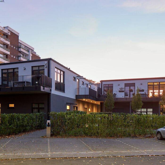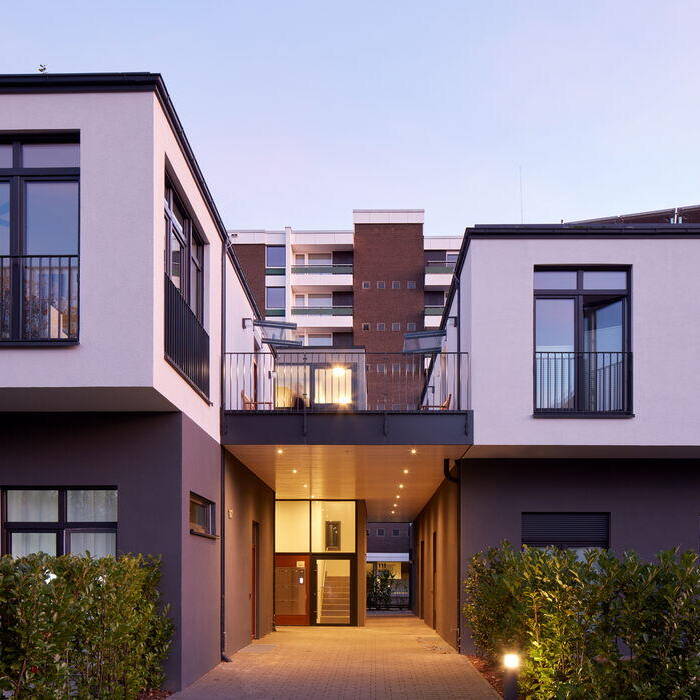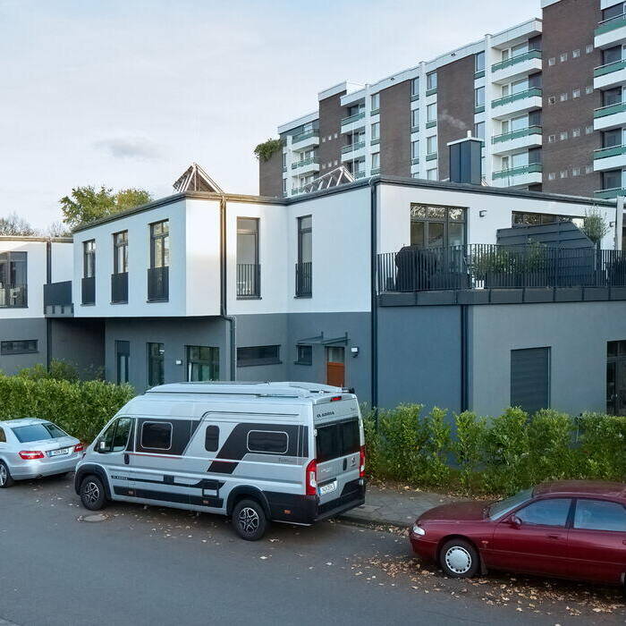 Schon länger hatte hier keiner mehr eingekauft: Die drei unterschiedlich groß dimensionierten Gebäude eines kleinen Einzelhandelszentrums in einer Wohnsiedlung der 1970er-Jahre lagen schon viele Jahre brach und waren dabei nicht ansprechender fürs Auge geworden. Statt auf Abriss und Neubebauung setzte das Düsseldorfer Planungsbüro aig+ Architekten auf einen innovativen Umgang mit dem Bestand: Durch Umwidmung und Aufstockung des Ensembles konnte das bestehende Gebäudeensemble in eine moderne Wohnanlage mit zwölf Wohneinheiten transformiert werden – mit Balkons und Terrassen sowie einem öffentlichen Außenerschließungsbereich.