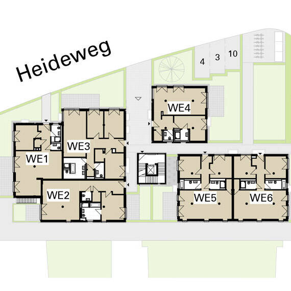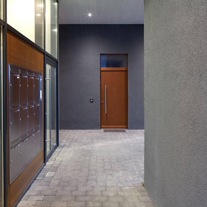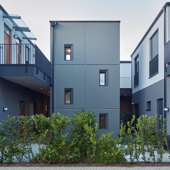 Um eine effiziente Erschließung der Aufstockung zu gewährleisten, wurde ein neuer Treppen- und Aufzugsturm zwischen den freistehenden eingeschossigen Bestandsgebäuden errichtet. Zugleich entstanden – im Erdgeschoss genauso wie im Obergeschoss – Wegeverbindungen zu den unterschiedlich ausgerichteten Wohnungen. Diese strukturieren das Gebäude nicht nur funktional, sondern verleihen ihm auch eine einladende und optisch ansprechende Atmosphäre, die das gesamte umliegende Wohngebiet aufwertet. Zudem wurden die Kellerräume im Untergeschoss neu geordnet und durch geschickte Verbindungen ebenfalls an den zentralen Treppen- und Aufzugsturm angebunden. Sowohl die Aufstockung um ein Geschoss als auch die tragenden Außenwände im Erdgeschoss wurden in nachhaltiger ökologischer Holzrahmenbauweise ausgeführt, die durch ihre Vorfertigung besonders effizient ist, aber auch ein angenehmes Raumklima befördert. Von außen haben die Baukörper eine einheitliche gedämmte Putzfassade erhalten, wobei das Erdgeschoss – einem Sockel gleich – in einem dunkleren Grauton abgesetzt wurde. Die Fenster wurden zugleich überwiegend als bodentiefe französische Fenster ausgeführt – mit einheitlich gestalteten Balkonbrüstungen aus Metall. Die entstandenen zwölf Wohneinheiten, die sich zu einer Gesamtwohnfläche von rund 900 m² addieren, sind als Zwei, Drei- oder Vierzimmerwohnung strukturiert. Balkone und Terrassen schaffen in jeder Wohnung zusätzliche attraktive Außenbereiche – räumlich und optisch getrennt von den PKW-Stellplätzen, die sich straßenseitig um das Ensemble herum verteilen. Die Beheizung der Wohnungen erfolgt überwiegend über eine gasbetriebene Brennwertkesselheizung, die Warmwassererzeugung über eine dachgestützte Solarthermieanlage. Um Legionellenbildung vorzubeugen und Wärmeverluste zu vermeiden, besitzt jede Wohneinheit eine eigene Frischwasserstation.