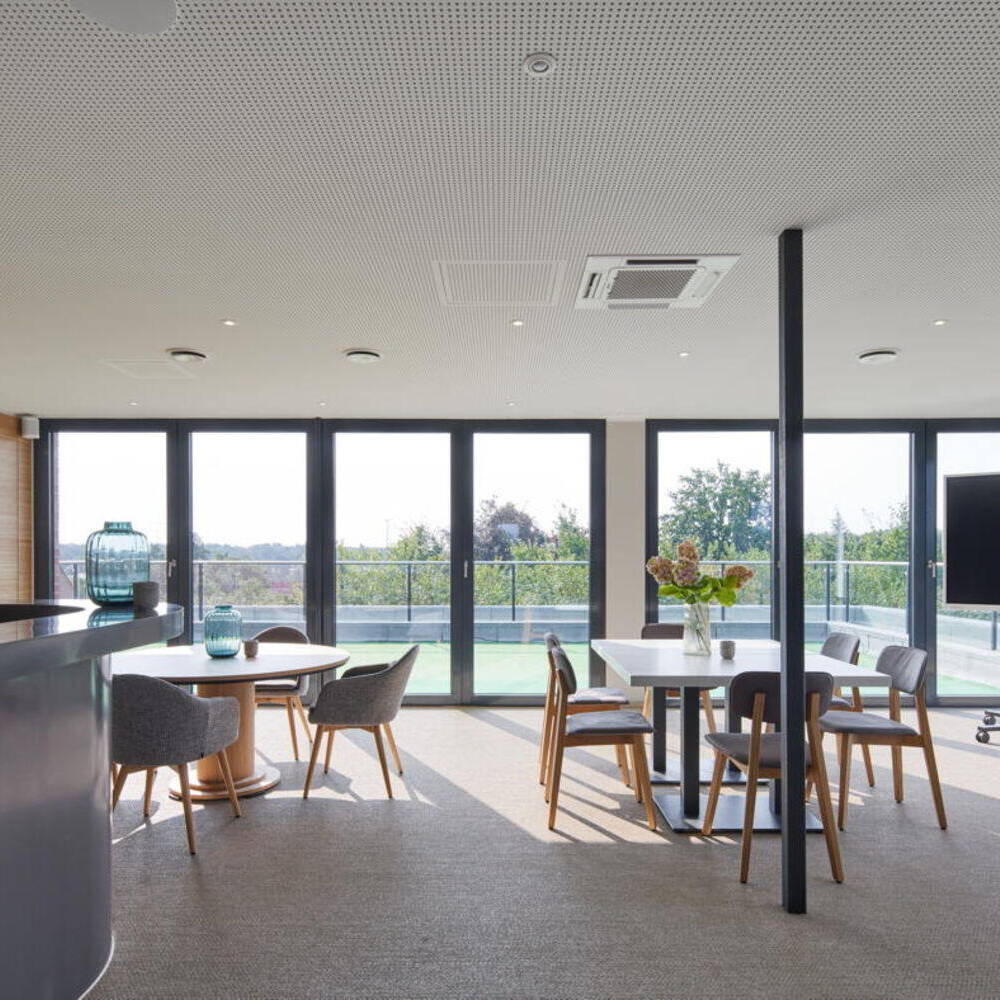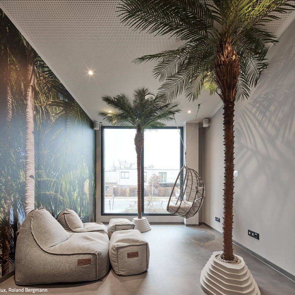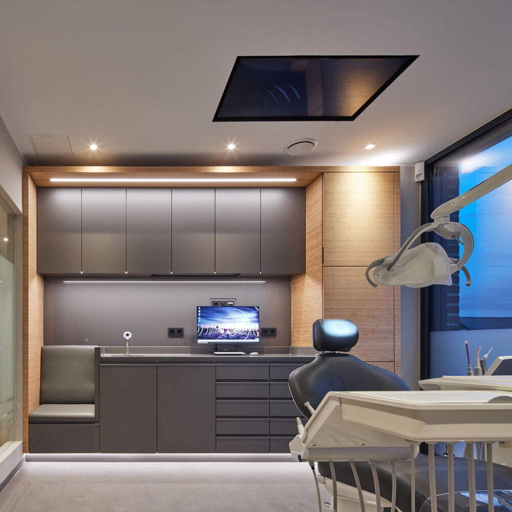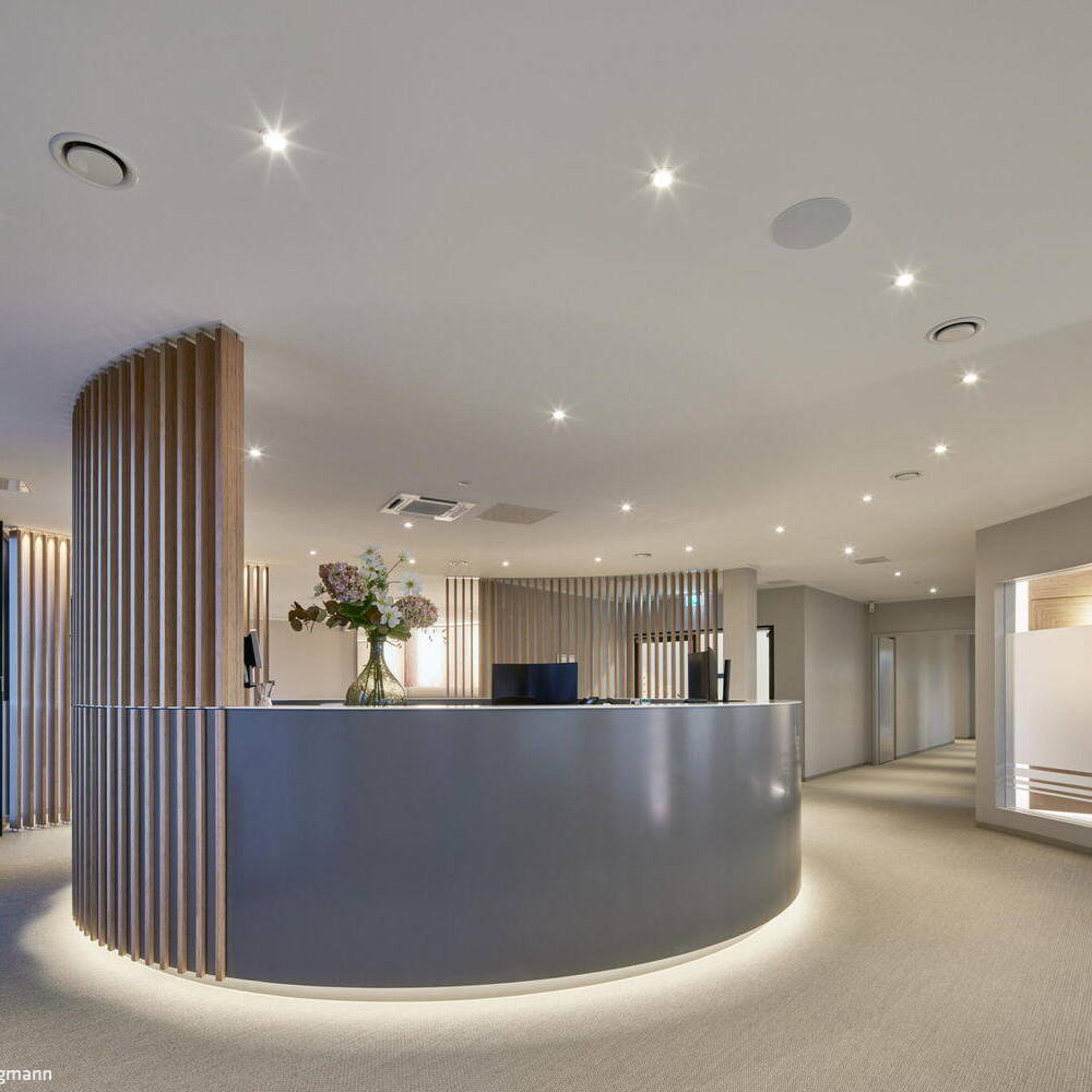 Das Raumkonzept sieht eine klare Trennung der Patienten- und Mitarbeiterzirkulation vor. Lichtdurchflutete Flure entlang der Fassaden gewährleisten kurze Wege und eine intuitive Orientierung für die Patienten, während die innenliegenden Mitarbeitergänge so konzipiert sind, dass sich Verkehrswege nicht kreuzen, um einen effizienten Betriebsablauf zu gewährleisten. Die Innenräume sind hell und freundlich gestaltet und schaffen eine angenehme Wohlfühlatmosphäre für die Patient:innen. Das Interieur vereint Funktionalität mit Ästhetik, wobei besonders gestaltete Räume für Kinder eine entspannte und einladende Umgebung bieten. Ergänzt wird das Raumprogramm durch eine großzügige, nach Süden ausgerichtete Dachterrasse mit Lounge, eine integrierte Physiotherapie sowie eine moderne Tiefgarage.