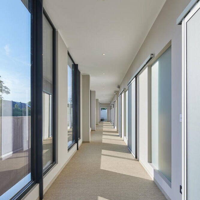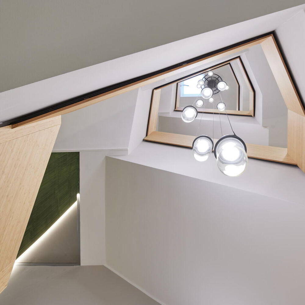Tragende Stahlbetonstützen, Betonfertigteile und ein aussteifender Erschließungskern bilden das statische Rückgrat. Für die Obergeschosse kamen Spannbetonhohldielen mit einer Fläche von 1.920 m² zum Einsatz. Diese Konstruktion verkürzte nicht nur die Bauzeit erheblich, sondern sparte auch rund 550 m³ Beton gegenüber einer Lösung in Ortbeton ein. Das Staffelgeschoss sowie die gesamte Fassade wurden als ökologische Holzrahmenkonstruktion umgesetzt. Insgesamt wurden 3.132 m² Holzständerwände verbaut, die als vorgefertigte Elemente mit bereits eingebauten Fenstern angeliefert wurden. Auch die inneren Trennwände bestehen vollständig aus einem Holzständerwerk. Die Decken wurden mit deckengleichen Unterzügen geplant, sodass Leitungen und haustechnische Komponenten optimal integriert werden konnten.