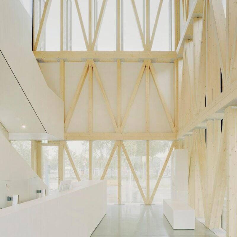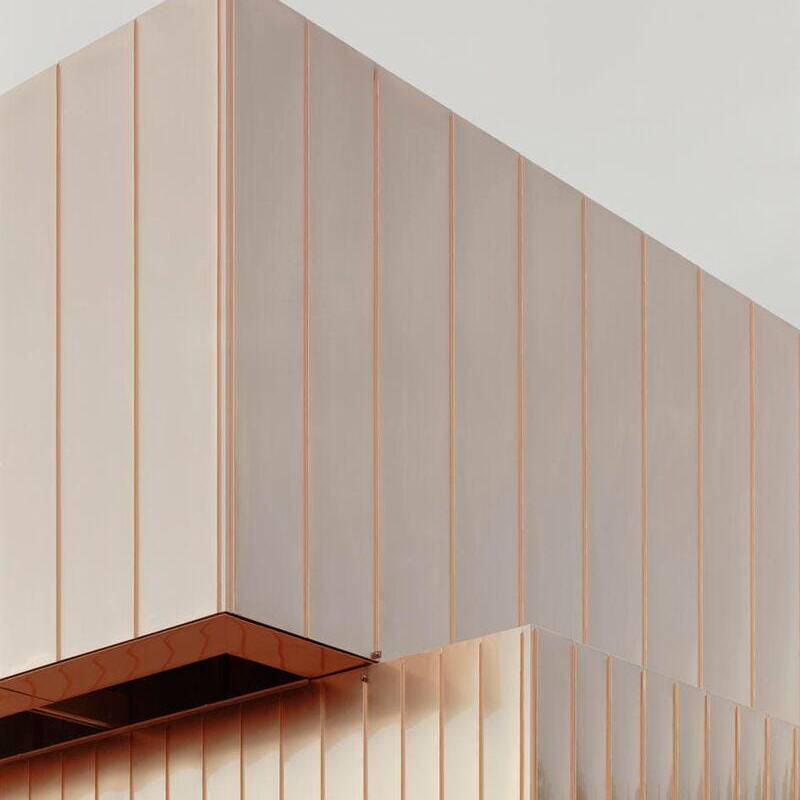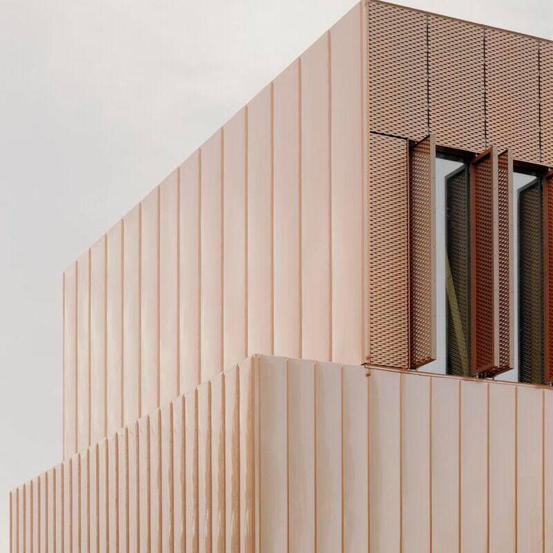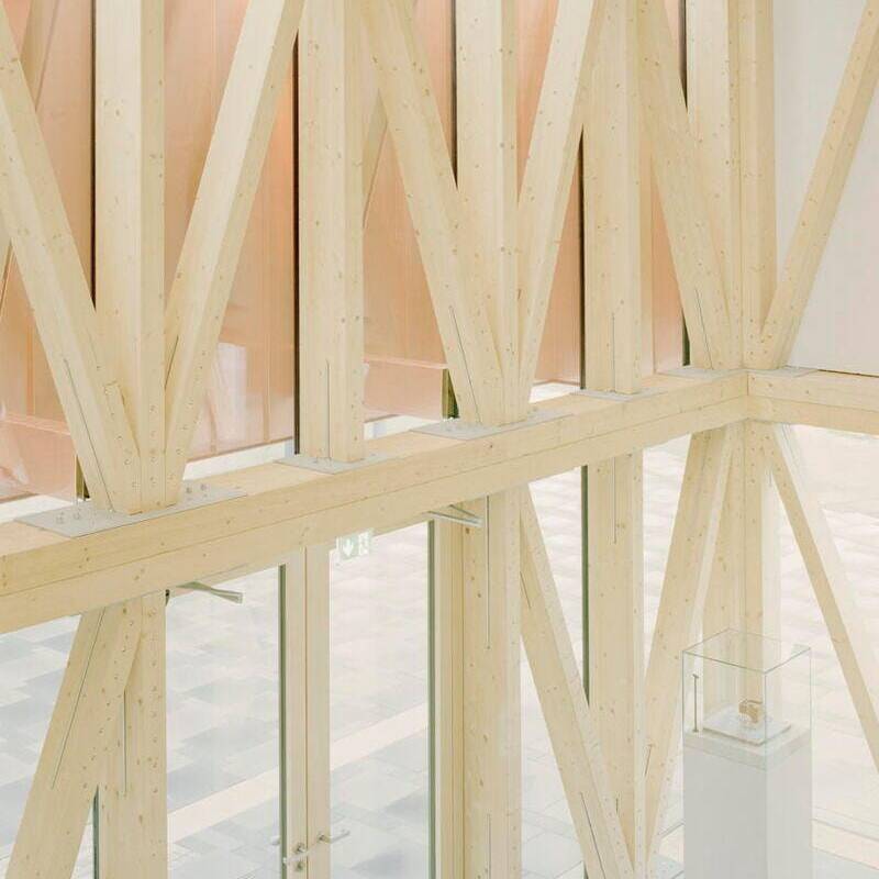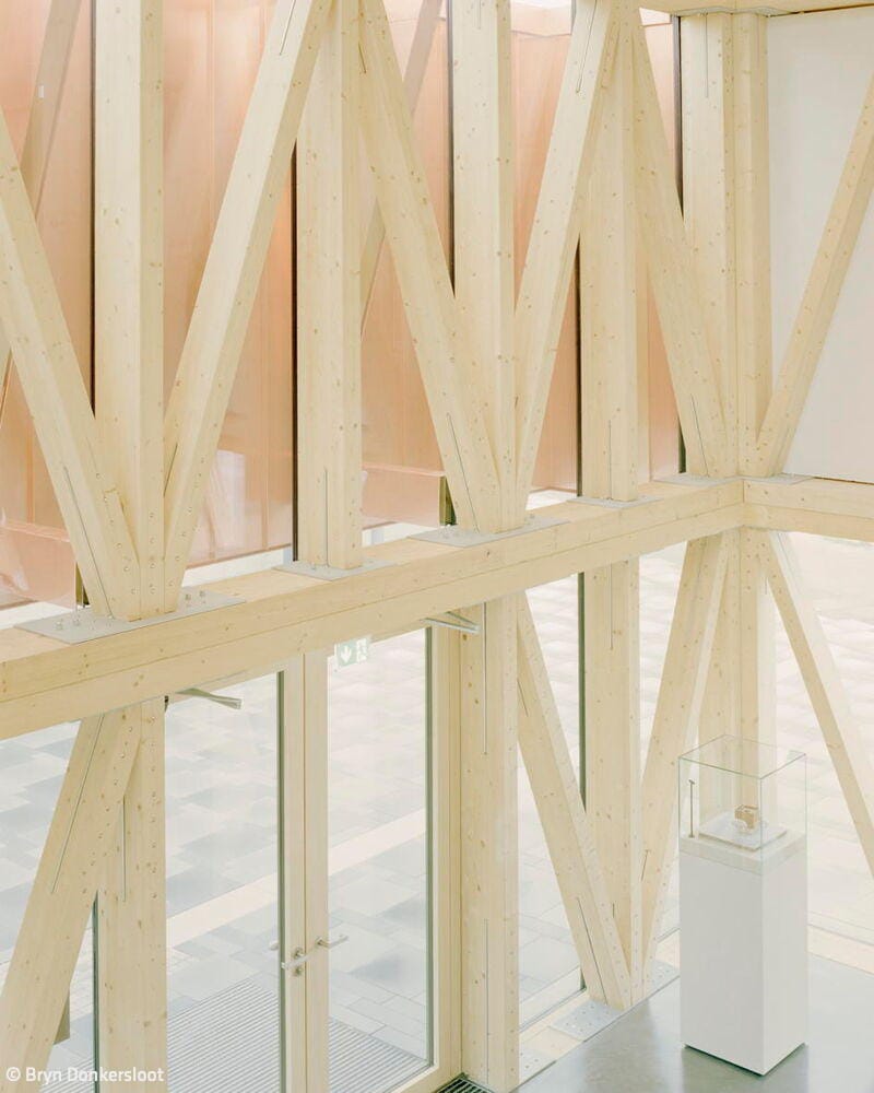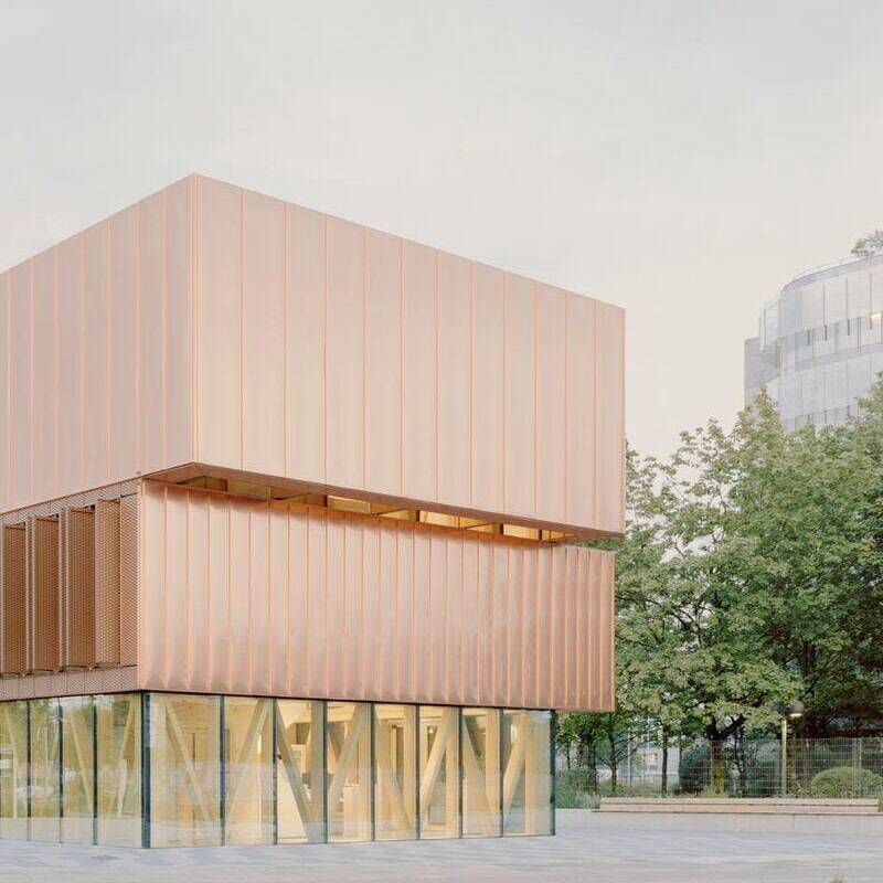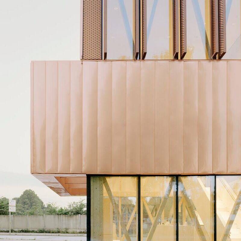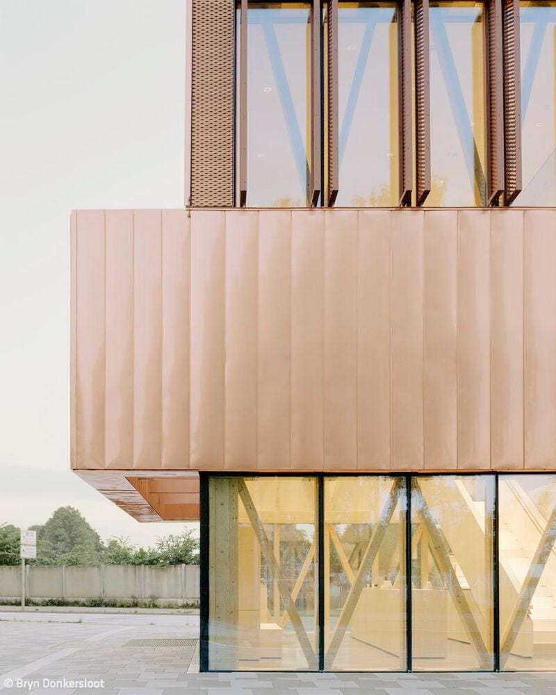 Die Materialität des Pavillons spiegelt sowohl Innovation und Nachhaltigkeit als auch die spezifische Identität des Unternehmens wider. Die Außenwände bestehen aus einer Holzfachwerkkonstruktion, die von außen ablesbar bleibt. Sie strukturiert auch den Innenraum räumlich und atmosphärisch – sie bleibt sichtbar, definiert Zonen und verleiht den Räumen Tiefe und Struktur. Die Erdgeschosszone ist rundum verglast. Als Hülle und damit als weithin sichtbar kommunizierendes und identitätsstiftendes Material dient eine Kupferfassade. Die Reflexionen und Spiegelungen auf der Kupferoberfläche erzeugen tagsüber ein lebendiges Bild, nachts strahlt die Fassade von innen heraus und entwickelt eine faszinierende Strahlkraft. Die vertikale Gliederung aus Holzkonstrukion und Stehfalz verleiht dem Baukörper Plastizität im Detail. Eine transparente Beschichtung auf der Kupferoberfläche verhindert Oxidation und den Schwermetallabtrag. Das Tragwerk des Neubaus ist als Holzkonstruktion konzipiert. Die tragenden Außenwände bestehen aus einem Holzfachwerk.