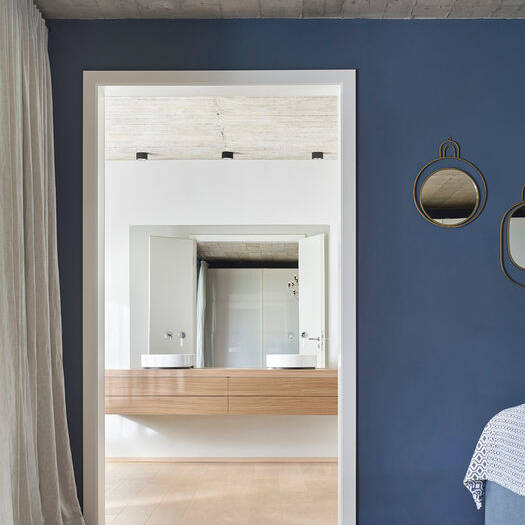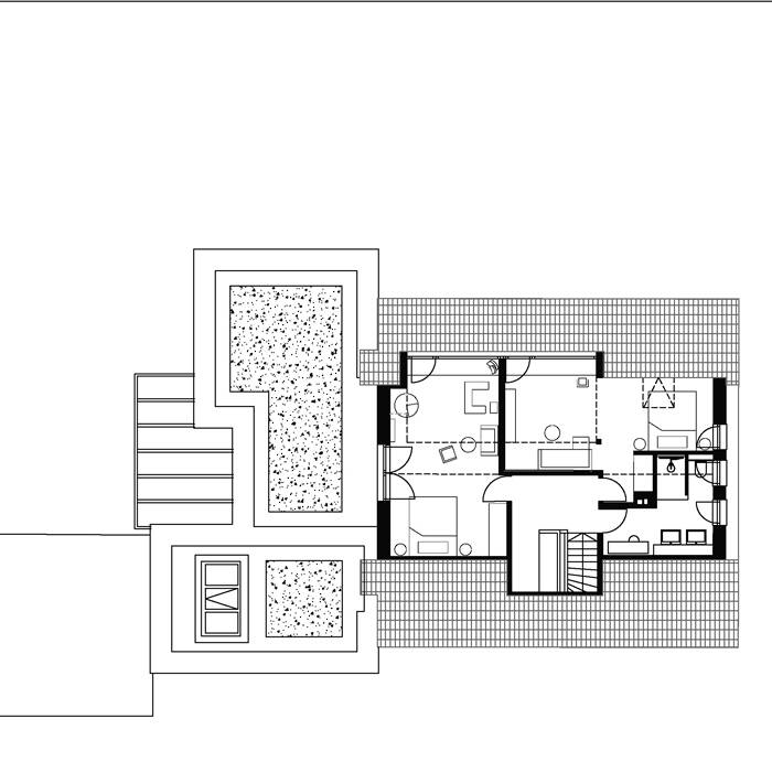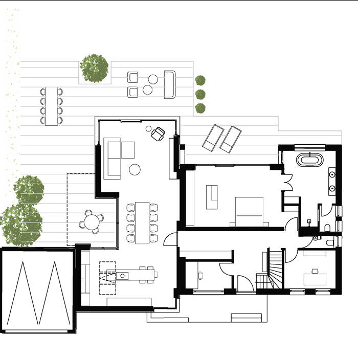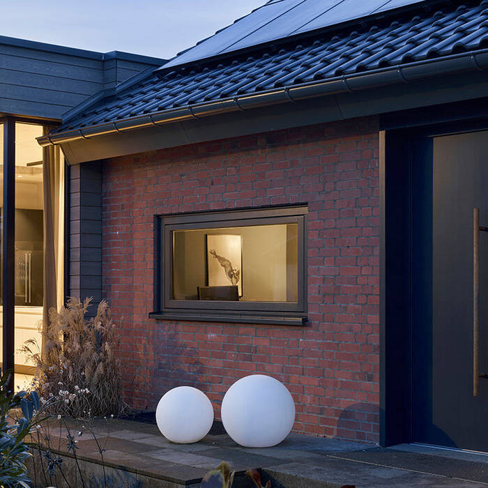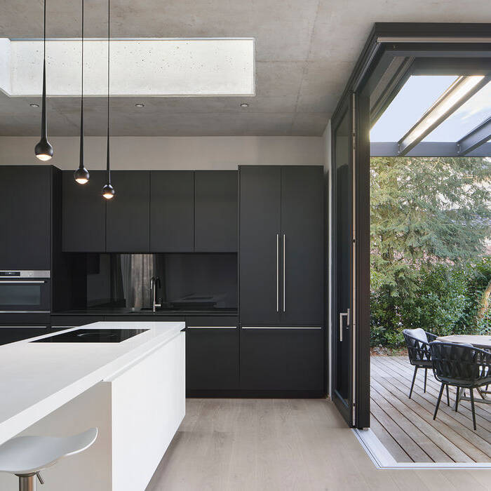 Die relativ kleinteiligen Räume des 134 m² großen Bestandshauses sollten so neu geordnet und ergänzt werden, dass sich ein weitläufiger gemeinschaftlicher Mittelpunkt für das Familienleben ergibt. Der zwischen Wohnhaus und Garage neu eingefügte, u-förmig um einen kleinen Patio herumgeführte Anbau erweitert die Wohnfläche auf 210 m² und schafft dabei einen großzügigen und geschützten Raum mit klar definierten Zonen für Wohnen, Essen und Kochen. Mit seinen mehreren, auf 3,10 Meter Raumhöhe ausgeführten Glasschiebefronten fängt er den täglichen Sonnenverlauf von Ost nach West ein und ermöglicht zugleich vielfältige Ausblicke auf die idyllische Gartenkulisse mit altem Baum- und immergrünem Buschbestand. Die dabei entstehende schwellenlose Anbindung an das Terrassenholzdeck lässt mediterrane Urlaubsstimmung gleich mit aufkommen: Damit Innen und Außen ganz miteinander verschmelzen, lassen sich die Schiebefronten auch über Eck zurückfahren. So ergibt sich etwa im Bereich des Patios ein fließender Innen-Außen-Raum, der durch sein transparentes Glasdach auch in kälteren Jahreszeiten genutzt werden kann. Ein großzügiges, dreiteiliges Oberlicht über dem freistehenden Küchenblock verleiht dem Wohnraum eine zusätzliche Nuance, indem es ihn mit einem dynamischen Licht- und Schattenspiel belebt. Auch die Räume im Bestand wurden im Zuge des Umbaus neu geordnet: So konnte durch Wanddurchbrüche das frühere Wohn- und Esszimmer in ein großzügiges barrierefreies Schlafzimmer, einschließlich Masterbad ensuite mit freistehender Badewanne vor dem Fenster, verwandelt werden – samt Ausblick ins Grüne. Das frühere Dachgeschoss wurde dagegen zur reinen Kinderetage samt Bad – mit einer deutlich vergrößerten Dachgaube, die viel Tageslicht und natürlich auch Aussicht in die Räume holt. Außen wie innen wurde darauf geachtet, dass beide Bauteile als eigenständige Einheiten bewahrt werden und sich optisch doch ergänzen: So wurden etwa die Deckenoberflächen angenähert: Eine unter der Holzverkleidung des Bestands „schlummernde“ brettgeschalte Betondecke wurde freigelegt und verbindet sich so harmonisch mit den Sichtbetondecken des Neubaus. Eine Verbindung stellt auch der warme Parkettboden her, der sich wie ein Band durch Alt- wie Neubau zieht. Ein Teilbereich der alten roten Klinkeraußenwand wurde im Anbau bewusst als Blickfang und Verweis sichtbar belassen. Mehrere maßgefertigte Möbeleinbauten unterstreichen die Individualität der Räume. Bei der Haustechnik kam schließlich ein zeitgemäßes KNX-System zum Einsatz. Eine PV-Anlage erzeugt auf dem teilbegrüntem Dach des Anbaus den überwiegenden Teil des Hausstrom.