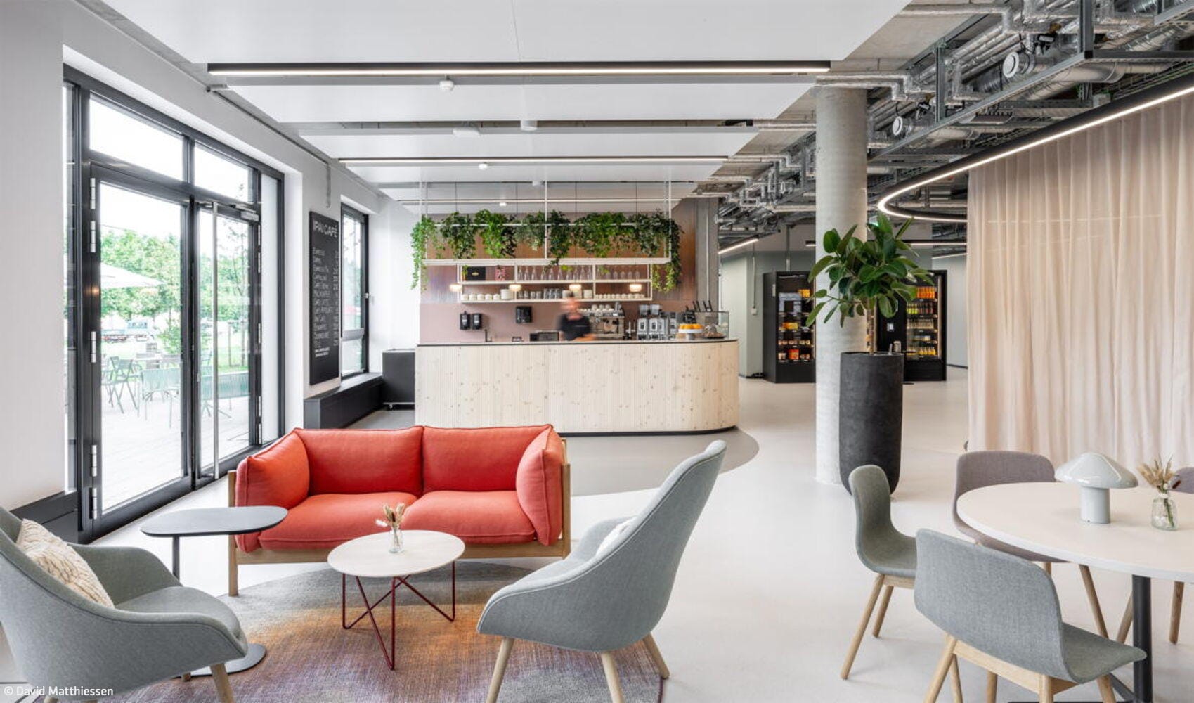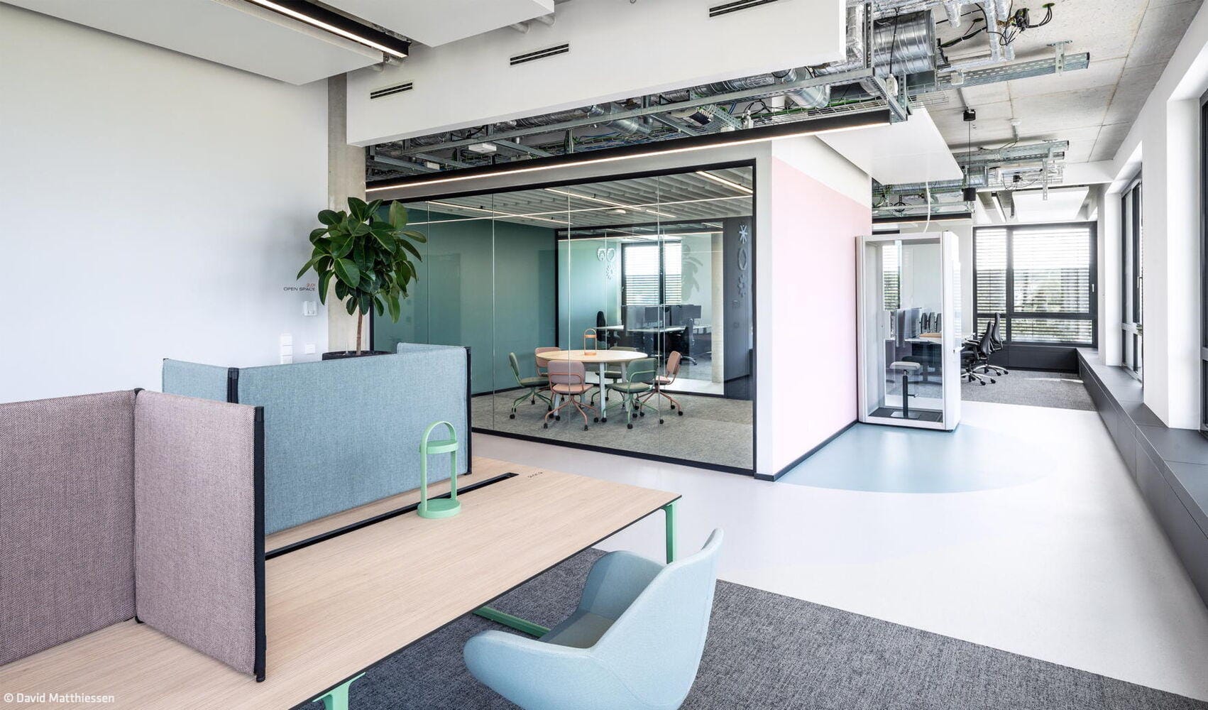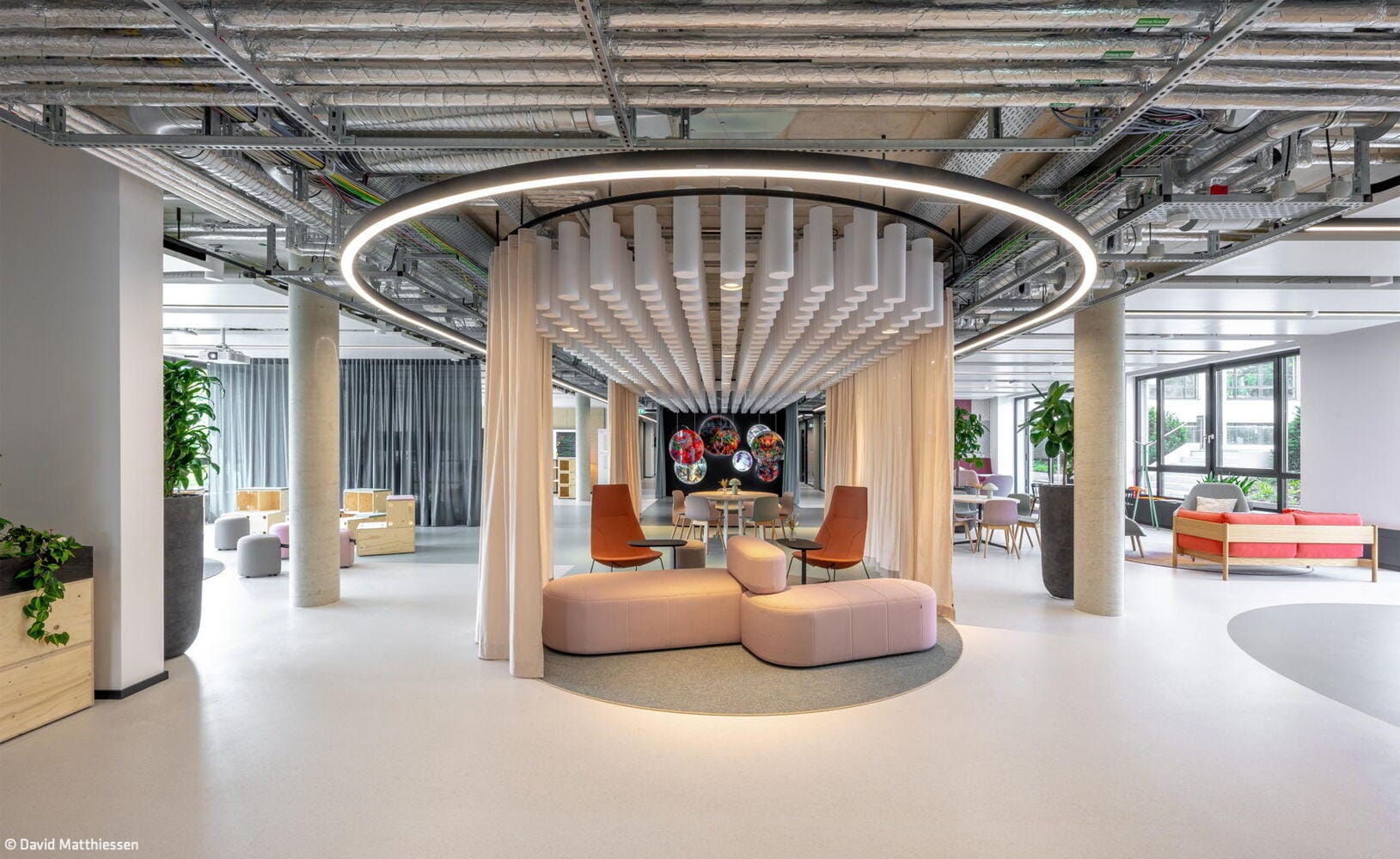 Die Vision war ambitioniert: ein innovatives Coworking-Office mit rund 200 Arbeitsplätzen zu schaffen, das Unternehmen aus dem KI-Bereich eine inspirierende Arbeitsumgebung bietet. Gleichzeitig sollte ein Besucherzentrum entstehen, das Künstliche Intelligenz erlebbar macht und die Faszination dieser Technologie vermittelt. Neben einem einladenden Café umfasst das Konzept des Büros Süd.Com, das mit der Planung beauftragt wurde, großzügige Aufenthaltsflächen, vielseitige Veranstaltungs- und Workshopräume, einen Ausstellungsbereich und sogar ein Reallabor. Durch interaktive Ausstellungen, spannende Demonstratoren und verschiedene Veranstaltungsformate soll Begeisterung für KI geweckt werden. Das innenarchitektonische Konzept der IPAI Spaces schafft eine Umgebung, die zum Austausch und zur Innovation einlädt. Die Formensprache des Corporate Designs von IPAI und des zukünftigen runden Campusgeländes wiederholt sich in der Gestaltung der Innenräume. Funktionalität und Ästhetik verschmelzen zu einer harmonischen Einheit, die ideale Rahmenbedingungen für kreatives Arbeiten, die Entwicklung zukunftsweisender KI-Lösungen und den interdisziplinären Dialog bietet. Runde Formen und eine Farbpalette aus pastelligen, wohnlichen Tönen prägen das Ambiente und erzeugen eine einladende Atmosphäre. Auch bei der Materialauswahl wurde auf Nachhaltigkeit und Zukunftsfähigkeit gesetzt: Ein Bodenbelag aus Naturkautschuk in unterschiedlichen Farbtönen zoniert die Bereiche und setzt mit seinen Rundungen gestalterische Akzente. Recyclingfähige Teppichfliesen in den Büros und Besprechungsräumen erhöhen den Komfort.