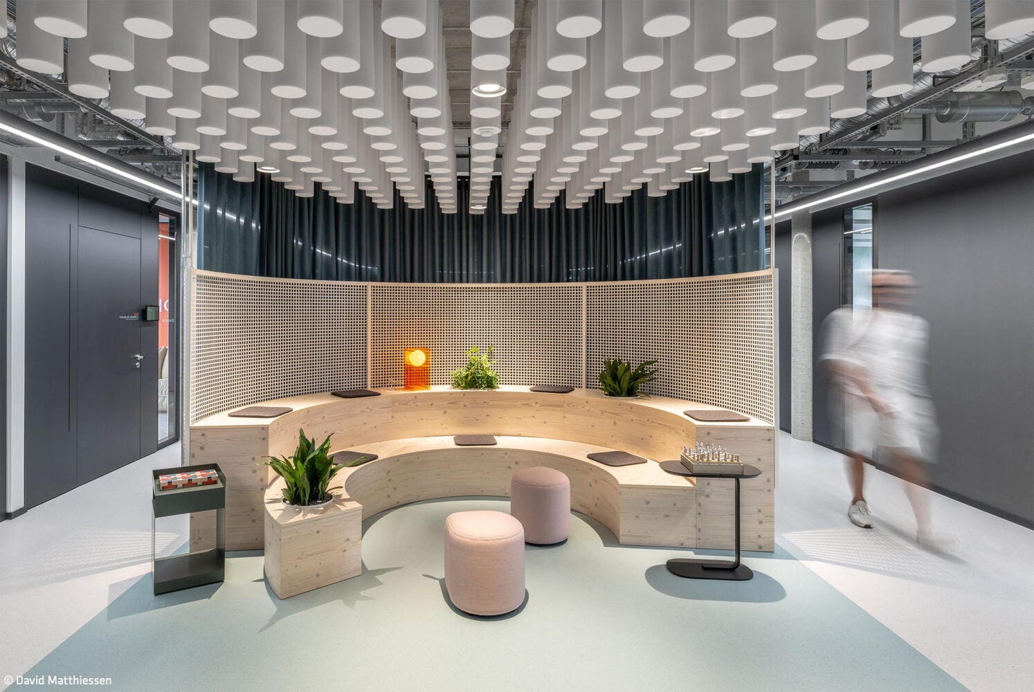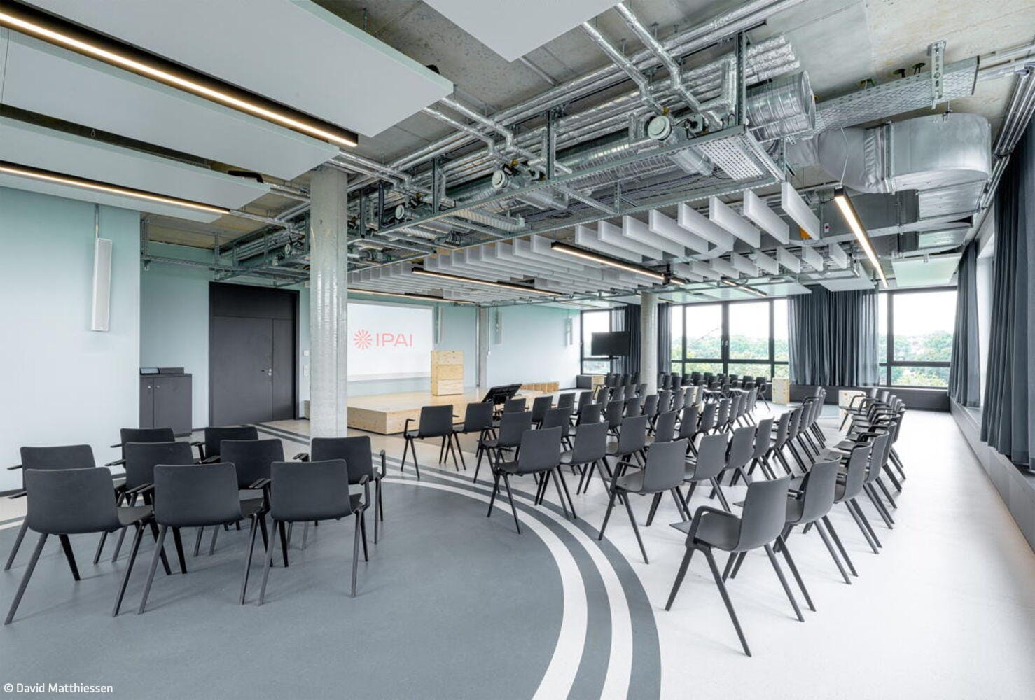 Die rohe Betondecke mit sichtbaren Installationen verleiht den Räumen einen industriellen Charme, der durch runde Akustikzylinder, lineare Leuchten und flexible Vorhangsysteme elegant ergänzt wird. Die Möblierung greift die Formensprache der Architektur auf und integriert zugleich weiche Elemente wie Auflageteppiche. Telefonzellen und Think Tanks zwischen den Besprechungs- und Loungebereichen bieten Rückzugsorte für konzentriertes Arbeiten. Das modulare Möblierungskonzept ermöglicht flexible Raumgestaltungen und individuelle Nutzungsszenarien. Nach einer intensiven Planungs- und Ausbauphase von zwei Jahren wurden die IPAI Spaces im Juni 2024 im Rahmen des Heilbronner KI-Festivals feierlich eröffnet.
