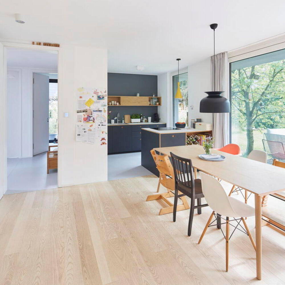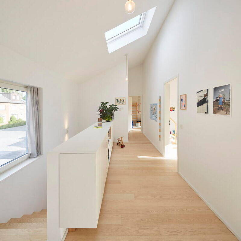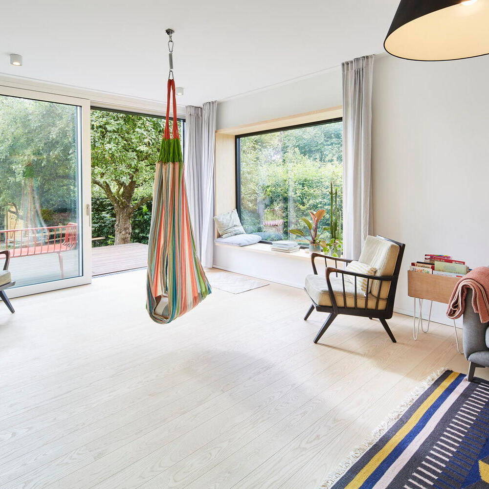 Die minimalistische Gestaltung sieht an der Vorderseite zur Straße hin nur wenige Fensterflächen vor, in Richtung Garten öffnet sich das Gebäude jedoch wie gewünscht großzügig durch bodentiefe Fenster im Erdgeschoss und große Fenster im Obergeschoss. Da für die Reduzierung der Kosten auf einen Keller verzichtet wurde, befinden sich der Abstell- und Technikraum im Erdgeschoss. Dieses dient ansonsten reinen Wohnzwecken. Über das weitgehend verglaste Wohnzimmer gelangt man auf die Terrasse und in den angrenzenden Garten. Esszimmer, Küche, Entree und Gäste-WC komplettieren das funktionale Wohnkonzept, das durch den Einsatz von Parkettböden und Holztreppen Wärme und Geborgenheit ausstrahlt. Im Obergeschoss befinden sich ein Spielflur, Arbeits- und Gästezimmer, ein Schlafzimmer, zwei Kinderzimmer und das Bad. Das Haus, das als Massivhaus den KfW-55-Standard erreicht, ist mit einer Fußbodenheizung ausgestattet. Die Alu-Holz-Fenster sind dreifachverglast, die Energieversorgung erfolgt durch Geothermie. Errichtet wurde das Domizil durch ein örtliches Bauunternehmen.