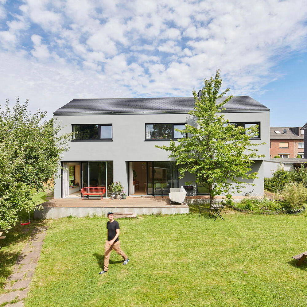 Wenn die Bauherschaft und ihr Architekt gut zusammenarbeiten, entsteht auch ein gutes Projekt. So geschehen in Dortmund-Hombruch, wo eine vierköpfige Familie ihr Einfamilienhaus von Lohse Architekten hat planen lassen. In dem beliebten Stadtteil mit seinen Hügeln, Parks und Kleingärten befand sich in einer bestehenden Wohnsiedlung noch ein letztes unbebautes Grundstück, auf das die Wahl fiel. Nachbar ist der Bruder des Bauherrn, was sich für die engen Abstimmungsprozesse als positiv erwies. Die größte Herausforderung stellte das kleine Baufeld auf dem rund 604 m² großen Grundstück dar. In dieses musste Wunschhaus der Familie passgenau platziert werden. „Wir haben jeden Zentimeter des zulässigen Baufeldes ausgereizt“, blickt Architekt Moritz Lohse zurück, der das Projekt von der ersten Skizze bis zur Baugenehmigung betreute.