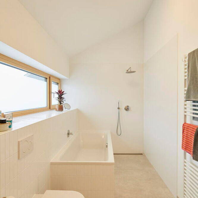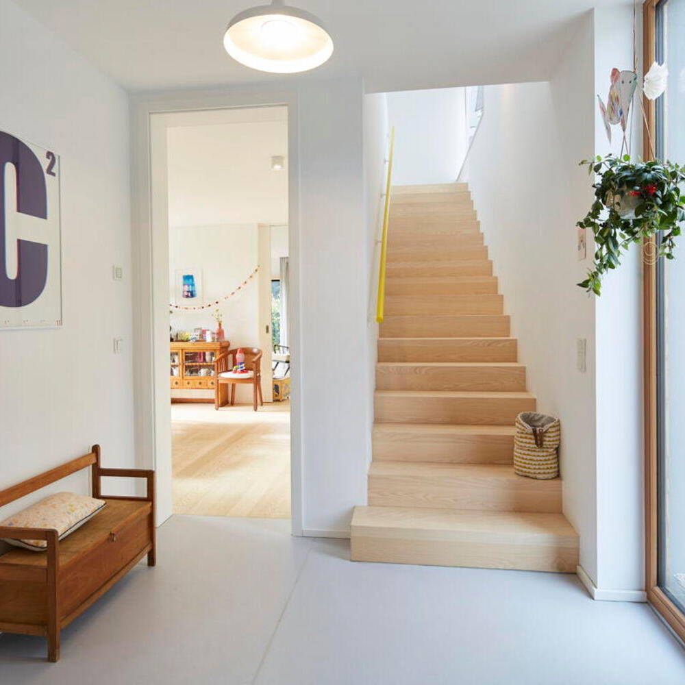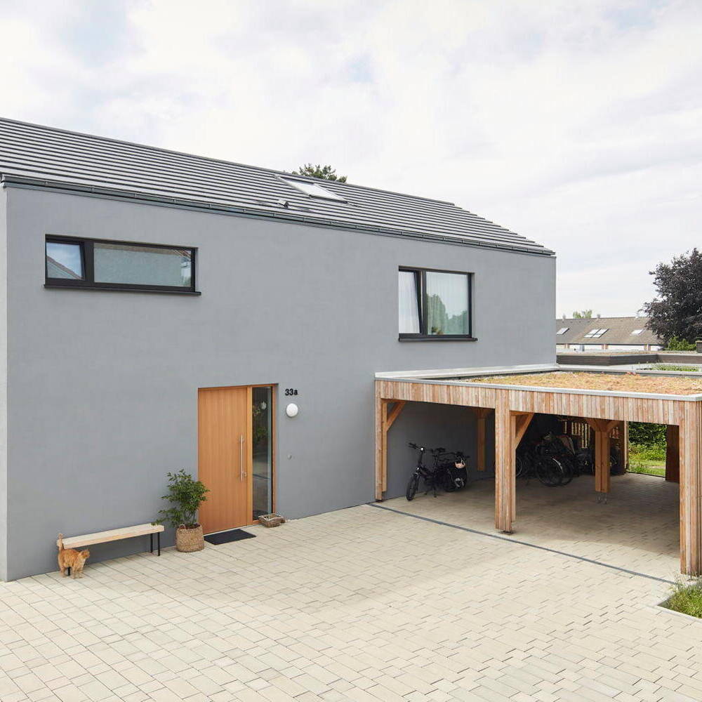 Für das Bauvorhaben wichtige Rahmenbedingungen hatte die Bauherrenschaft bereits optimal vorbereitet. So lagen von Beginn an alle wesentlichen Informationen zum Grundstück, zu Gestaltungswünschen, Wohnfläche und Raumprogramm bis zum Budgetrahmen vor. Das Gebäude sollte sich deutlich zu den Neubauten abgrenzen, die im Bauhausstil, mit weißer Putzfassade und anthrazitfarbenen Fenstern, gestaltet werden. Für die Fassade des geradlinigen Baukörpers wurde ein heller Grauton gewählt, wobei die Eingangstür aus warmem Holz einen einladenden Akzent setzt. Unmittelbar angedockt an das Gebäude, das rund 160 m² Wohnfläche bietet, ist ein Doppelcarport in Holzbauweise. Er ist auf der gemeinsamen Grenze zum Grundstück des Bruders verortet und wird je hälftig genutzt.