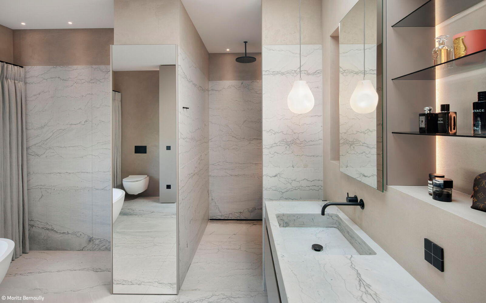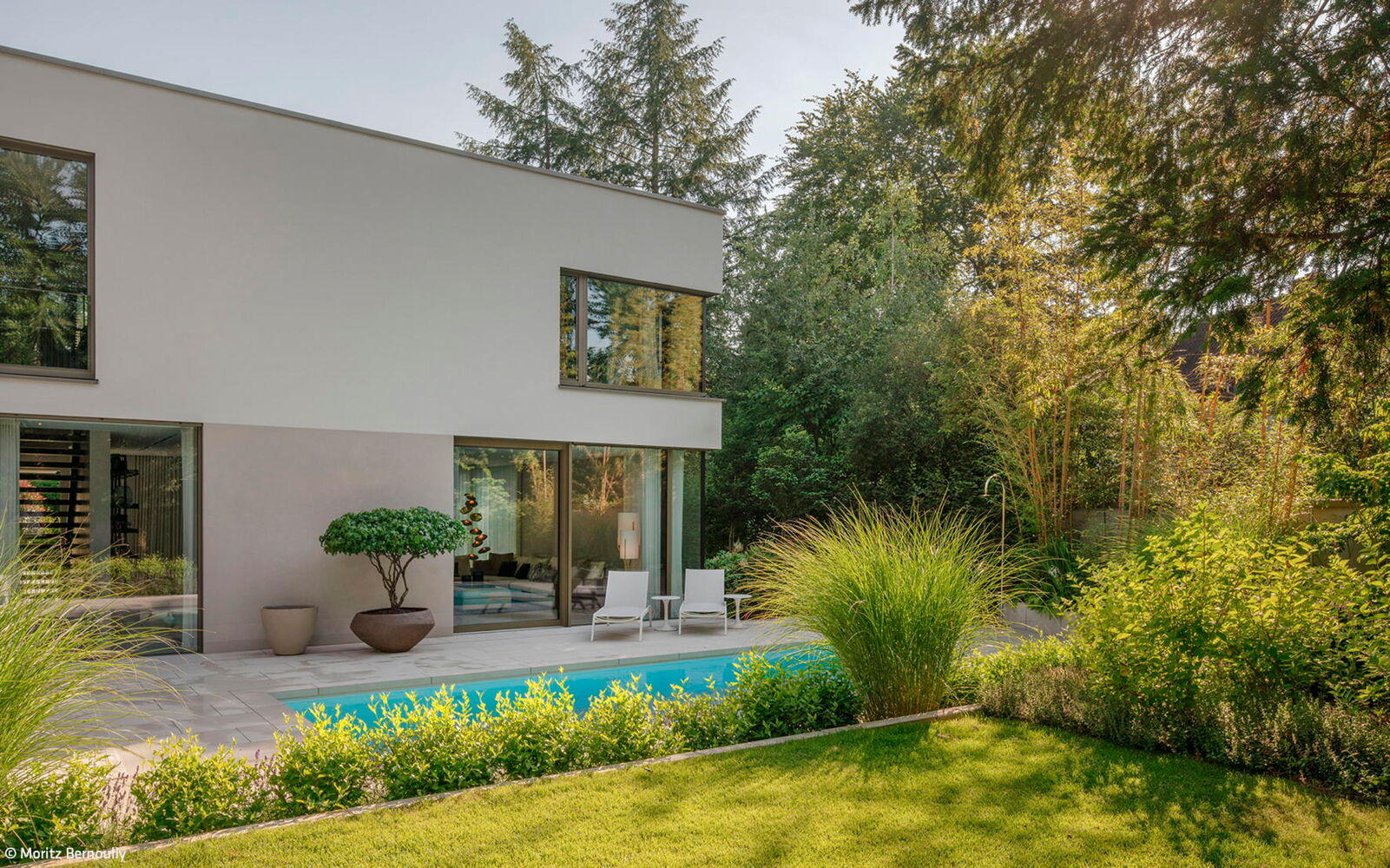 Die Vision: ein Wohngefühl wie in Kalifornien. Offenheit, Leichtigkeit, ein fast lässiger Umgang mit Raum, Licht und Natur. Genau diese Idee griff das Darmstädter Architekturbüro Studio Schubert Architektur auf und übersetzte sie mit architektonischer Präzision und großer Empathie in den Kontext des Rhein-Main-Gebiets. Als Vorbild dienten die berühmten Case Study Houses – ikonische Wohnbauten der US-Nachkriegsmoderne, bei denen es Programm war, moderne, funktionale und erschwingliche Wohnhäuser zu schaffen, die sich harmonisch in ihre Umgebung einfügen und gleichzeitig neue Wege des Wohnens aufzeigen. Das Grundstück selbst stellte eine besondere Herausforderung dar: Zwei Gartenbereiche – einer straßenseitig, einer rückwärtig – sollten verbunden werden, obwohl ein Höhenunterschied von knapp einem Meter zu überwinden war. Die Architekten entwickelten eine elegante Lösung: einen fließenden, gestuften Übergang von Architektur und Landschaft, bei dem sich Gebäude und Garten wie Puzzleteile ineinanderfügen. Das Erdgeschoss ist die lebendige Mitte des Hauses. Küche, Essbereich und Wohnzimmer gehen nahtlos ineinander über, mit raumhohen Glasfronten, die den Blick in den Garten freigeben. Das sichtbare Holzdach, das sich vom Inneren über die Terrasse bis zum Carport erstreckt und auch eine Outdoor-Küche überdacht, ist sowohl gestalterisches wie funktionales Statement. Hier wird das Ankommen zelebriert: Das Auto gehört hier zum Bild, ein bewusster Verweis auf das kalifornische Vorbild eines offenen Wohnens. Im Obergeschoss befinden sich die privaten Rückzugsorte: zwei Kinderzimmer mit eigenen Bädern, ein großzügiger Elternbereich samt Masterbad, Ankleide und Blick ins Grüne. Im ebenfalls natürlich belichteten Untergeschoss: Sauna, Fitnessbereich, Spielzimmer – Räume, in denen sich der Alltag vergessen lässt. Die Architekten setzten bei dem Wohnhaus auf solide Materialien: Ein hochgedämmtes und verputztes Mauerwerk trifft auf sichtbares Holztragwerk – etwa im Koch-/Essbereich, im Carport oder in der Außenküche. Holz dient hier nicht nur als warmes Gestaltungselement, sondern auch als konstruktives Rückgrat. Es verleiht Atmosphäre und Haltung – und eine haptische Nähe zur Natur. Das Interieur des Hauses ist geprägt von reduzierten Formen und edlen Materialien wie beispielsweise dem durchgehenden, fast fugenlosen weißen Zement-Heiz-Estrich im Erdgeschoss und der textilen Wandbespannung für eine gute Raumakustik. Im Obergeschoss prägt massives Eichen-Doppelstab-Parkett im Fischgrät-Verband die Atmosphäre, während im Master-Bad abwechselnd scharrierter und glatter weißer Quarzit für visuelle und haptische Akzente sorgt. Die Farbpalette des Hauses ist zurückhaltend und naturverbunden, dominiert von warmen Tönen, die Eleganz und Gemütlichkeit harmonisch miteinander verbinden. Ein zentrales Gestaltungselement ist das Licht. Tagsüber übernimmt die präzise gesetzte Öffnungsarchitektur mit Fensterbändern, Glasflächen und Oberlichten die natürliche Beleuchtung. Nachts wird das Licht durch ein fein abgestimmtes Konzept in Szene gesetzt, das Räume modelliert und Stimmungen erzeugt (entworfen von den Innenarchitekten Schmidt Holzinger ebenso wie das Innendesign). Licht wird hier nicht nur geplant – es wird zelebriert.