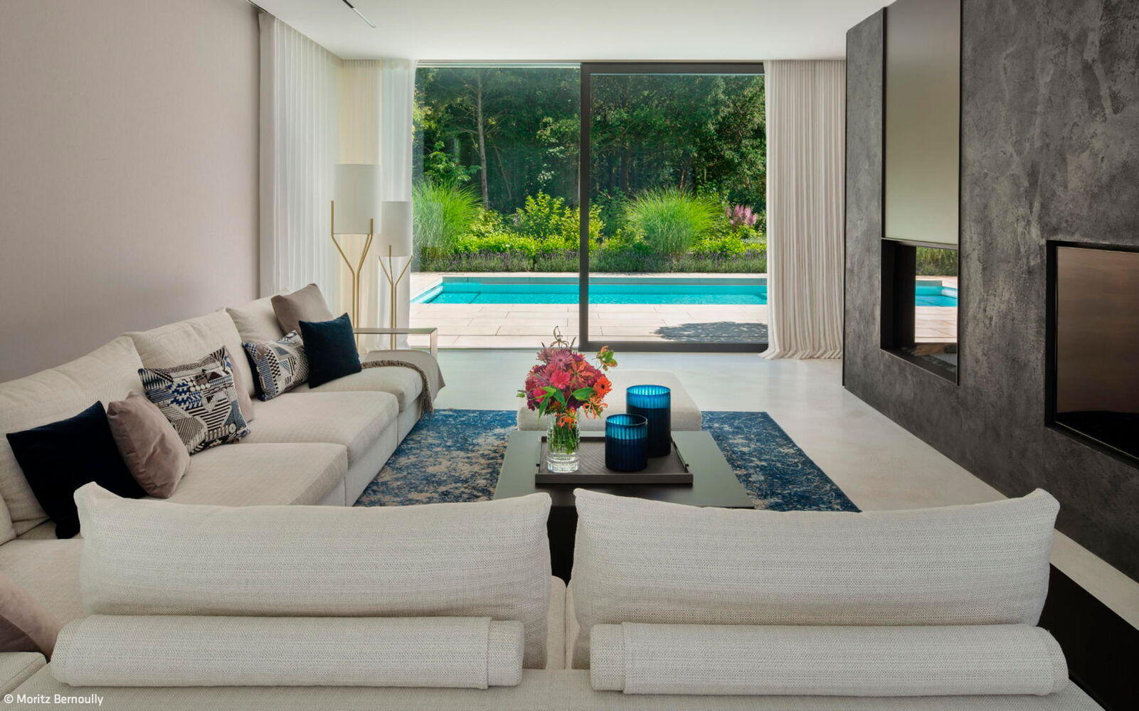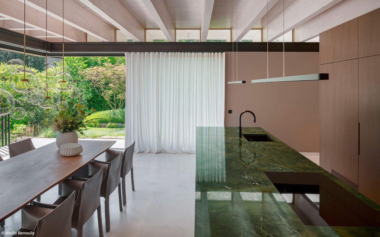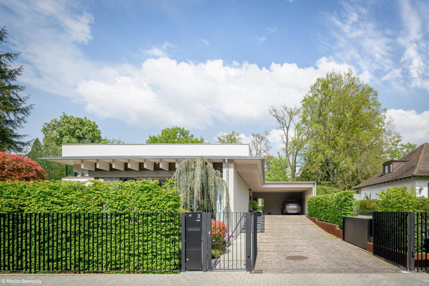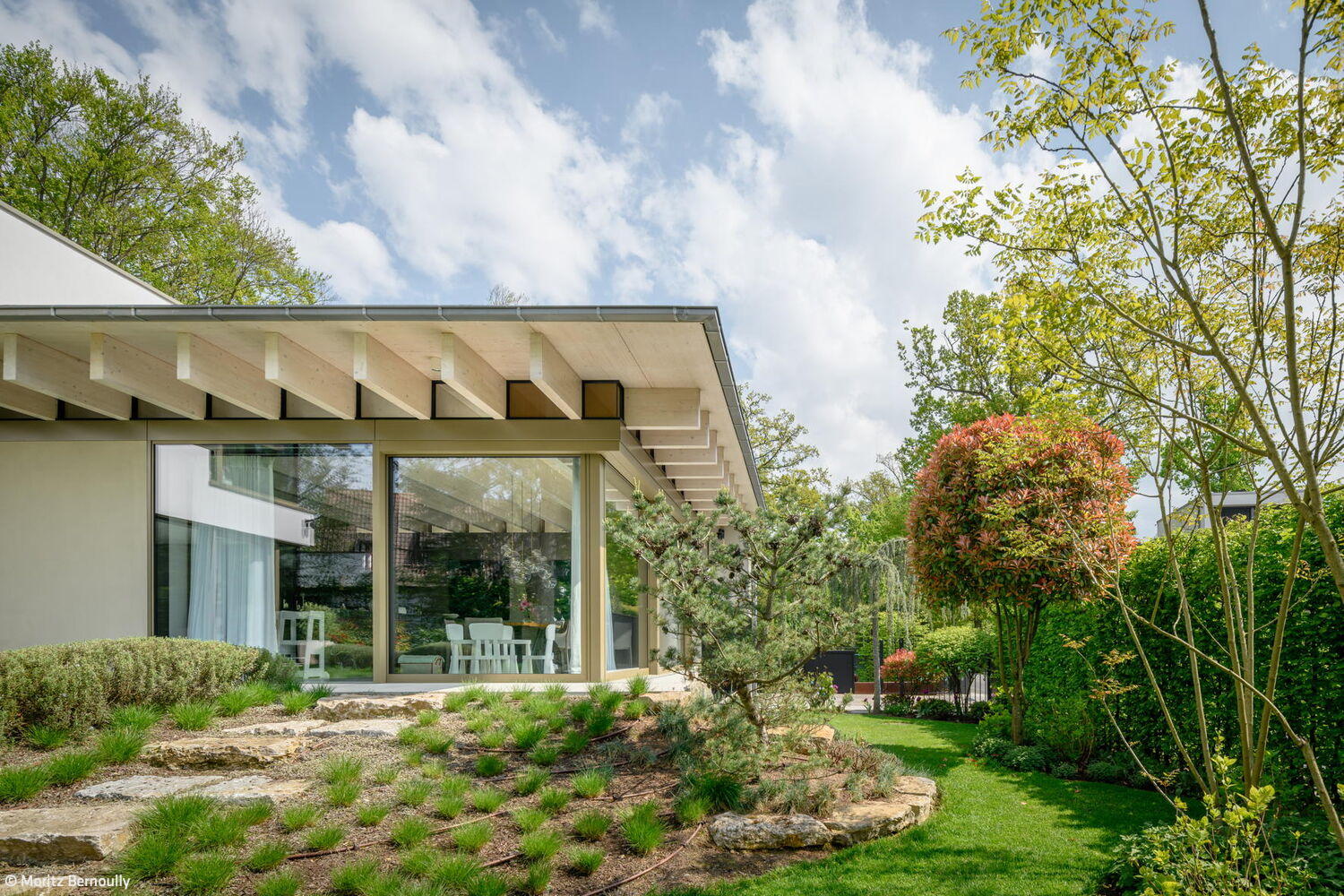Ein weit auskragendes Holzdach schwebt wie ein schützender Schirm über dem Herzstück des Hauses, darunter klare Linien, viel Glas und weite Räume. Doch unter dem Dach und hinter den Fassaden offenbart sich mehr als gelungene Ästhetik. Hier ist ein Lebensraum entstanden – ein Zuhause, das atmet, lebt und verbindet.