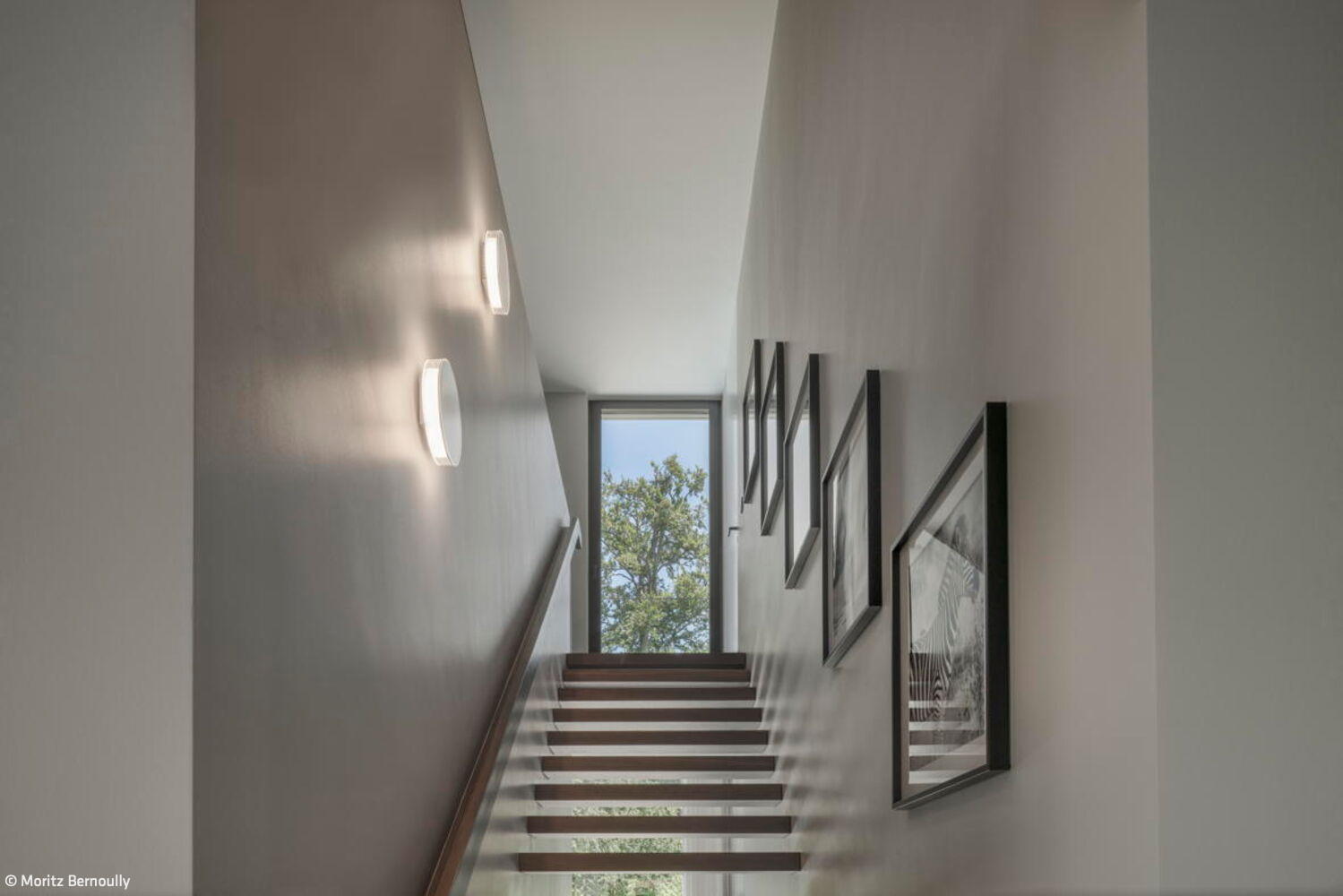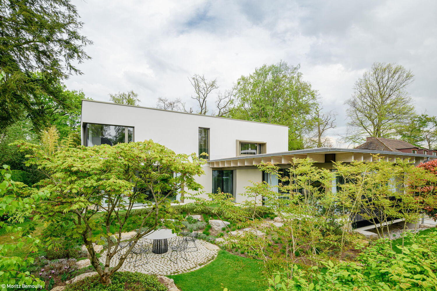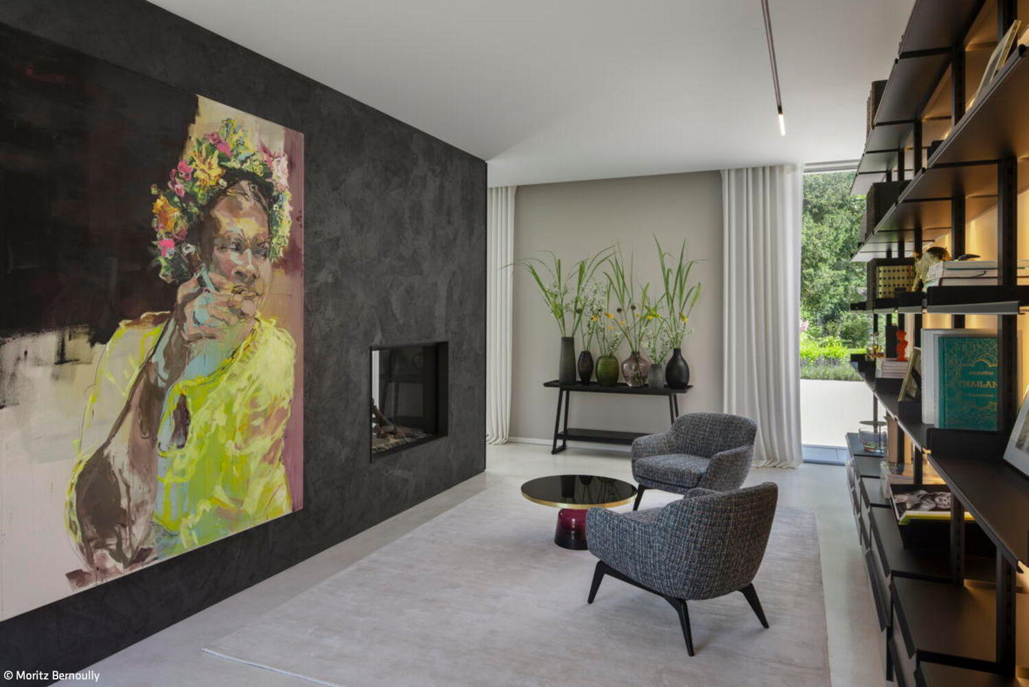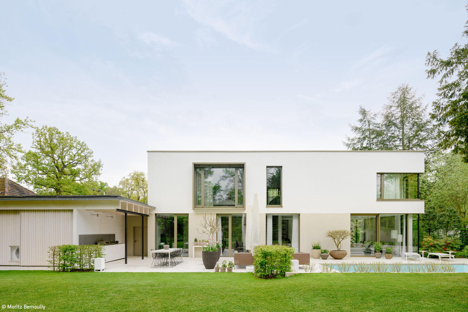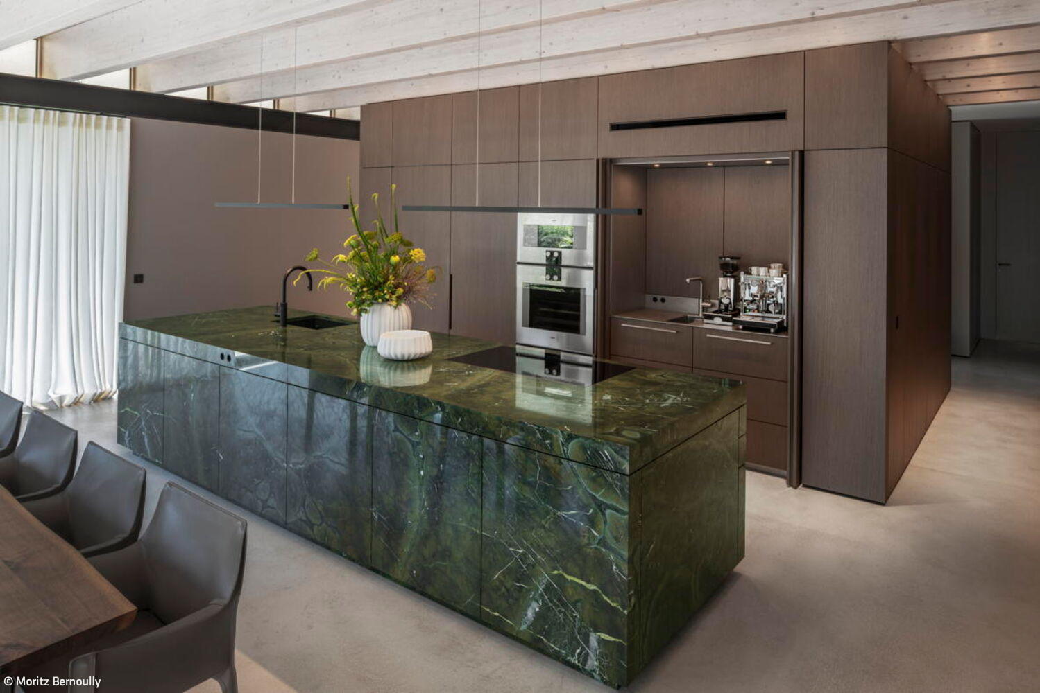Ein weit auskragendes Holzdach schwebt wie ein schützender Schirm über dem Herzstück des Hauses, darunter klare Linien, viel Glas und weite Räume. Doch unter dem Dach und hinter den Fassaden offenbart sich mehr als gelungene Ästhetik. Hier ist ein Lebensraum entstanden – ein Zuhause, das atmet, lebt und verbindet.