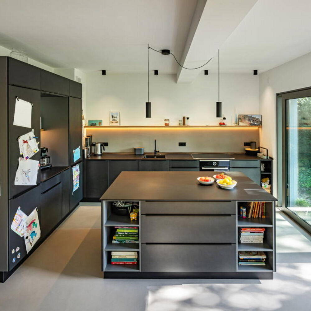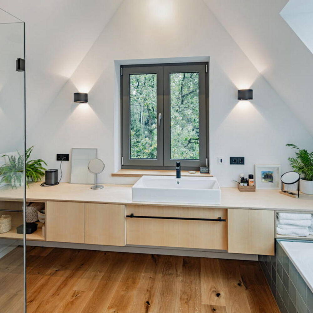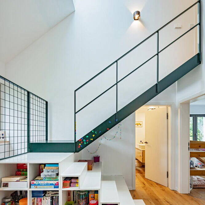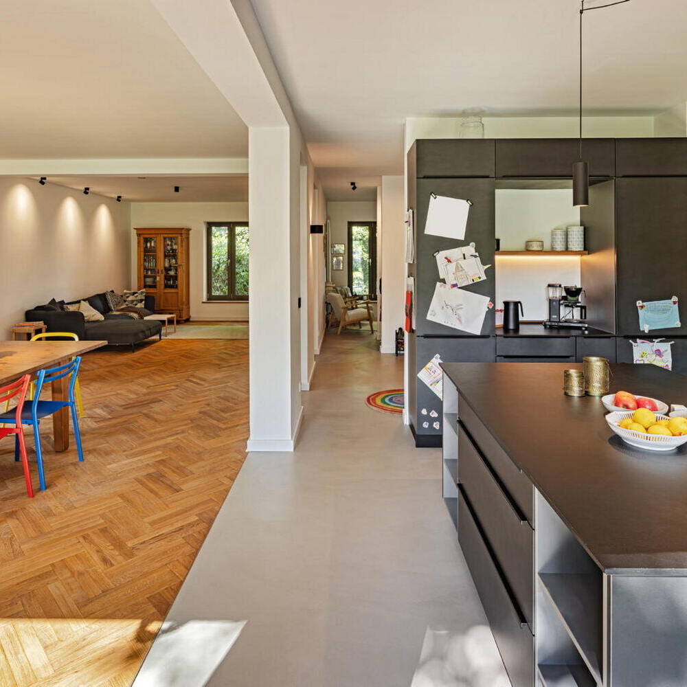 „Wir sind dankbar, wenn wir schon beim ersten oder zweiten Besichtigungstermin mit eingeschaltet werden. Bauherren gehen schnell und zu Recht sehr emotional in solche Besichtigungen, wir schauen schon auf etwaige Möglichkeiten für Weiterentwicklungen“, weist Ole Wetterich hin. Da die Heizungs- und Sanitäranlagen sowie die Elektrik noch aus dem Ursprungsjahr stammten, wurden die technischen Anlagen umfassend erneuert. Der angestrebte Energieeinsparstandard eines Effizienzhauses 50 EE wurde durch Dämmung, eine Luft-Wärmepumpe sowie eine geregelte Lüftungsanlage erreicht. Außerdem wurde eine PV-Anlage installiert. Der Wunsch der Familie nach einem kommunikativen, offenen Haus für vier konnte durch Eingriffe in den Grundriss erreicht werden. Die tragende massive durchlaufende Mittelwand spielt nun mit neu gesetzten Öffnungen. Ein großer Durchbruch zur Küche und klar gesetzte hohe Durchgänge in den großzügigen Eingangsbereich erweitern den Wohnraum und lassen immer wieder spannende Durchblicke zu. Ein großes Sitzfenster ergänzt den Essbereich und gibt einen traumhaften Blick in den Garten frei, der durch eine große Schiebetür von der dem Esszimmer angeschlossenen Küche aus erreichbar ist. Um das Eichenparkett im Erdgeschoss zu erhalten, das nach der Aufarbeitung in neuem Glanz erstrahlt, wurde auf eine Fußbodenheizung verzichtet. Ein neu eingebrachter Spachtel-Bodenbelag liegt nun vis-à-vis neben dem Fischgrät-Parkett, so dass der alte und neue Grundriss ablesbar sind. Im offenen, reduziert gehaltenen Eingangsbereich führt die ursprüngliche Massivholztreppe zu den oberen Geschossen, in denen zwei Kinderzimmer, ein Kinderbad sowie ein Arbeitszimmer verortet sind. Auch der Wäscheschacht, den sich die Bauherren vom Obergeschoss bis in den Keller wünschten, konnte realisiert werden. „Er hat uns entwurflich zwar unsere gerade Linie durchkreuzt, aber letztlich steht der Nutzen für die Familie im Vordergrund“, beschreibt Ole Wetterich die ausgehandelten Kompromisse. Eine neue Treppe, teils vom Schreiner und teils vom Schlosser gefertigt, verbindet als Erlebnismöbel über eine Galerie das Elternschlafzimmer sowie das Elternbad mit den Wohnbereichen und schafft so eine offene Kommunikation über alle Etagen.