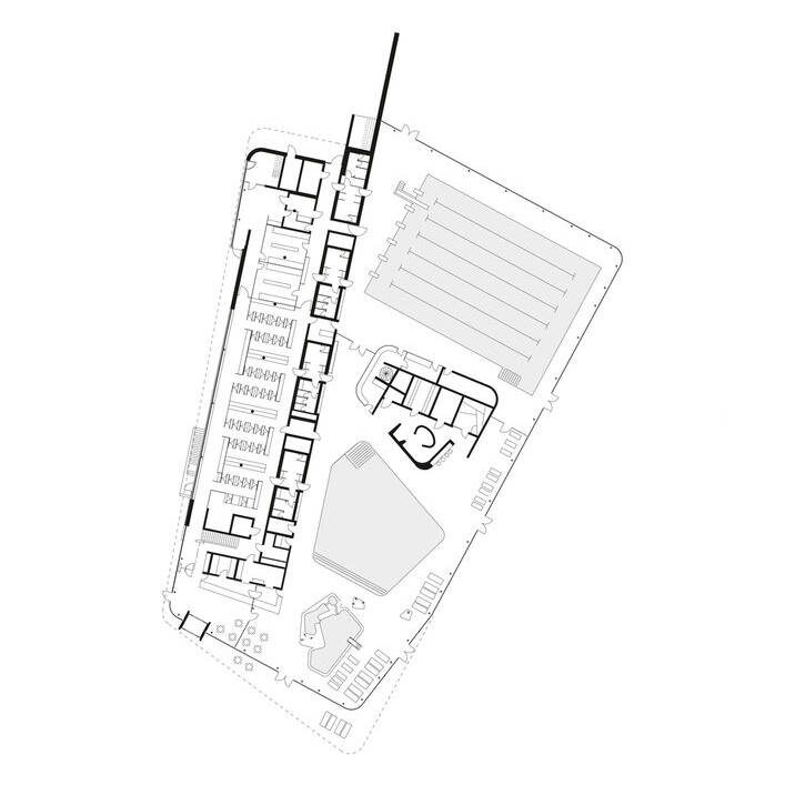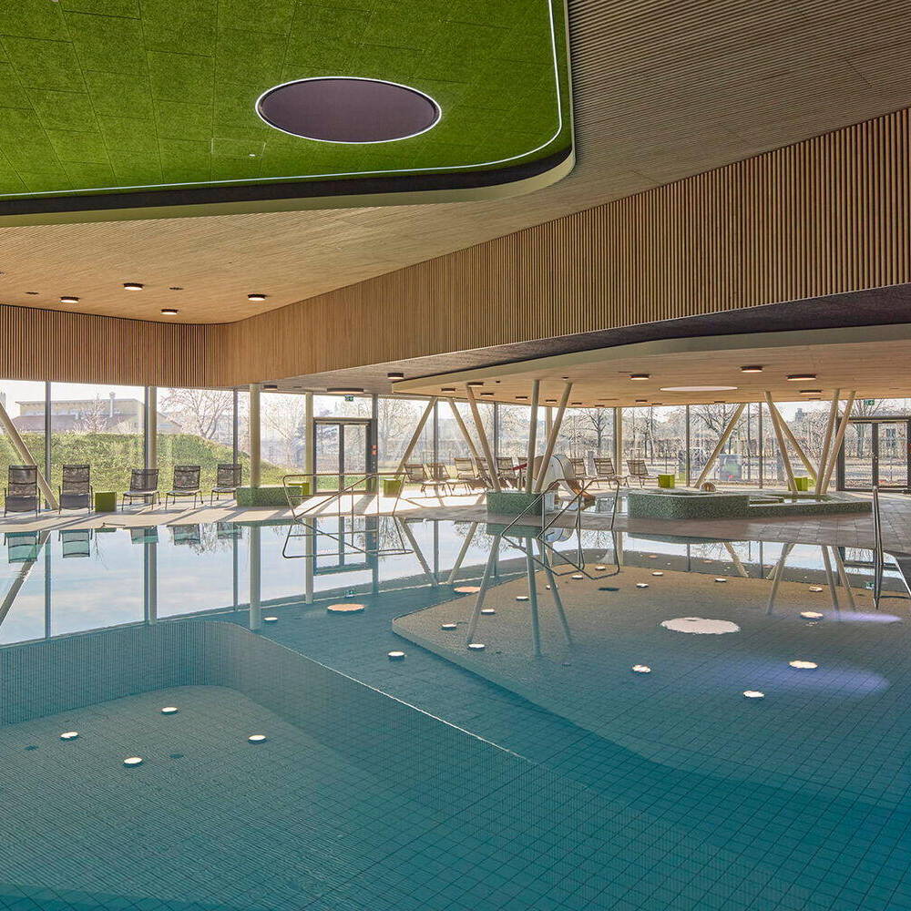 Eine Besonderheit des umgesetzten Entwurfs: Die Wellnesszone befindet sich in der Mitte zwischen dem großen Becken und den beiden kleineren. Die Bereiche sind baulich durch eine Glaswand getrennt, wie etwa für Sportveranstaltungen im großen Bad mit seinen sechs Bahnen à 25 Meter oder das Lehrschwimmbad, wenn Schwimm- oder Acqua-Fit-Kurse stattfinden. Die „Entspannungsoase“ bietet ein Dampfbad, eine Bio-Textil-Sauna, ein Tauchbecken und dazu eine Fläche mit Liegen. Der Riegel mit den Umkleiden in Gelb liegt zur Straße hin, er schirmt so den Badebereich gegen Lärm ab und dient zudem als Sichtschutz. Die Glasspinde und Umkleiden weisen einen Farbverlauf in unterschiedlichen Grüntönen auf – von Blaugrün über Grün hin zu Hellgrün. Auf der anderen Seite, nach Süden hin, kragt ein Teil des Daches aus, darunter befindet sich ein Liegebereich mit schönem Blick auf den begrünten Außenraum. Zur Straße hin ist für genügend Parkplätze mit Ladestationen sowie für eine überdachte Fahrrad-Abstellfläche gesorgt. Für jeden Bedarf ist etwas dabei: Für die ganz Kleinen das Planschbecken samt Elefantenrutsche, für ganze Familien, für Schulkinder oder Freizeitsportler und Erholungsuchende.