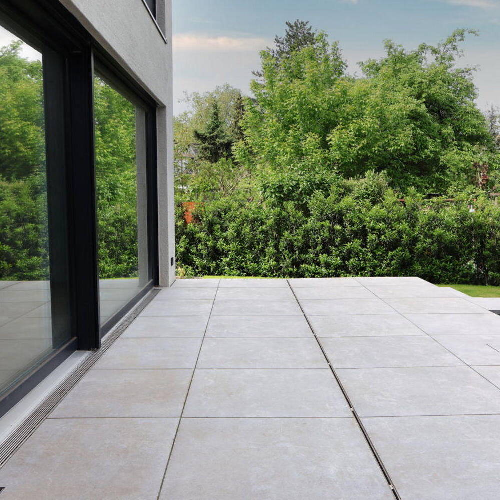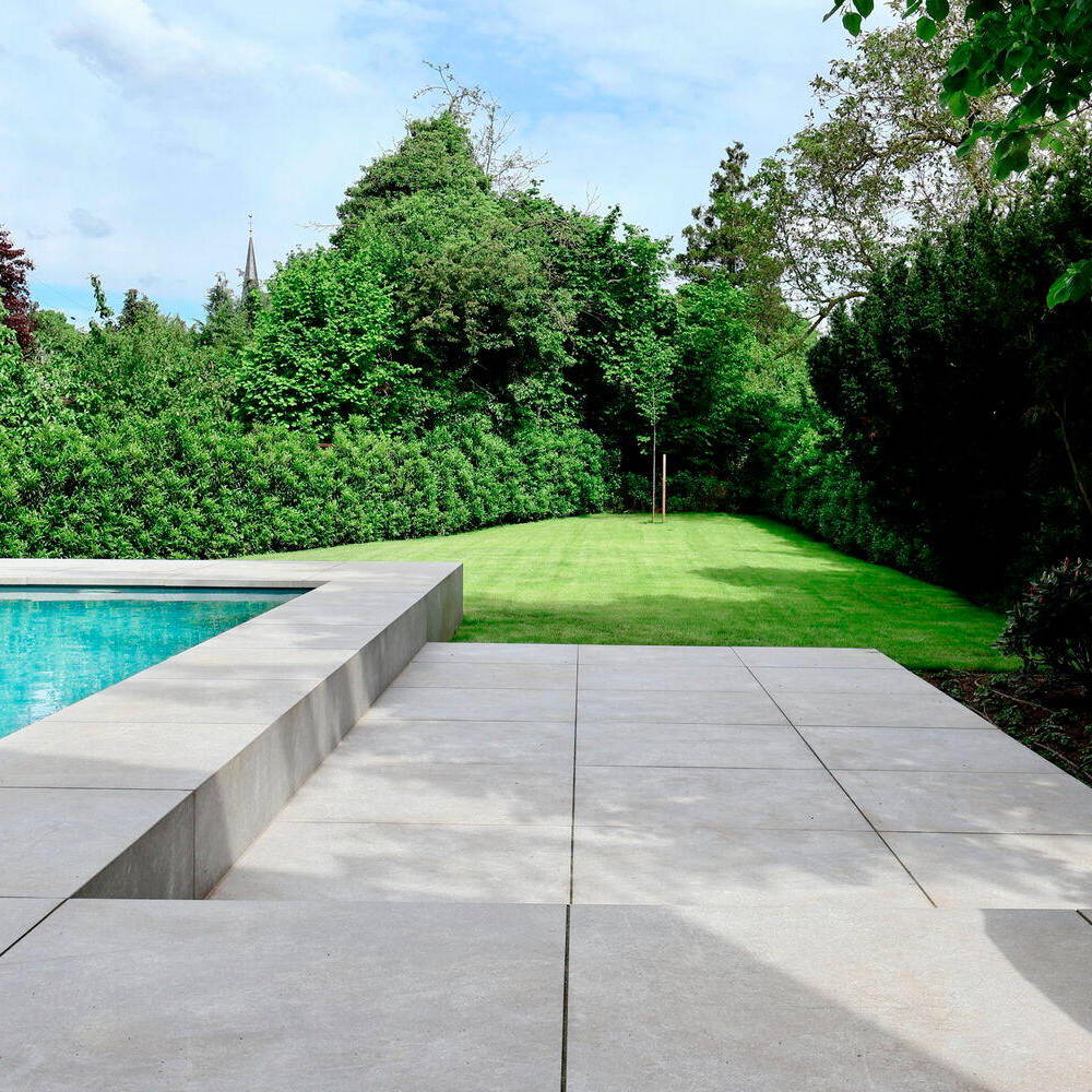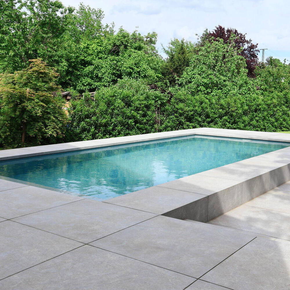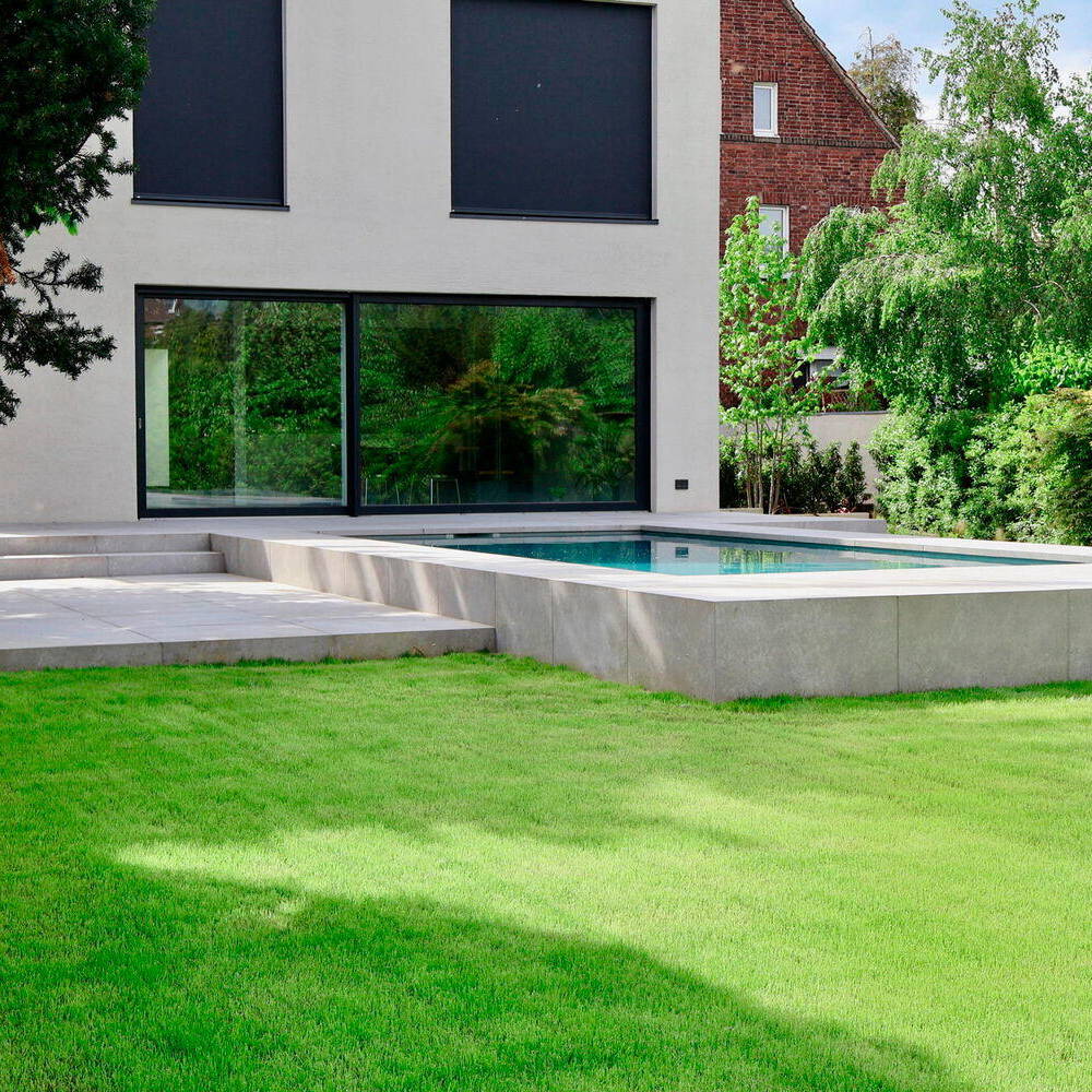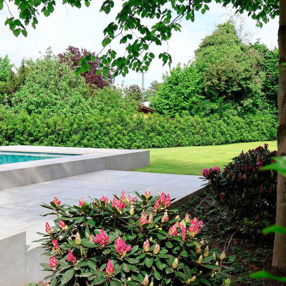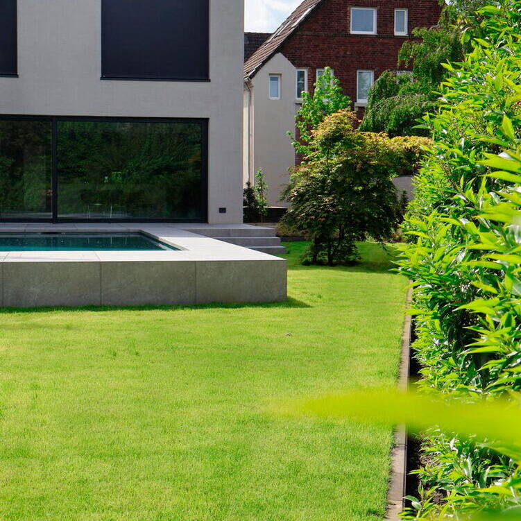 Zwischen Rasenfläche und Haus befindet sich die Terrasse aus hellem, pflegeleichtem und hitzeabweisendem Feinsteinzeug von Ceramica Grande. Das hier gewählte großzügige Fliesenformat von einem Quadratmeter sorgt für wenige Fugen, wodurch Grünspan gemindert wird. Im Bereich der Stufen-, Pool- und Sonderformteile kommen Fliesen nach Maß zum Einsatz. Während die Terrasse auf der einen Seite in eine Treppe übergeht, die zum Rasen führt, endet sie auf der anderen Seite am Pool. Dank einer Dosieranlage, Salzelektrolyse und einem Poolroboter handelt es sich hierbei um ein autarkes System. „Beim Einbau des Pools ergaben sich einige Herausforderungen“, erinnert sich Julian Browa. So wurde der bauseits gesetzte Pool zu hoch und damit falsch eingebaut. „Eine Schwierigkeit, die durch das Anpassen des Gefälles, der Terrassenneigung und durch den Einbau einer Schlitzrinne gelöst wurde.“ Bei der Bepflanzung wurden sommerlang blühende Rispenhortensien eingesetzt. In Kombination mit der Staudenmischung „Indian Summer“, die in den Farben Gelb, Rot und Weiß blüht, ergibt sich ein Garten mit einem schönen Farbenspiel. Im Schattenbereich sorgen verschieden farbige Rhododendren im Frühjahr für tonangebende Hingucker. Neben optischen Gründen kamen bei der Wahl der Bepflanzung auch ökologische Aspekte zum Tragen: Schließlich freut sich nicht nur das Auge über die Staudenmischung, sondern auch jede Menge Insekten und Bienen. Einheimische Bäume und die Anlage von Nutzgärten für den Anbau von Kräutern und Gemüse spiegeln ebenfalls das Umweltbewusstsein der Bauherrn wider. Alles in allem ist ein Garten entstanden, der zum Design des Hauses passt, ökologische Aspekte berücksichtigt und dabei sehr pflegeleicht ist. Während ein Beregnungssystem für sprießende Pflanzen sorgt, hält ein Mähroboter die Rasenfläche in Form. Hinzu kommt, dass das Browa-Team einmal im Monat unerwünschten Aufwuchs wie Wild- und Unkräuter in den Beeten entfernt und sich um den Staudenrückschnitt sowie den Hecken-/Baum-/Gehölzschnitt kümmert.