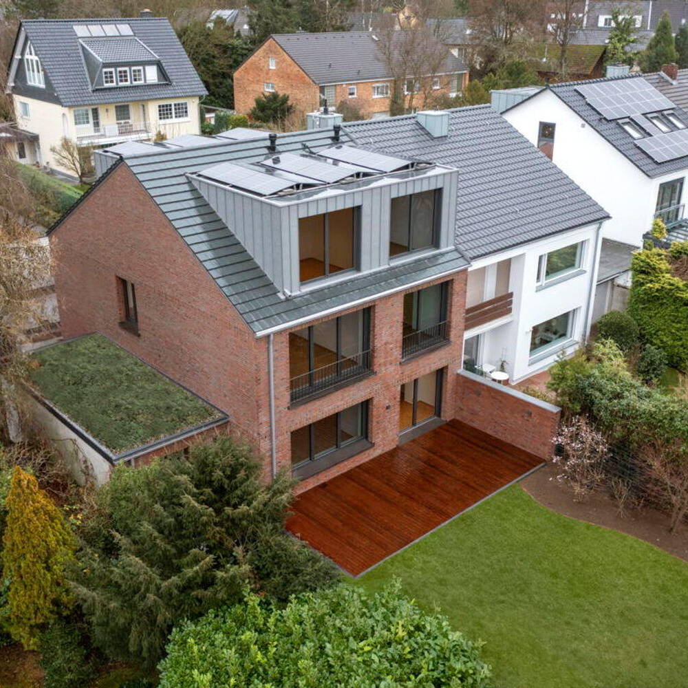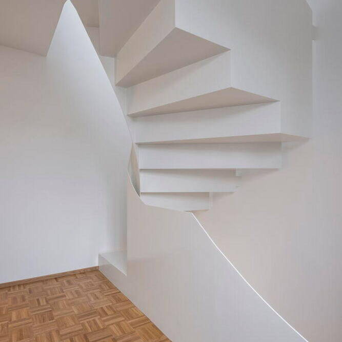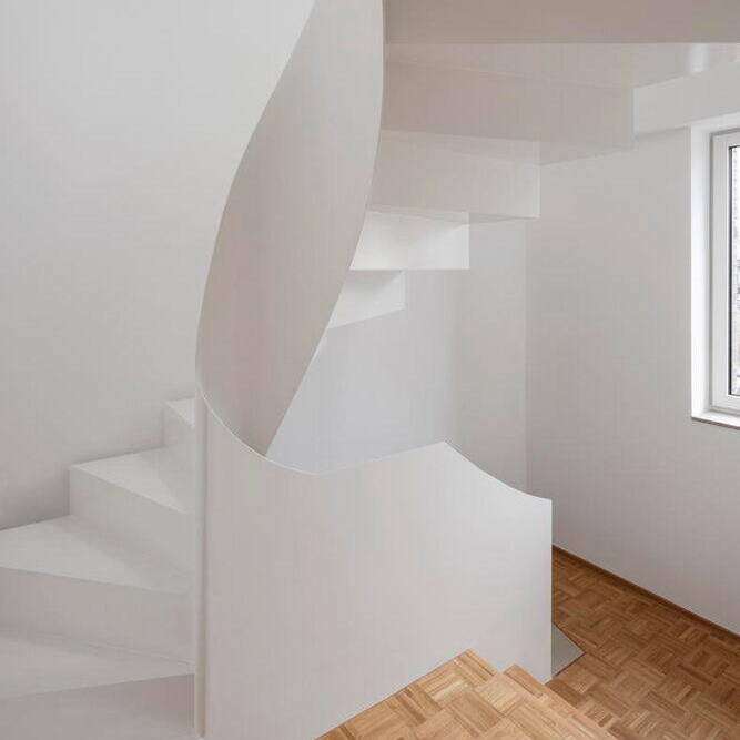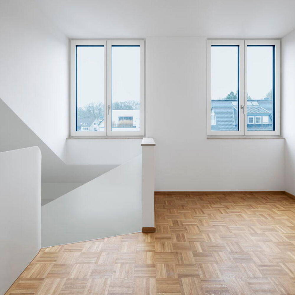 Eine hochwertige, mineralische Dämmung und eine neue Vorsatzschale aus robusten Vollklinkern verbessern nicht nur das Raumklima, sondern machen die Fassade auch auf lange Sicht wartungsarm. Die neuen Holz-Aluminium-Fenster werden durch den dunkelroten Klinker und die neuen massiven Natursteinsohlbänke harmonisch eingerahmt. Das Dach sticht durch seine beiden neu hinzugefügten Gauben hervor. Ohne Dachüberstand, mit homogenen, dunklen Flachziegeln und farblich abgestimmten Titanzink-Verkleidungen an den Gauben, hält es sich optisch zugleich dezent im Hintergrund. Die sorgfältig ausgearbeiteten Details verleihen dem Gebäude eine hochwertige Anmutung und sorgen für ein modernes, und doch traditionsbewusstes, klassisches Gesamtbild. Im Inneren blieb die Grundriss-Struktur auf beiden Etagen weitgehend erhalten – allein eine wenig genutzte Loggia wurde geschlossen und in Wohnraum verwandelt. Alle sichtbaren Oberflächen wurden grunderneuert: Fliesen aus Feinsteinzeug in Betonoptik bestimmen die Sanitärbereiche, Küche und Eingangsbereich; ein traditionelles Mosaikparkett aus geölter Eiche wurde in den Wohnbereichen verlegt. Allein die Natursteintreppe zwischen Erd- und erstem Obergeschoss blieb in ihrem makellosen Vorzustand erhalten. Einen neuen Blickfang im Gebäude stellt die skulpturale Wendeltreppe aus weiß lackiertem Stahlblech dar. Sie führt zum ausgebauten Dachboden, der das Haus um ein Apartment mit zwei großzügigen Gauben für die Tochter und deren Familie erweitert. Durch das offene Treppenhaus bleibt der Bezug zu den Räumen der Eltern erhalten. Der offen gestaltete Grundriss umfasst neben den Wohnräumen auch ein Badezimmer und eine kleine Teeküche. Eine komplexe Haustechnik bringt das Haus schließlich auch energetisch auf den neuesten Stand: Neben Luft-Wärmepumpe, zentraler Wohnraumlüftung und Wasserenthärtung wurde auch eine große PV-Anlage auf den Gaubendächern installiert. Die Wärmeversorgung erfolgt über eine neue Fußbodenheizung, die in den Bestandsgeschossen aufgrund der geringen Aufbauhöhe als spezielles Dünnschichtsystem ausgeführt wurde. Ein Smart-Home-System regelt mit seiner KNX-Steuerung zahlreiche Funktionen. Die umfangreiche Anlagentechnik ließ sich im Keller des Hauses bestens anordnen – wobei sich auch noch Platz für eine neue Sauna fand.