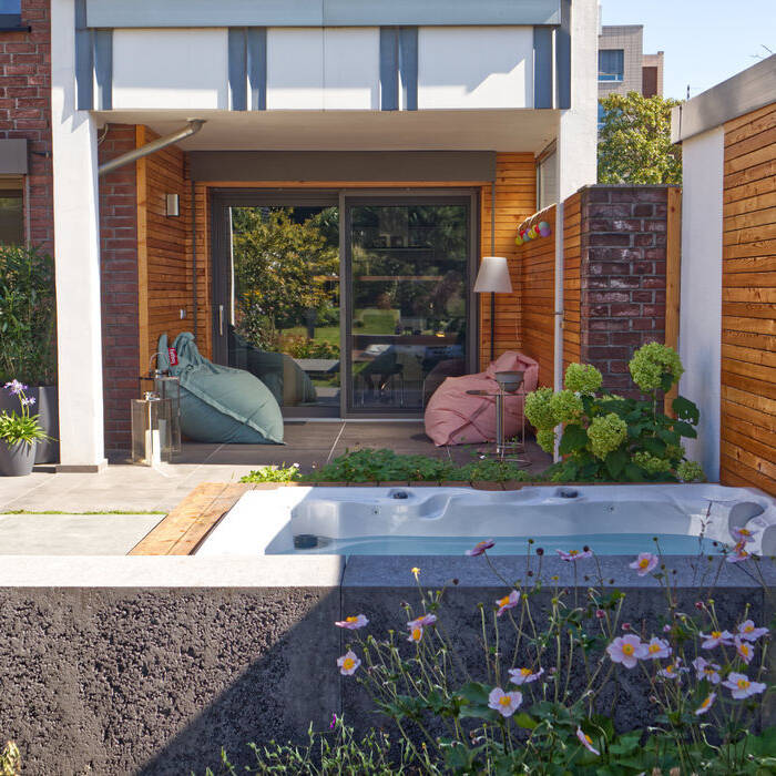 In einer Wohngegend in Oberhausen mit überwiegend freistehenden Ein- bis Zweifamilienhäusern befindet sich ein Wohnhaus mit zwei Einheiten, dessen Garten von Paus Gartendesign von Grund auf neu gestaltet wurde. Die Eigentümer, ein junges Paar, das im Erdgeschoss wohnt, wollten den Garten, der nur aus einer alten Natursteinterrasse, einem Rasen und einem kleinen Beet direkt an der Terrasse bestand, von Grund auf neu gestalten lassen. Ziemlich verloren wirkte auch ein Whirlpool, der einsam auf der Wiese stand, wie sich Daniel Paus an die erste Besichtigung des nur 90 m² großen Gartens erinnert. Der Wunsch nach einem modernen und aufgeräumten Außenraum war nur zu verständlich.