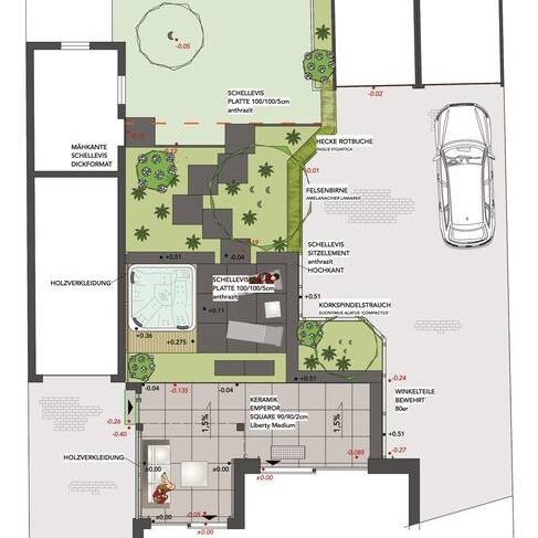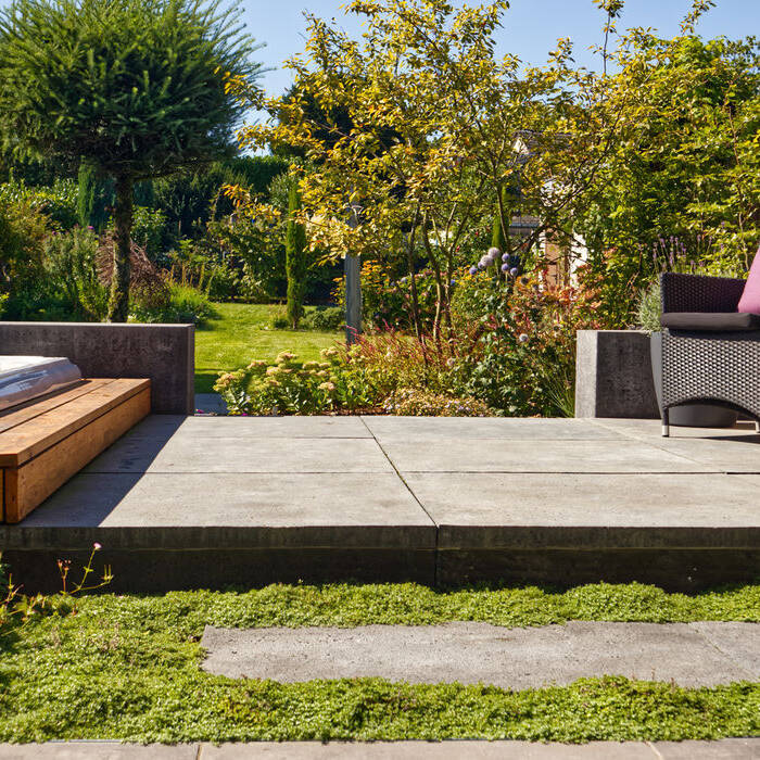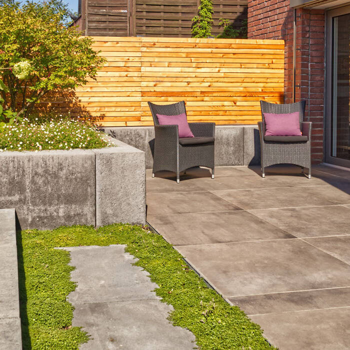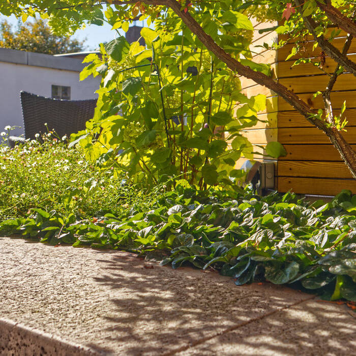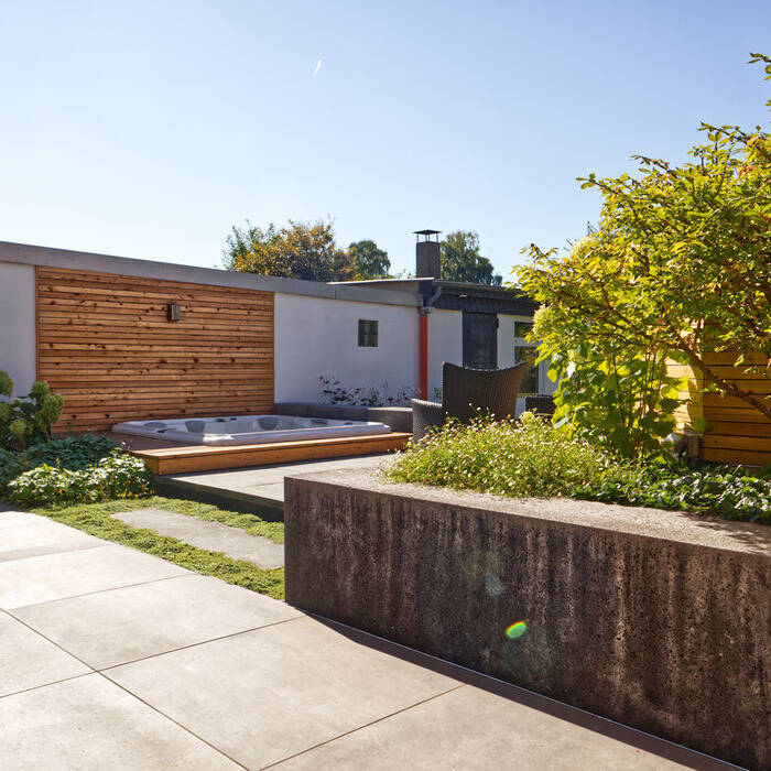 Es ist bisher der kleinste Garten, den der Landschaftsarchitekt aus Hünxe gestaltet hat. „Eigentlich ist es eher ein Gartenzimmer“, beschreibt Daniel Paus das Ergebnis. Direkt aus dem Wohn- und Essbereich kann die großzügige, teilüberdachte Keramikterrasse betreten werden. Der neue Belag in dezenter Betonoptik ist der Fliese im Innenraum ähnlich, so dass der Eindruck der Erweiterung des Wohnraum noch verstärkt wird. Selbst praktische Aspekte wurden dabei berücksichtigt: Die hart gebrannte Oberfläche ist schmutzunempfindlich und die Fugen sind mit einem Fugenmörtel auf Kunstharzbasis verfugt, der Unkraut keinen Nährboden bietet. Über Trittplatten, die den Anschein erwecken, im Thymian zu versinken, gelangt man auf die höher gelegene Sonnenterrasse, in die der Whirlpool nun harmonisch eingebunden ist. Die beiden Gartenbereiche werden von einer Sitzmauer aus Betonelementen miteinander verbunden, die gleichzeitig dem Hochbeet als Stützkante dienen. Eine Besonderheit des Projektes bildet der Mittelteil des Gartens, der von der Mietpartei im Obergeschoss genutzt wird und nicht in die Umgestaltung eingebunden wurde. Gleich dahinter beginnt wieder eine Gartenfläche der Eigentümer:innen, die ebenfalls unberührt blieb, jedoch zum weiten Blick ins Grüne beiträgt. Ein maßangefertigter Rombuszaun dient als Sichtschutz zum gemeinschaftlich genutzten Hof des Hauses. Bei der kompletten Erneuerung des Gartens wurde darauf geachtet, das weiterzuverwendende Material behutsam zu entfernen, um dieses später anderweitig zu nutzen. Der wilde Wein, der an der Garage wuchs, wurde von einem findigen Hobbygärtner abtransportiert und wieder eingepflanzt. Im Zentrum des Pflanzkonzepts steht die Felsenbirne, die im Frühjahr komplett weiß blüht, im Mai schöne rote Beeren bekommt und im Herbst eine intensive rote Herbstfärbung zeigt. Ebenso wie der Korkspindelstrauch, der kräftig rot leuchtet und das restliche Jahr mit seiner korkigen Rinde begeistert. Ein weiteres Highlight im Spätsommer sind die Anemonen. Die solitären Gehölze sowie die Holzwand und die Schattenfuge des Podests können illuminiert werden, so dass der Blick in den Garten auch in der Dämmerung oder bei Dunkelheit attraktiv ist.