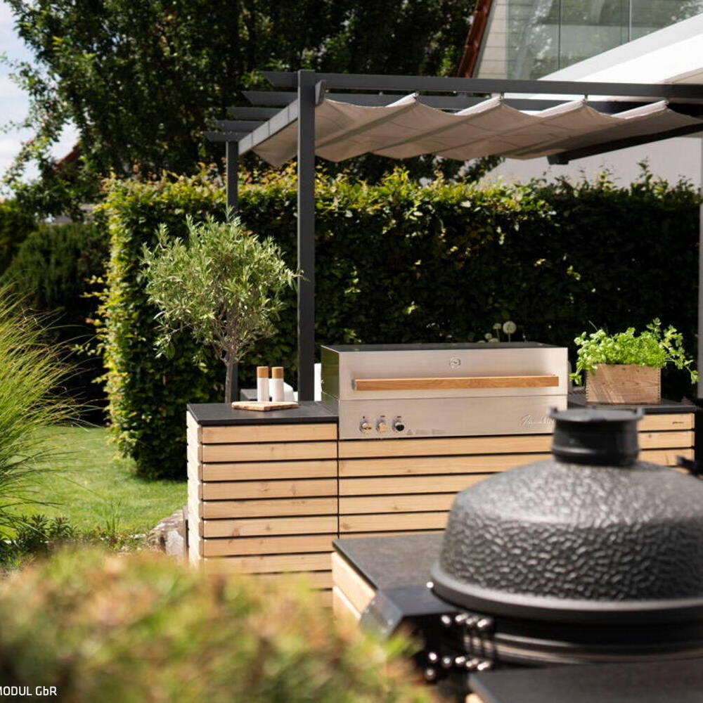 Kochen unter freiem Himmel verbindet Genuss mit Natur und Geselligkeit. Während drinnen oft der Alltag dominiert, bietet die Outdoorküche Raum für Entschleunigung, Kreativität und Lebensfreude. Im Mittelpunkt steht das Kochen mit frischen Kräuterdüften in der Nase, Vogelgezwitscher im Ohr und Sonnenlicht auf der Arbeitsfläche. Besonders schön: Outdoorküchen sind nie von der Stange, sondern lassen sich individuell gestalten – wie etwa mit der BBQtion von Village Garden aus Herzebrock. Gefertigt in Deutschland, überzeugt sie mit zeitlosem Design und wetterfesten Materialien wie HPL, Edelstahl und Hightech-Keramik. Gas- oder Holzkohlegrills, Teppanyaki, Kühlschrank oder Induktion – alles lässt sich maßgeschneidert integrieren.