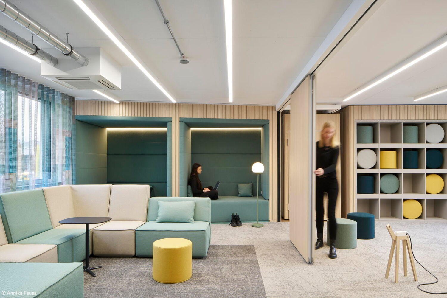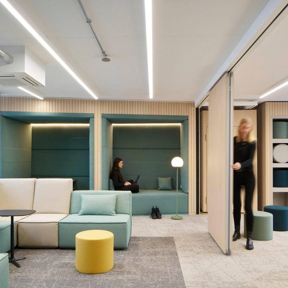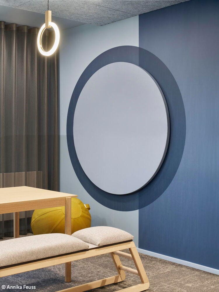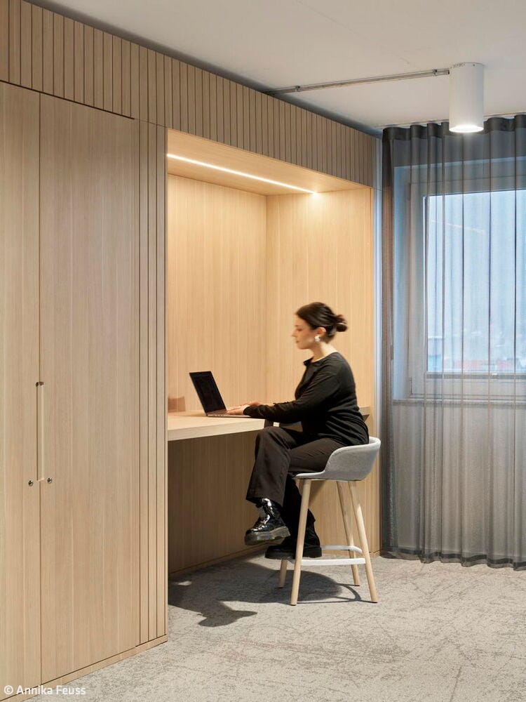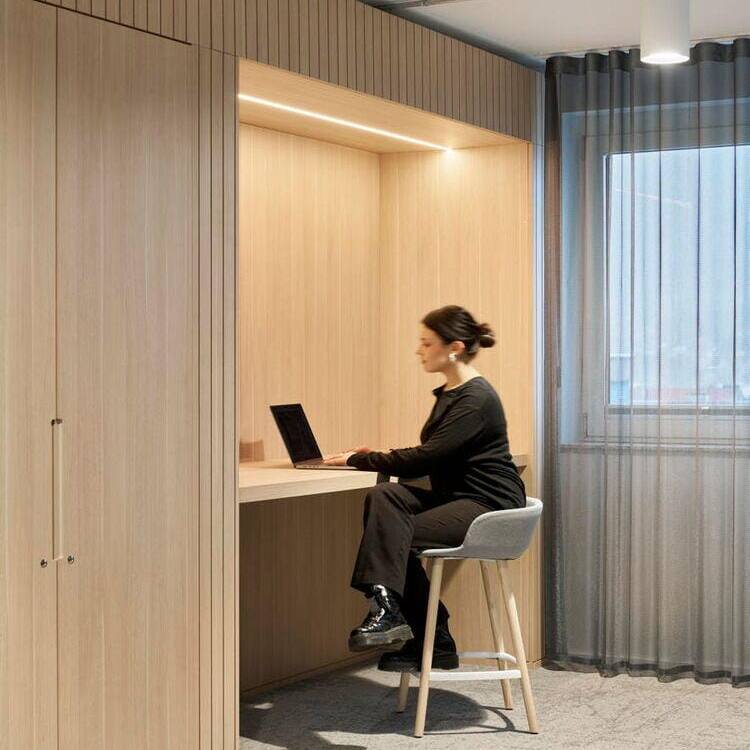 Das Projekt, das über 1.300 m² Bürofläche umfasst, folgt dem Prinzip der partizipativen Planung. In Workshops mit den Mitarbeitenden wurden Anforderungen, Arbeitsabläufe und Nutzerbedürfnisse analysiert und in architektonische Lösungen übersetzt. Das dabei entwickelte Raumkonzept basiert auf dem Quartiersgedanken: Jede der sechs Etagen wurde individuell gestaltet mit eigenen Nischen, Begegnungsorten und Arbeitsbereichen. Der frühere Bürogrundriss wurde dabei konsequent aufgebrochen – Flure wichen einer offenen Zonierung, Zellenbüros wurden durch vielfältige, klar definierte Arbeitsbereiche ersetzt. Das Herzstück jeder Etage bildet ein zentraler Coffeepoint, der als sozialer Treffpunkt fungiert, ergänzt durch modulare Loungezonen, offene Teamarbeitsplätze und ruhige Fokusbereiche. Die funktionale Gliederung folgt dabei einer durchdachten Zonierung: Zentrale Bereiche wie Besprechungsräume, Telefonboxen und Fokusräume sind in der Mittelzone angeordnet, um Begegnung und Austausch zu fördern. Arbeitsplätze und offene Zonen profitieren von der Positionierung an den Fassaden mit viel Tageslicht und Ausblick. Glastrennwände strukturieren die Flächen, schaffen Transparenz und ermöglichen Blickbezüge zwischen den Arbeitsbereichen bei gleichzeitiger akustischer Entkopplung. Beratungsräume wurden zielgruppenspezifisch gestaltet – von der wohnlichen Familienberatung über den flexiblen Studierendenraum bis zum komfortablen Seniorenbereich. Die räumliche Gestaltung folgt dem Prinzip der Wahlfreiheit für unterschiedliche Arbeitsweisen, Stimmungen und Aufgaben. Mobile Elemente, multifunktionale Möbel und eine fein abgestimmte Licht- und Akustikplanung unterstützen sowohl die tägliche Arbeit als auch informelle Begegnungen. Die natürliche, warme Grundatmosphäre entsteht durch Holzoberflächen, hochwertige Stoffe und strukturierte Paneele. Etagenweise variierende Material- und Farbkonzepte lassen zusätzliche Stimmungen entstehen – analog zum Quartiersgedanken wirkt der Innenraum wie ein Spaziergang durch verschiedene Straßenzüge. Die Farbgestaltung spiegelt zugleich aber auch die Unternehmensidentität der GWG wider.