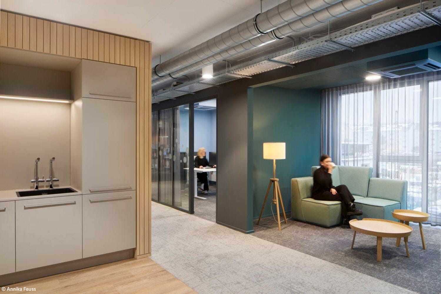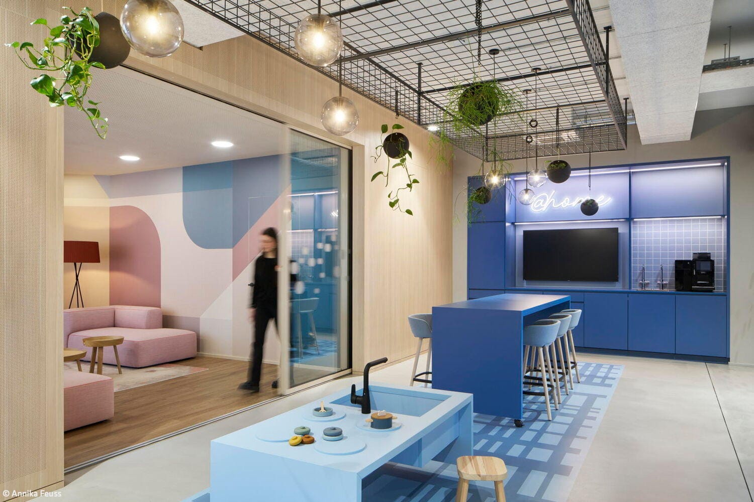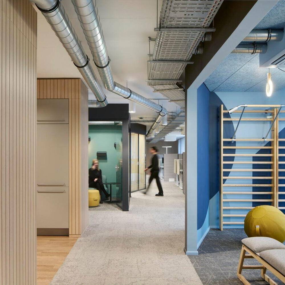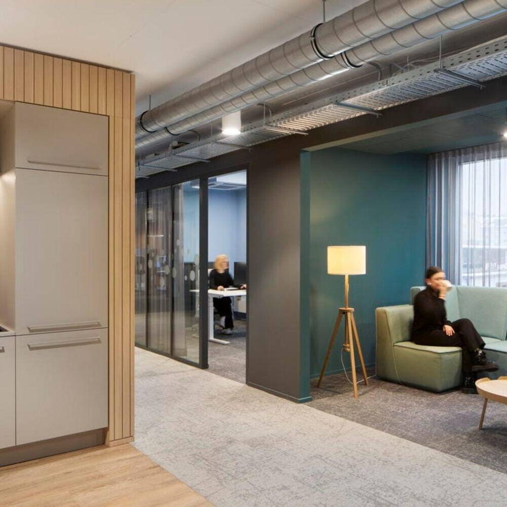 Das Projekt, das über 1.300 m² Bürofläche umfasst, folgt dem Prinzip der partizipativen Planung. In Workshops mit den Mitarbeitenden wurden Anforderungen, Arbeitsabläufe und Nutzerbedürfnisse analysiert und in architektonische Lösungen übersetzt. Das dabei entwickelte Raumkonzept basiert auf dem Quartiersgedanken: Jede der sechs Etagen wurde individuell gestaltet mit eigenen Nischen, Begegnungsorten und Arbeitsbereichen. Der frühere Bürogrundriss wurde dabei konsequent aufgebrochen – Flure wichen einer offenen Zonierung, Zellenbüros wurden durch vielfältige, klar definierte Arbeitsbereiche ersetzt. Das Herzstück jeder Etage bildet ein zentraler Coffeepoint, der als sozialer Treffpunkt fungiert, ergänzt durch modulare Loungezonen, offene Teamarbeitsplätze und ruhige Fokusbereiche. Die funktionale Gliederung folgt dabei einer durchdachten Zonierung: Zentrale Bereiche wie Besprechungsräume, Telefonboxen und Fokusräume sind in der Mittelzone angeordnet, um Begegnung und Austausch zu fördern. Arbeitsplätze und offene Zonen profitieren von der Positionierung an den Fassaden mit viel Tageslicht und Ausblick. Glastrennwände strukturieren die Flächen, schaffen Transparenz und ermöglichen Blickbezüge zwischen den Arbeitsbereichen bei gleichzeitiger akustischer Entkopplung. Beratungsräume wurden zielgruppenspezifisch gestaltet – von der wohnlichen Familienberatung über den flexiblen Studierendenraum bis zum komfortablen Seniorenbereich. Die räumliche Gestaltung folgt dem Prinzip der Wahlfreiheit für unterschiedliche Arbeitsweisen, Stimmungen und Aufgaben. Mobile Elemente, multifunktionale Möbel und eine fein abgestimmte Licht- und Akustikplanung unterstützen sowohl die tägliche Arbeit als auch informelle Begegnungen. Die natürliche, warme Grundatmosphäre entsteht durch Holzoberflächen, hochwertige Stoffe und strukturierte Paneele. Etagenweise variierende Material- und Farbkonzepte lassen zusätzliche Stimmungen entstehen – analog zum Quartiersgedanken wirkt der Innenraum wie ein Spaziergang durch verschiedene Straßenzüge. Die Farbgestaltung spiegelt zugleich aber auch die Unternehmensidentität der GWG wider.