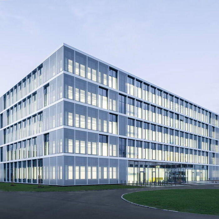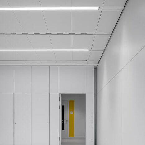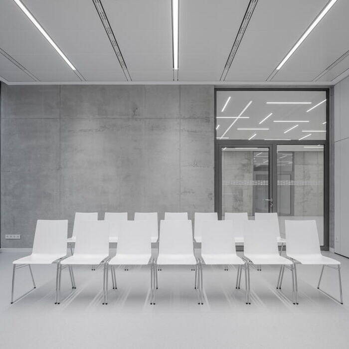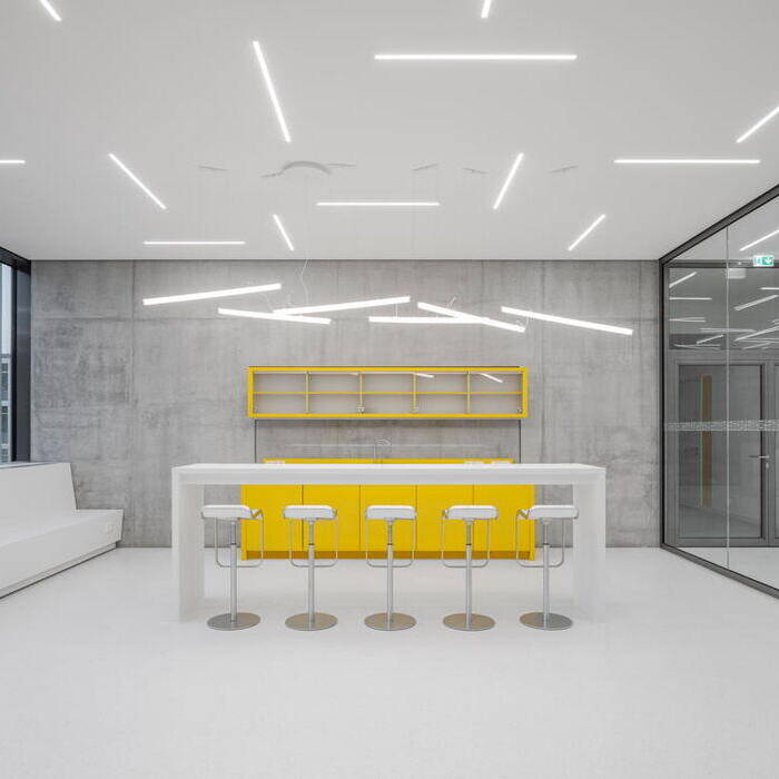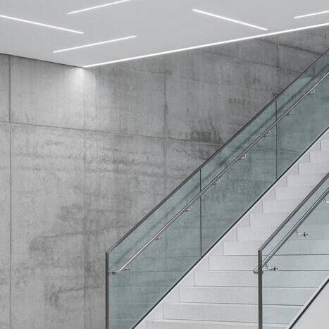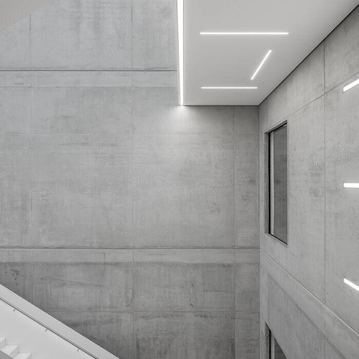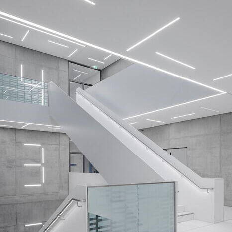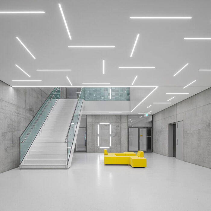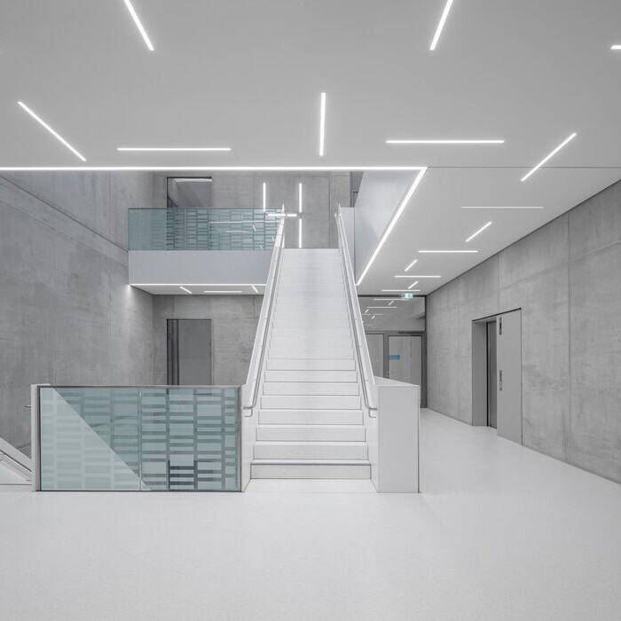 Der Entwurf stammt von den doranth post architekten aus München, die eine durchgehende homogene Gestaltung aus einem vorgesetzten Raster von Fassadenprofilen gestalteten, um einen klar ablesbaren Kubus zu definieren und so die Präsenz auf dem Campus zu betonen. Die Eckbereiche des Gebäudes werden noch zusätzlich durch vorgesetzte, flächige, mit Textilgewebe bespannte Rahmen gefasst, wodurch die Raumkanten des Volumens im Kontext der Umgebung gestärkt werden. Die Besonderheit des BerlinBioCube liegt nicht nur in seiner hochmodernen Ausstattung und den umfassenden Forschungseinrichtungen, sondern auch in der Lichtplanung, die das Ingenieurbüro FaktorLicht aus Filderstadt kreativ integriert hat. „Klare Linien und ein strenges Materialkonzept zeichnet die Architektur des Gebäudes aus. Mit dem aus unterschiedlichen linearen Komponenten bestehenden Beleuchtungskonzept wurden diese klaren Linien aufgegriffen und betont. Gleichzeitig ist aber mit den orthogonal angeordneten, schmalen Lichtlinien auch ein fast verspieltes, auflockerndes Element miteingeflossen“, erläutert Philipp Haas von FaktorLicht. Eine besondere Herausforderung stellte dar, die Kennzeichnung der Stockwerke mit Betoneinbau-Lichtkanälen zu realisieren. Die individuellen Lichtkanäle und Lichtlinien des Herstellers LTS erfüllten die Anforderungen perfekt. Die scheinbar willkürlich angeordneten Lichtkanäle in den Kommunikationsbereichen brechen bewusst die geradlinige Struktur auf und erhöhen die Aufenthaltsqualität. Die maßgeschneiderten Lichtkanäle für den Betoneinbau wurden in Deutschland produziert und sind ein herausragendes Beispiel für die Integration von Funktionalität und Design. Diese Lichtkanäle, die passgenau in den Sichtbeton eingelassen sind, formen überdimensionale Etagenzahlen, die in „Digital-Nummerierung“ leuchten. Sie sorgen für eine angenehme Grundbeleuchtung und setzen ästhetische Akzente.