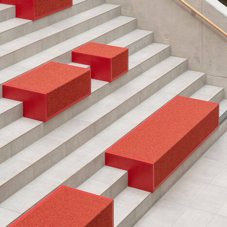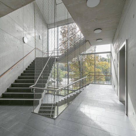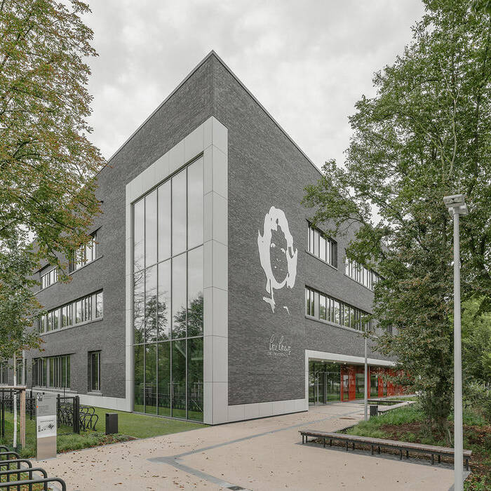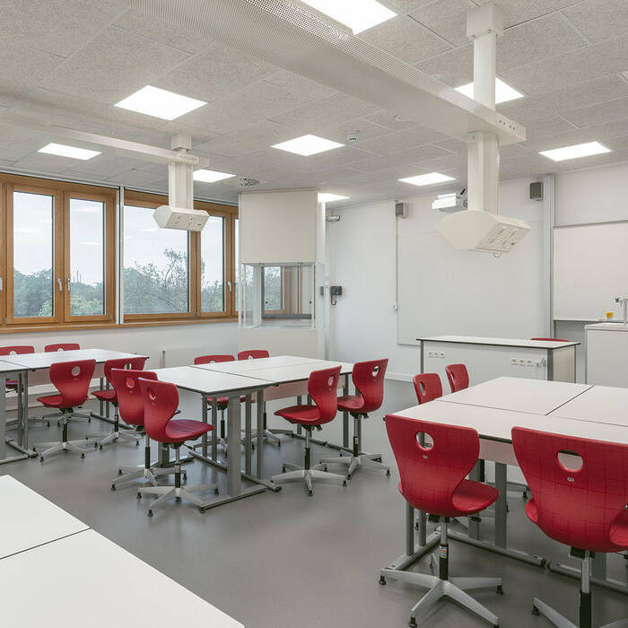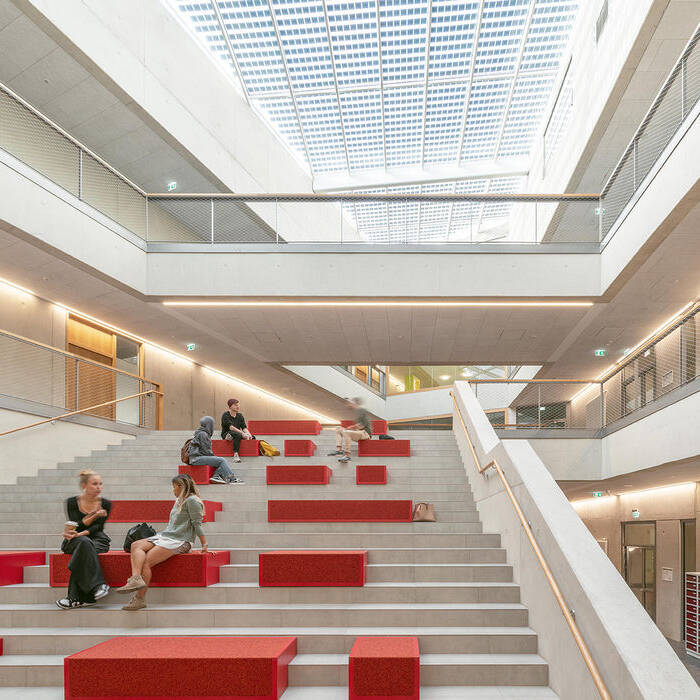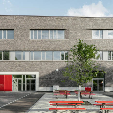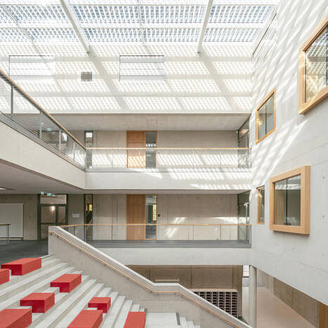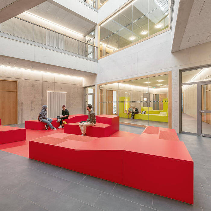 Die äußeren Konturen des Neubaus orientieren sich dabei am Grundstück, das sich an einer städtebaulich prägnanten Stelle im Kreuzungsbereich zwischen Schloßallee und Heidelberger Straße befindet. Um auf der schallabgewandten Seite einen geschützten Pausenhof zu schaffen, wurde der Neubau soweit wie möglich an die städtebaulich definierte Grenze der stark befahrenen Heidelberger Straße herangerückt. Wie der Nachbarbau auf der gegenüberliegenden Straßenseite ist das Gebäude durch eine vorgehängte Klinkerfassade geprägt. Eine symbolische Brücke zum Bestand schlägt der Eingangsbereich, der den auffälligen Rotton des gegenüberliegenden Gebäudes aufgreift. Beide Gebäude kommunizieren so über die Straße hinweg und werden als eine gemeinsame Einheit wahrgenommen. Erstmals bei einem Berufskolleg wurde bei der Planung ein Clusterkonzept für die Klassenräume umgesetzt: Jeweils zwei Cluster mit drei Klassenräumen sind dabei um einen offenen Lernbereich mit Sanitärzone und Lehrmittelraum gruppiert und werten die Verkehrsfläche zu einer schulisch nutzbaren Fläche auf. Dieses Raumschema wiederholt sich auch im nördlichen und westlichen Teil des Gebäudes. Bemerkenswert ist in dem Schulneubau zudem die zentrale atriumartige Halle, die von einem offenen Glasdach belichtet und von einer langen Sitztreppe geprägt wird. Die Treppe aus Sichtbeton und roten multifunktionalen Sitzelementen erschließt alle Etagen zentral und fungiert dabei als kommunikatives Zentrum und „Herz der Schule“. Auch für Veranstaltungen bietet sie mit direkter Anbindung an die Aula vielfältige Bespielungsmöglichkeiten. Im ersten Obergeschoss befinden sich die Schulverwaltung und ein Selbstlernzentrum. Der Bereich für das Lehrpersonal schließt sich über dem Haupteingang an, mit einem Gemeinschaftsraum und weiteren Besprechungsräumen. Auf dem zweiten Obergeschoss befinden sich schließlich die naturwissenschaftlichen Fachräume mit einem zusätzlichen zentralen Sammlungsraum. Alle Etagen werden dabei von Galerien erschlossen, die sich offen um die zentrale Halle legen.