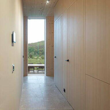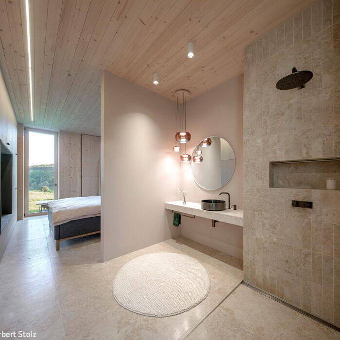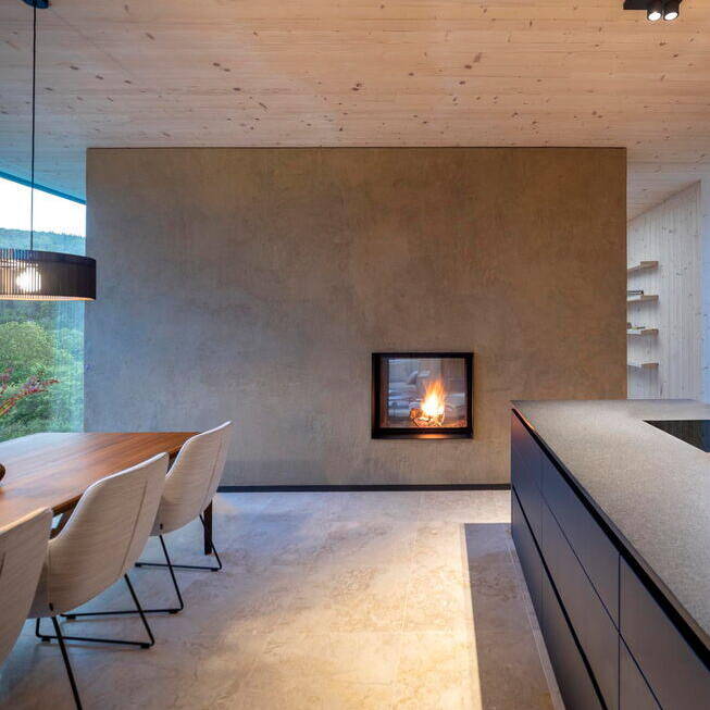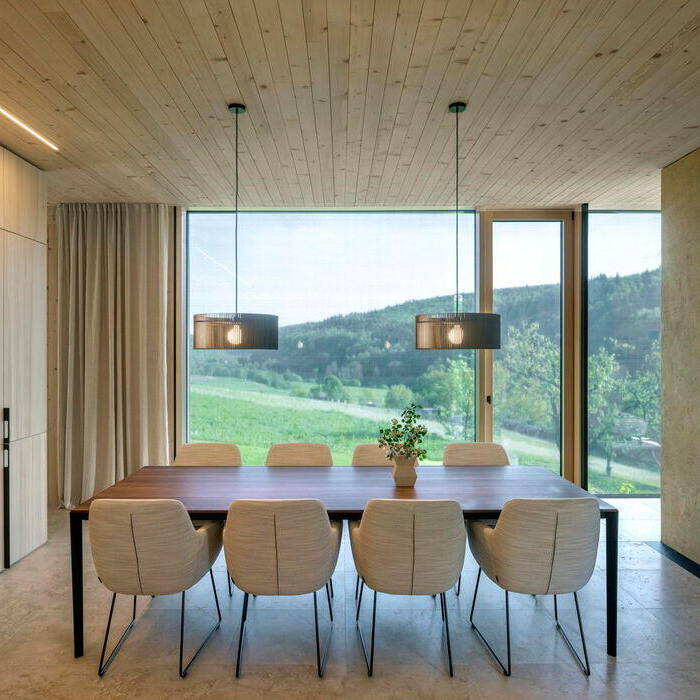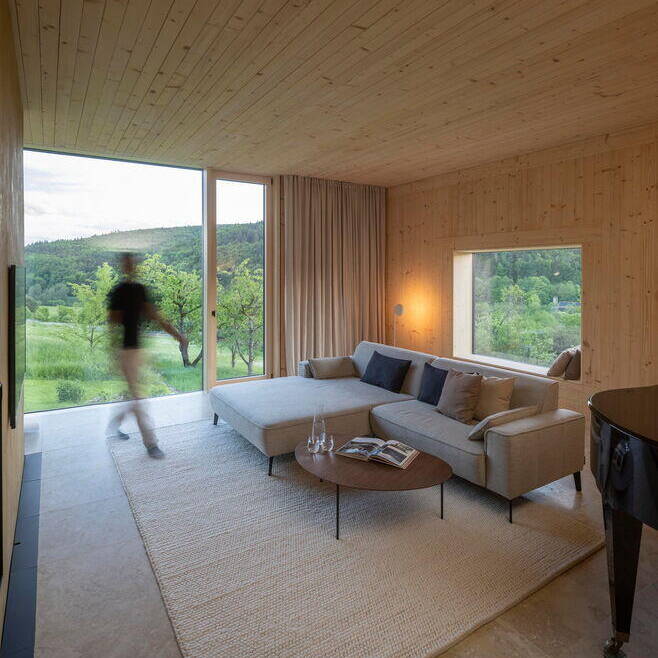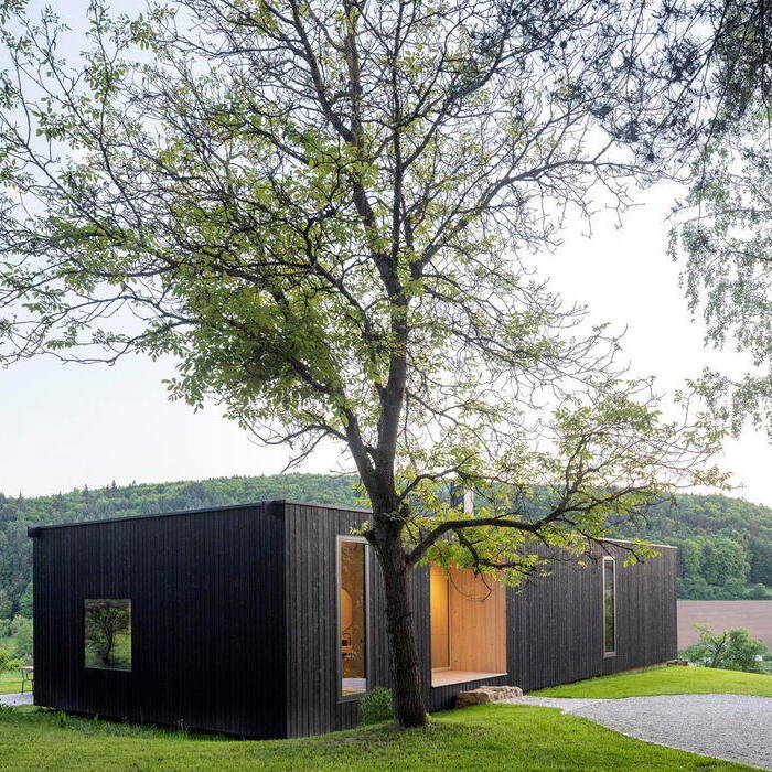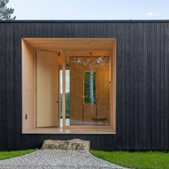 Das neue Wohngebäude für ein Paar thront auf einem Hügel mit Weitblick gen Süden auf das Naabtal in der Oberpfalz. Der junge Architekt Severin Queck hat es „Komorebi” genannt, ein japanischer Begriff für die Poesie der Stimmung, wenn Sonnenlicht durch die Blätter eines Baumes fällt. Auch die Behandlung der Holzverschalung aus japanischer Zeder wurde der in Japan gebräuchlichen Technik „Yakisugi” abgeschaut. Darunter versteht man die Erhöhung der Witterungsbeständigkeit des Holzes durch leichtes Verkohlen, was dieses resistent gegen Wasser, Schimmel, Fäulnis und Ungezieferbefall macht. Das ist der eine Effekt. Der andere ist ein ästhetischer: Die Fassade erhält eine ansprechende Optik. Die Bauherren wünschten sich ein Haus inmitten der Natur, aber auch in Einklang mit ihr. Dies ist absolut gelungen.