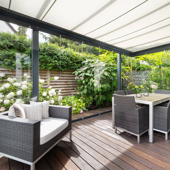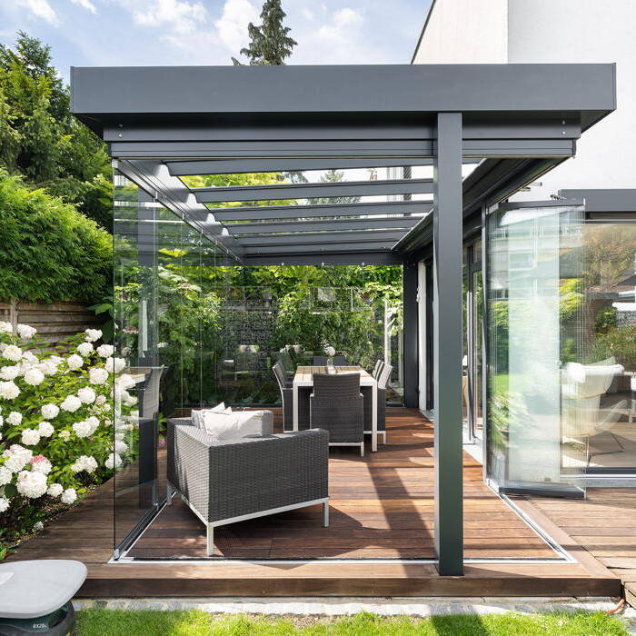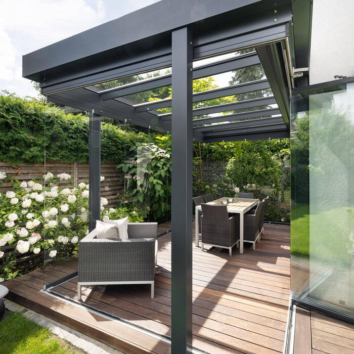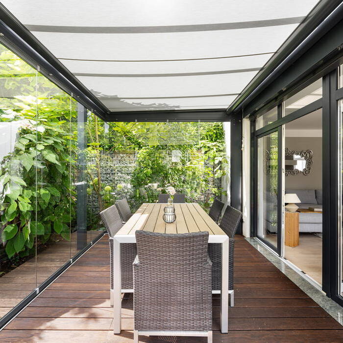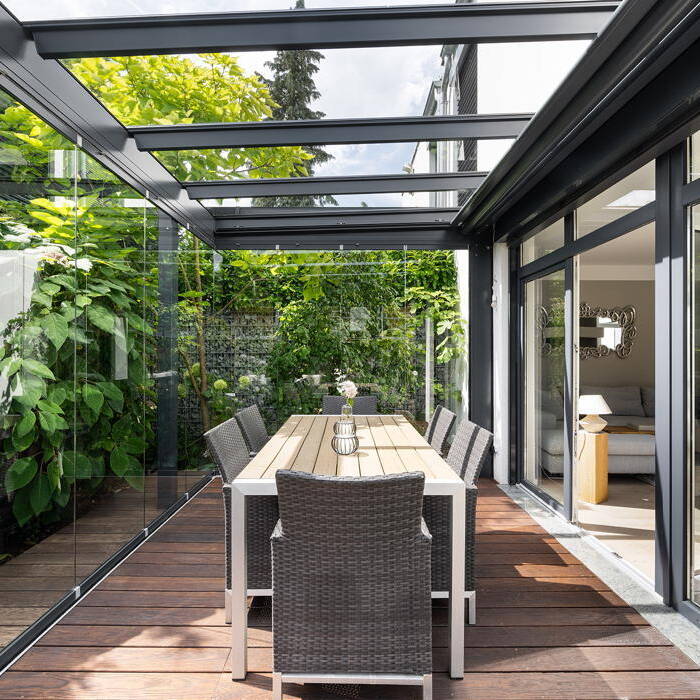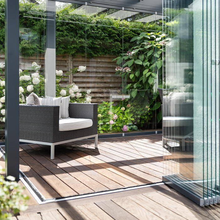 Verwirklicht wurde ein freitragendes kubisches Glashaus mit sehr großzügiger Durchgangshöhe von 2,45 m und komplett zu öffnender, rahmenloser Schiebe-Drehverglasung (Proline T). Eingerückte Stützen mit großen Überhängen erzeugen drei Ganzglas-Ecken im geschlossenen Zustand und gewährleisten im geöffneten Zustand eine freies Bewegen zwischen den beiden Terrassen.
