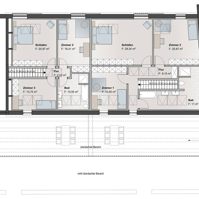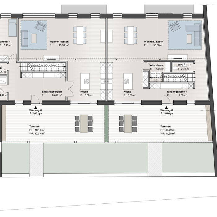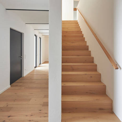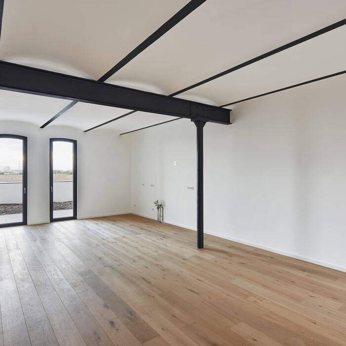 In Absprache mit dem Denkmalamt wurden in einem Teil der alten Reitställe zwei großzügige Wohneinheiten mit 160 und 180 m² auf zwei Etagen bis hin zum Spitzboden der alten Scheune geschaffen. Die Wohnungseingänge wurden dabei gezielt an die äußere Seite der Hofanlage platziert, um den fortwährenden Reitbetrieb nicht zu beeinträchtigen und zugleich einen „Haus im Haus“-Charakter zu erhalten. Um ausreichend Tageslicht in die Räumlichkeiten zu lassen, wurde ein Teil der benachbarten Scheune zum Außenbereich hin rückgebaut. Der erhaltene Teil der Scheune dient nun als Überdachung und schafft einen geschützten Terrassenbereich für die Wohneinheiten. Die Bewohner:innen können so den Innenhof genießen – mit Ausblick über die benachbarten Felder. Transparente Glasziegel im Terrassendach hellen nicht nur die Terrasse auf, sondern durchfluten auch die Räume der rückseitigen Nordfassade mit natürlichem Tageslicht. Nach Süden zum Innenhof hin ermöglichen dagegen großzügige Öffnungen eine visuelle Verbindung zum Reiterhof und schaffen eine offene und einladende Atmosphäre. Im Erdgeschoss sind großzügige, offene Bereiche für tägliche Aktivitäten wie Kochen, Essen und Wohnen entstanden, während im Obergeschoss die privaten Rückzugsorte geschaffen wurden. In einer der beiden Wohneinheiten strukturiert zudem ein zentraler Raumkern das Erdgeschoss und bildet einen funktionalen Knotenpunkt mit Treppe ins Obergeschoss, Gäste-WC und Hauswirtschaftsraum. Mit großem Respekt für die historische Bausubstanz wurden im Erdgeschoss die alte Kappendecke und die Stahlkonstruktion aufgearbeitet und eindrucksvoll in Szene gesetzt. Im Dachgeschoss blieben die alten Balken des außergewöhnlichen Dachstuhls an vielen Stellen sichtbar. Die Verwendung von warmen, naturverbundenen Materialien schafft in allen Räumen ein angenehmes Raumgefühl. In der angrenzenden Scheune wurde schließlich auf 80 m² ein Heizungsraum geschaffen, der die komplette Pellet-Anlage samt dem dazugehörigen Lagerbereich aufnimmt. Auch die drei, bisher über eine Ölheizung beheizten Mietwohnungen und das Herrenhaus des Hofes werden nun zentral von der neuen Heizungsanlage versorgt.