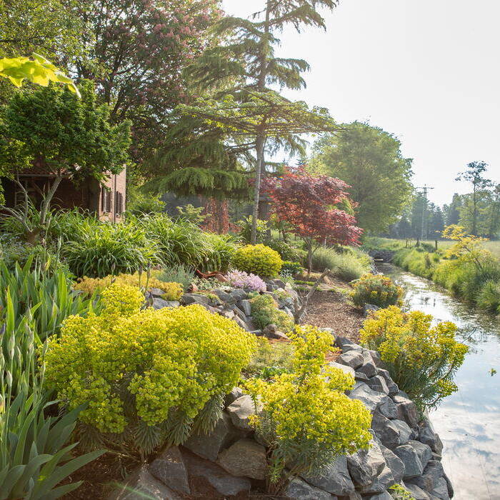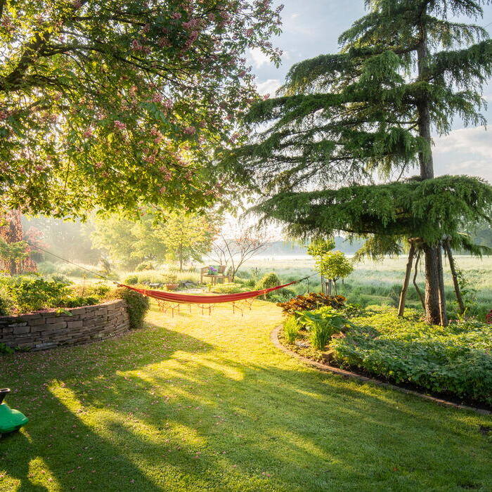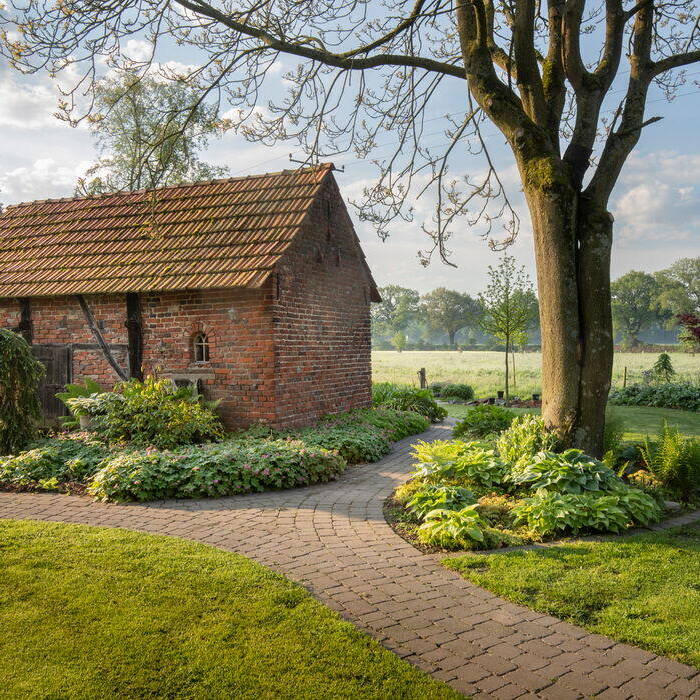 Ein in die Jahre gekommener Hof mit Haupthaus, umgebautem Viehstall und Backhaus wurde von seinen neuen Besitzern einer Generalsanierung unterzogen. Dabei nahmen die Eltern von drei Kindern auch den 3.000 m² großen Garten ins Visier, der von den Vorgängern vernachlässigt, ein stiefmütterliches Dasein fristete. Der mit der Planung und Umsetzung beauftragte Gärtner und Landschaftsarchitekt Daniel Paus ließ das Gelände mit einer Wiese, die ein starkes Gefälle zum flankierenden Bach aufwies, zunächst auf sich wirken. Im Anschluss ließ er einen Bagger anrücken, der Gehölze und wuchernde Brombeeren rodete, um es anschließend mit mehr als 300 Tonnen Oberboden aus der Ausschachtung eines befreundeten Unternehmens neu zu modellieren. Nicht der einzige nachhaltige Aspekt bei dem Projekt, das eine unkonventionelle und naturnahe Herangehensweise auszeichnet, die den dort lebenden Menschen, Tieren und Pflanzen zugutekommt.