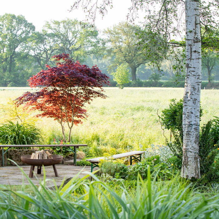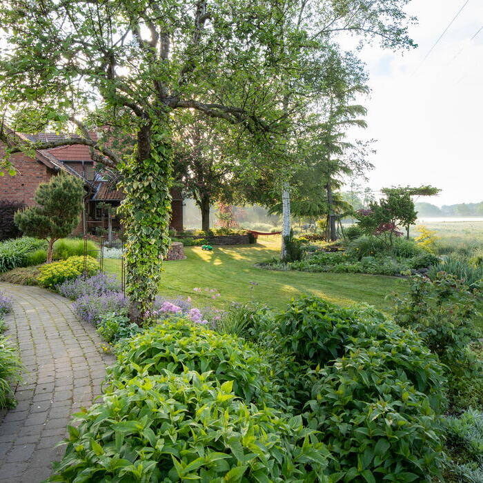 Mithilfe des Erdreichs wurde eine sich hebende und senkende Landschaft um den alten Baumbestand und das alte Backhaus geformt, die Bewegung und Lebendigkeit in das Areal bringt. An dieser Topografie orientieren sich die neuen Wege, die zu lauschigen Sitzplätzen führen. Eine prächtige, rotblühende Rosskastanie, eine Birke, ein kleiner Apfelbaum und eine große Esche erheben sich über die flankierenden Stauden und Beete. Eine Himalaya-Zeder, deren gleichmäßiges Wachstum durch andere Gehölze beeinträchtigt war, wurde mit großem Aufwand umgesetzt und gedeiht nun 100 Meter weiter. Ein besonderes Pflanzkonzept liegt dem Garten nicht zugrunde. Vielmehr verlieben sich die Gartenbesitzer regelmäßig in neue Pflanzen und suchen dann den richtigen Ort für diese aus. Egal an welcher Stelle man sich befindet, die Grenzen zwischen Garten und der umgebenden Landschaft verschmelzen, wodurch ein Gefühl der Weite entsteht.