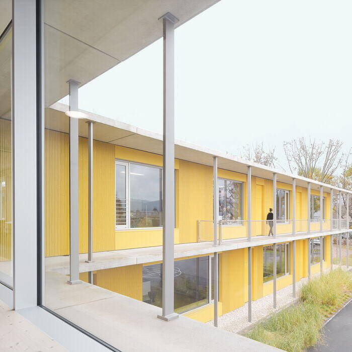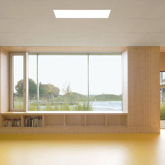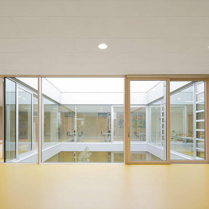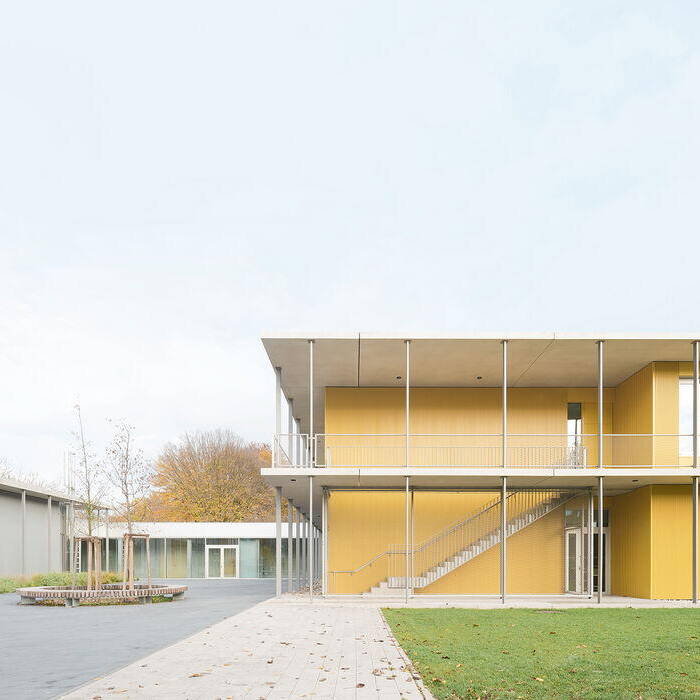 Rund 400 Schüler:innen finden Platz in der dreizügigen Grundschule und dem sonderpädagogischen Bildungs- und Beratungszentrum mit Förderklassen. Die freundlich gelben Fassaden der versetzt angeordneten Pavillons begrüßen die Lernenden schon von Weitem. Und auch wenn die Albert-Schweitzer-Grundschule und die Johann-Sebastian-Bach-Förderschule dem inklusiven Bildungskonzept nach gewissermaßen unter einem Dach vereint sind, haben die Architekten deren Räume in den einander ähnlichen Pavillons getrennt. Die so im Zusammenspiel mit dem Kulturzentrum entstehenden eigenen grünen Höfe bieten den jungen Menschen zusätzlich ein vielfältig nutzbares Freiraumangebot mit Spielgeräten.
