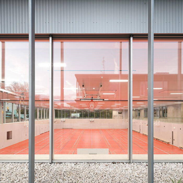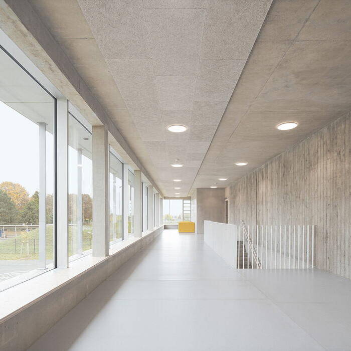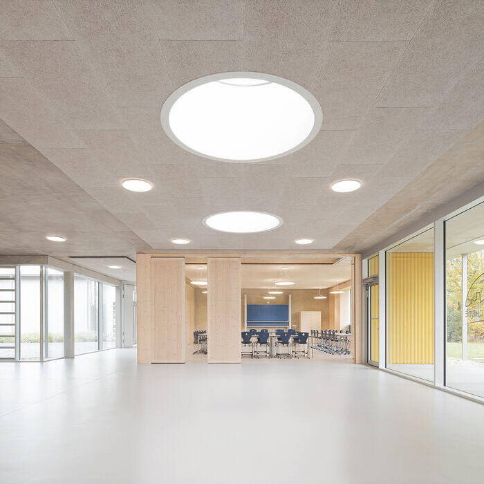 Im Inneren haben die Architekten vor allem auf Holz und Sichtbeton gesetzt und die rund 35 Klassenzimmer in Clustern in den zweigeschossigen Pavillons angeordnet. Große Pa-noramafenster schaffen eine lichte Umgebung. Auch in einigen breiten Gängen findet sich bei den Bodenbelägen aus Kautschuk einer ortsansässigen Firma das Gelb der Fassaden wider. Die neue Sporthalle bildet nicht nur den baulichen Abschluss nach Norden, sondern wertet auch den Eingangsbereich des Kulturzentrums auf.