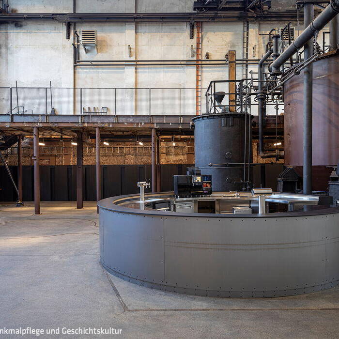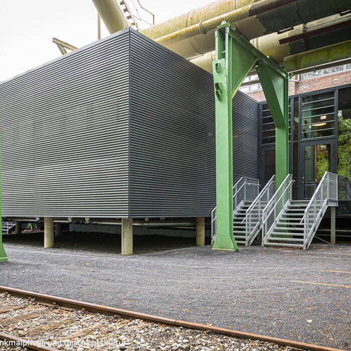 Die Kokerei Hansa ging 1928 in Betrieb. Das Salz, das als Nebenprodukt bei der Verkokung von Steinkohle entsteht, setzte dem Mauerwerk und den technischen Anlagen des Salzlagers und der Salzfabrik im jahrzehntelangen Betrieb zu. Nachdem die Produktion 1992 eingestellt worden war, stand die Halle viele Jahre leer. Der Umbau des Gebäudekomplexes nahm schließlich vor zehn Jahren Fahrt auf und wurde im Frühjahr 2024 vollendet. Nun fungiert das Gebäude als imposante 49 Meter lange, 23 Meter breite und neun Meter hohe multifunktionale Eventlocation mit modernster technischer Ausstattung und aufgearbeiteten Teilen des einstigen Maschinenparks – wie etwa die Eindicker in der Salzfabrik – als Zeugen der Vergangenheit. Ziel war es, die Raumwirkung der historischen Gebäude zu erhalten, was durch einen angedockten Verteilerflur an der östlichen Rückseite der Halle gelang, der beide Gebäudekomplexe verbindet. Dieser ermöglichte zudem, die erforderlichen Sozialräume in neuen Räumlichkeiten zu intergieren. Sanitärräume, Künstlergarderobe, Technik und Lagerstätten sind nun in drei Einzelpavillons untergebracht, die auf einer aufgeständerten Konstruktion stehen, die wiederum auf frühere Gleise aufgesetzt wurden. Vom Flur aus erreichen die Besucher:innen eine großzügige Lounge, die mit ihren bodentiefen Fenstern den Industriewald und den einstigen Industrieort unmittelbar erlebbar machen. „Für uns ergaben sich im Laufe der Sanierungsarbeiten ständig neue Herausforderungen. Einen historischen Industriekomplex in einen Veranstaltungsort zu transformieren, der den Anforderungen an Brandschutz, Wärmeschutz, Raumluftqualität und Akustik entspricht und gleichzeitig seine Raumwirkung behält, war so spannend wie herausfordernd“, resümiert Wojciech Trompeta, Geschäftsführer von Böll Architekten.
