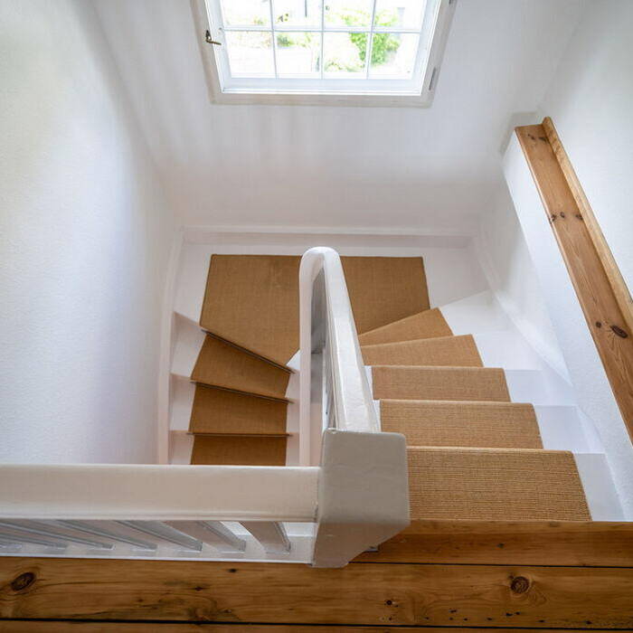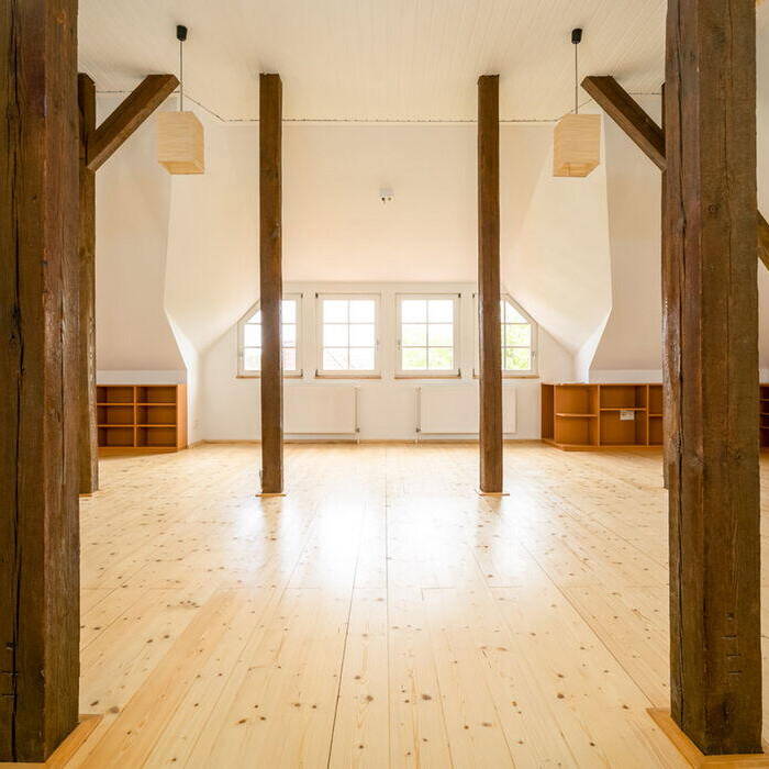 Zur Entwurfsidee gehörte unter anderem, jeweils unterschiedliche Wohnungen über zwei Hauseingänge zu erschließen. So wird nun der Wohnbereich im Erdgeschoss direkt vom Vordereingang erreicht. Zur Souterrainwohnung, beziehungsweise der im ersten und zweiten Obergeschoss verortenen Wohnung gelangt man über das Treppenhaus des Seiteneingangs an der Westseite. Zusätzlich bestehen verschiedene Gestaltungsmöglichkeiten: Zum Beispiel kann im Erdgeschoss ein größerer Raum in zwei kleine geteilt werden oder im Dachgeschoss das Studio in zwei Räume mit einem Bad verwandelt werden. Sobald im Treppenhaus zwei Treppenläufe zusammengefasst werden und der ehemalige Zugang vom Erdgeschossinneren wieder geöffnet wird, erfolgt eine direkte Verbindung vom Erdgeschoss in alle Bereiche. Wahlweise ist in der Villa nun Platz für eine große Familie/Lebensgemeinschaft oder es sind bis zu drei separate Wohnbereiche möglich. Die gegenwärtig größte Einheit bildet die Maisonette-Dachgeschosswohnung mit ca. 160 m². Sie erstreckt sich über drei bis vier großzügige und helle Schlafzimmer, ein modernes Badezimmer, eine Wohnküche, einen seeseitigen Balkon und einen lichtdurchfluteten Wohnbereich im Dachgeschoss. Die aktuell vermietete Erdgeschosswohnung verfügt mit ca. 104 m² über drei bis vier Zimmer mit historischer Bausubstanz sowie eine separate Wohnküche und über eine geschützte Loggia mit Blick auf den See. Im Souterrain befindet sich zur Seeseite ein ebenerdiger Zwei- bis Dreizimmer-Gästebereich mit ca. 56 m² Wohnfläche und einer Gartenterrasse. Dass nun möglich ist, in dem Haus auch nur Teileinheiten zu vermieten, schafft zusätzlichen wirtschaftlichen Spielraum, wenn beispielsweise Kinder zum Studium ausziehen. Weiterhin besteht auch ein großes Platzangebot für Homeoffice oder gewerbliche Praxis-/Büronutzungen. „Die Besonderheit dieses Baudenkmals liegt in der Kombinierbarkeit der Grundrisse mit den verschiedenen Gebäudeeingängen. Dabei besitzen die Grundrisse selbst eine hohe Anpassungsfähigkeit an verschiedene Anforderungen“, erklärt Architekt Christian Peters.
