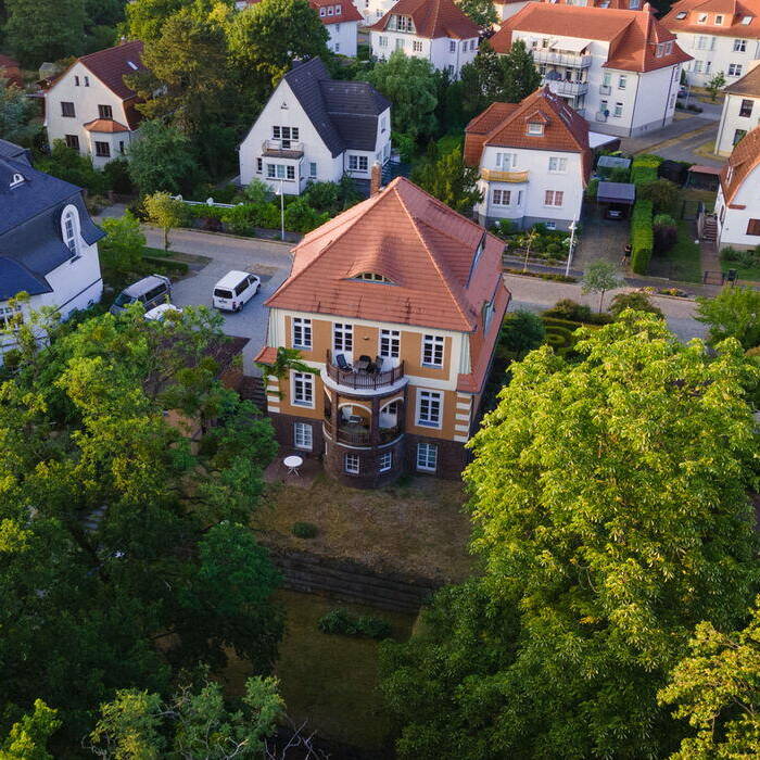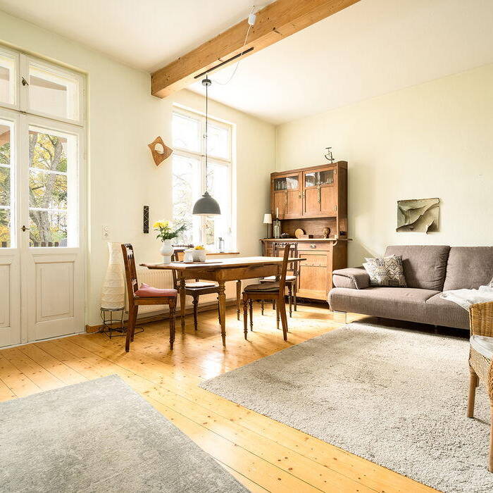 Eine viergeschossige Villa am Glambecker See, in der früheren Residenzstadt Neustrelitz und eine knappe Stunde von Berlin entfernt, präsentiert sich nach einem Umbau als Lebens-Phasen-Haus. So nannte der planende Architekt und Enkel des Erbauers, Christian Peters, das 1928 errichtete Gebäude, das sich ohne großen baulichen Aufwand flexibel auf die Raumbedürfnisse seiner Bewohner:innen anpassen lässt. Aufgrund einer modularen Grundrissgestaltung sind die Größen der drei Wohnbereiche im großzügigen, einstigen Zweifamilienhaus an die jeweiligen Lebensphasen modifizierbar.