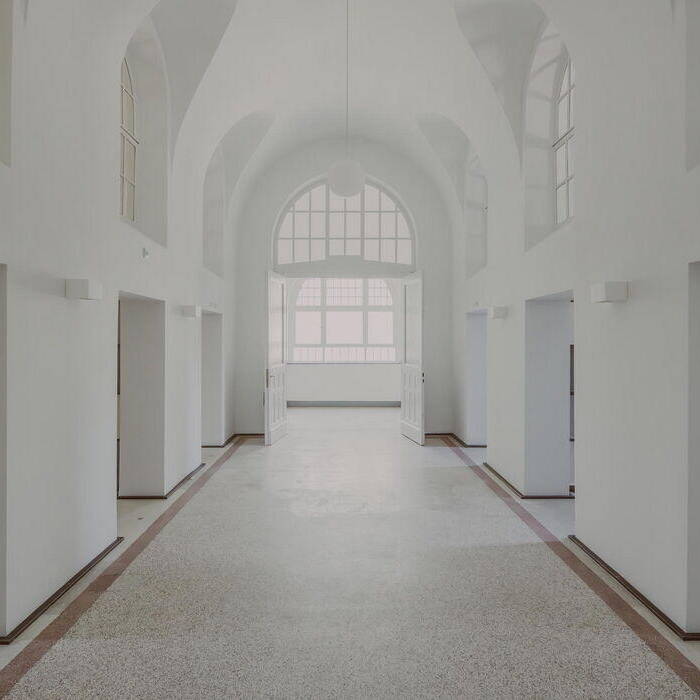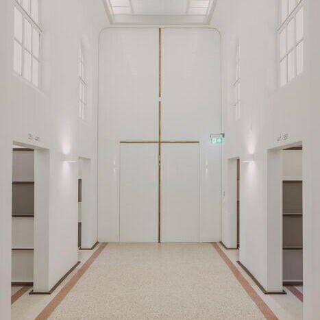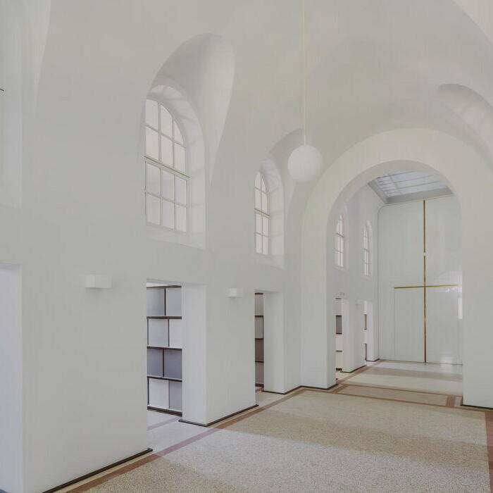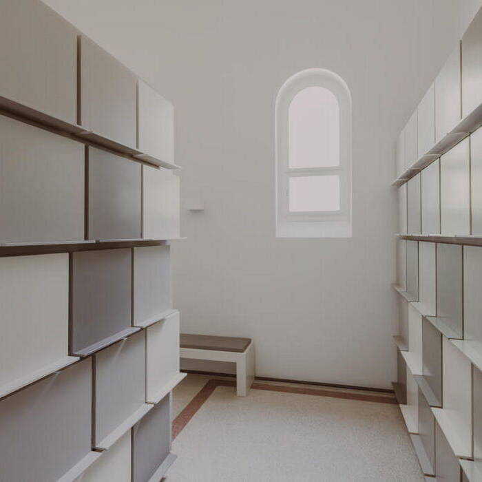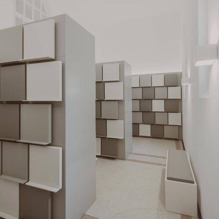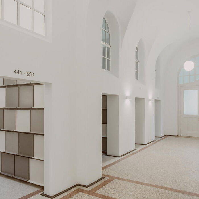 Die Gebäudestruktur des Bereiches, in dem die oberirdische Grabstätte verortet ist, erinnert an einen Sakralbau. Das „Mittelschiff” mit seiner Gewölbedecke wird beidseitig von einem seitlichen „Schiff” umfasst. Zum Konzept von Pfeiffer Architektur für den Umbau gehörte, die Trennwände der vormaligen Zellen und Abschiedsräume teilweise abzubrechen, so dass größere Räume entstanden sind. In diesen sind kubische Raumelemente angeordnet. Sie nehmen insgesamt 550 Urnenkammern auf, die horizontal und versetzt angeordnet sind. Deren Verschlussplatten wurden wechselnd in Grautönen gestaltet, was eine Lebendigkeit sowie ein Spiel mit Licht, Reflektion und Schatten erzeugt. Auf schlichten Borden können LED-Kerzen oder Blumen platziert werden. Vom „Mittelschiff“ aus eröffnet sich der Blick auf die einzelnen Räume: Die wie ein Mosaik anmutende Anordnung der quadratischen Grabplatten findet in den innenliegenden Fenstern der Durchgänge, die zu deren historischer Symmetrie zurückgeführt wurden, ihre Entsprechung. Weg von einem einfachen Durchgang, präsentiert sich der mittlere Bereich des Kolumbariums als Raum, der nicht bloß die beiden Seitenschiffe verbindet, sondern den gesamten Raum einbezieht. Dieser wurde zu einer Halle, durch den Besucher:innen wandeln können. Der vorhandene Terrazzoboden wurde restauriert und aufgearbeitet. Ihn, das Portal und das Oberlichtfeld in der Decke dieses Bereichs eint ein minimalistisches, grafisches Design. Das Oberlichtfeld wurde neu in Szene gesetzt und zu einer LED-basierten, dimmbaren, homogenen Lichtfläche umgestaltet. Stimmig dazu wurde das Portal ausgeführt, das das Kolumbarium räumlich von dem Bereich mit den Abschiedsräumen und Kühlzellen trennt. Die dem Kolumbarium zugewandte Oberfläche ist aus lackiertem Glas ausgeführt. Die Türgriffe bestehen aus patiniertem Messing und bilden in ihrer Anordnung ein Kreuz. Beim Umbau der Kapelle wurde auch auf Barrierefreiheit geachtet – und zwar durch den Bau einer rollstuhlgerechten Rampe.